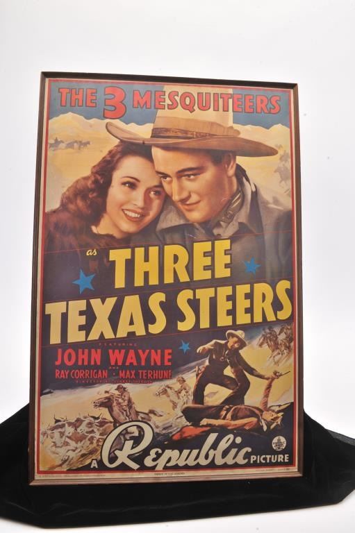Lot of five vintage John Wayne framed prints. The lot includes a framed reproduction movie poster of “THREE TEXAS STEERS” starring John Wayne and four framed portrait prints of the Duke throughout his career, includingan iconic portrait of him with a large loop Winchester 1892 carbine. All five pieces are in good condition with one piece having suffered a crack to the glass front. Est.: $125-$250.