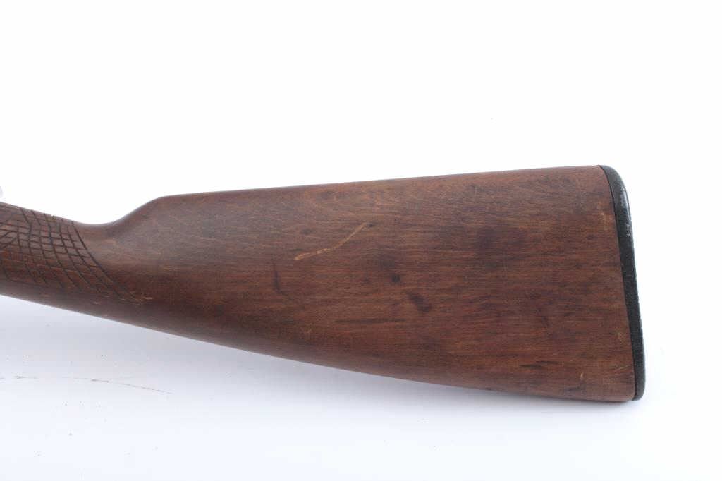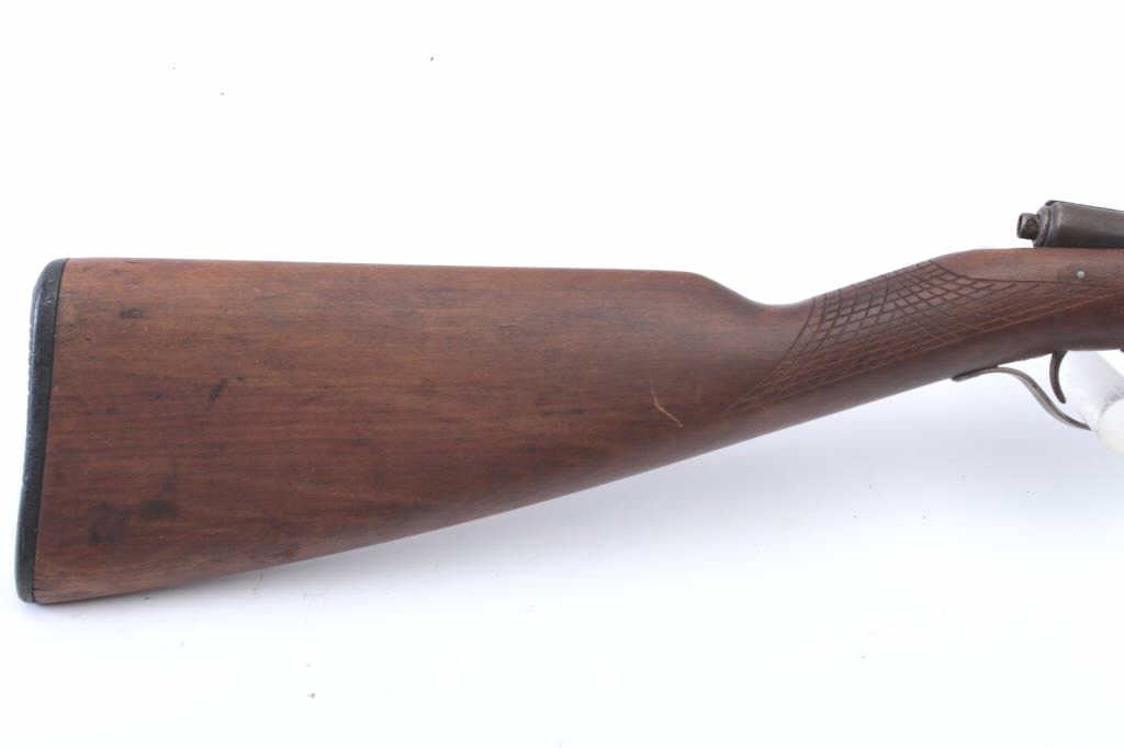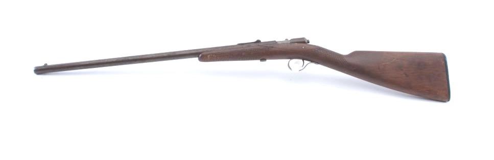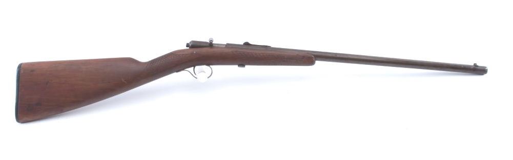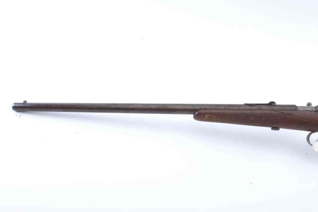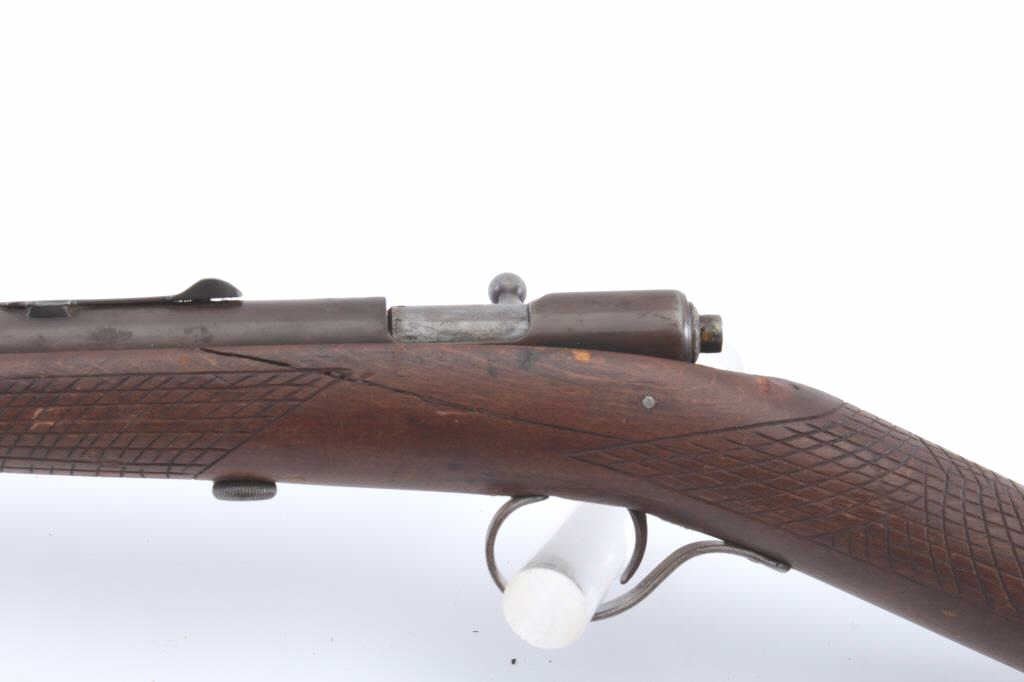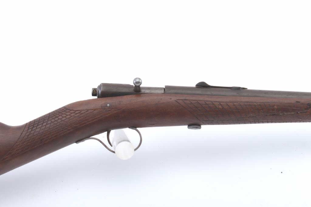 Winchester Model 04 single shot rifle, .22 Short, Long or Extra Long caliber, Serial #NSNV. The rifle is in fair overall condition with a 21” round barrel. The metal surfaces have gone to brown patina with areplacement rear sight. The smooth stock has been crudely hand checkered and there are a crack along the left side of the action. The bore is fair, the action functions and the markings are legible. Est.: $90-$180.(C+R).