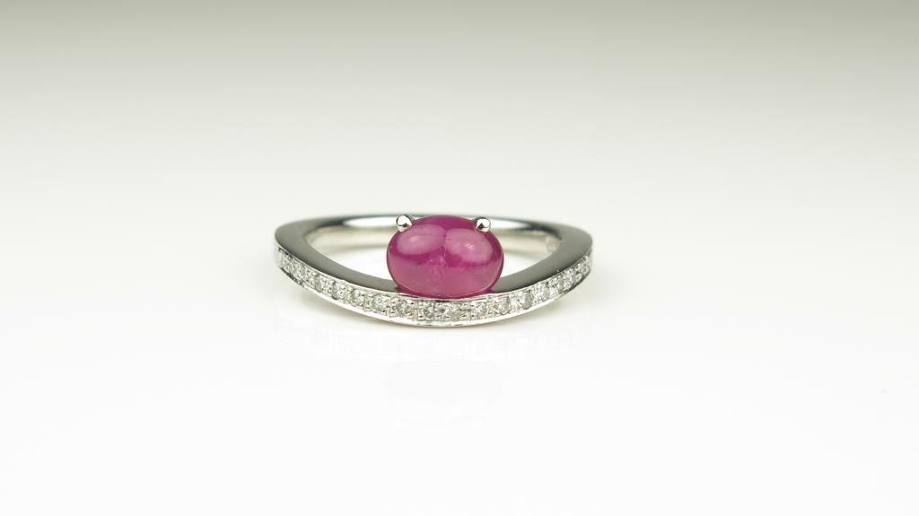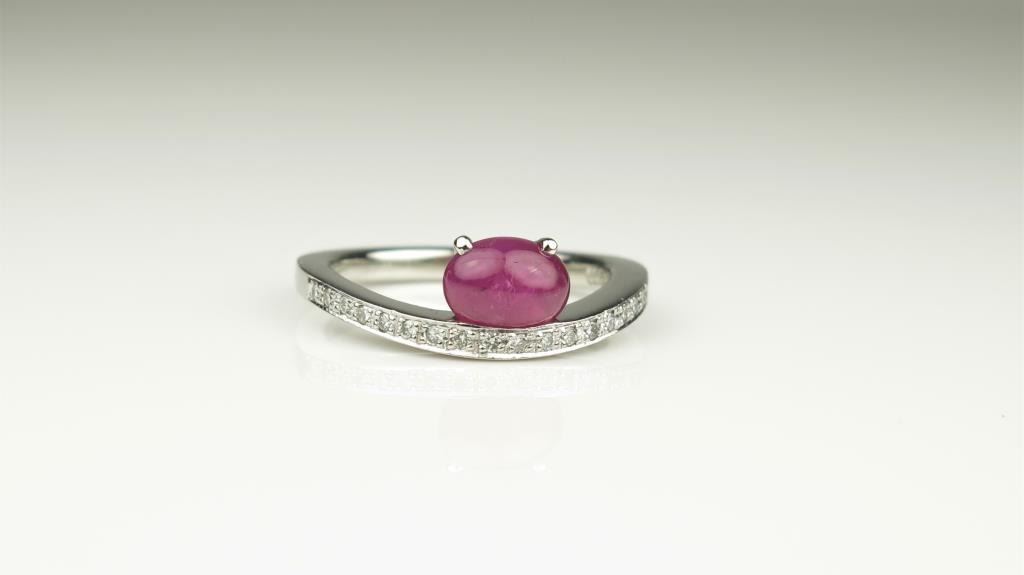 Platinum Burmese Ruby and Diamond Ring featuring an approx. 1.20 carat oval cabochon Ruby accented with 20 ‘IDEAL’ Diamonds with F-G colors and VS clarity set in a Platinum setting. Retail $2,000-$3,000 Estimates$1,200-$1,800