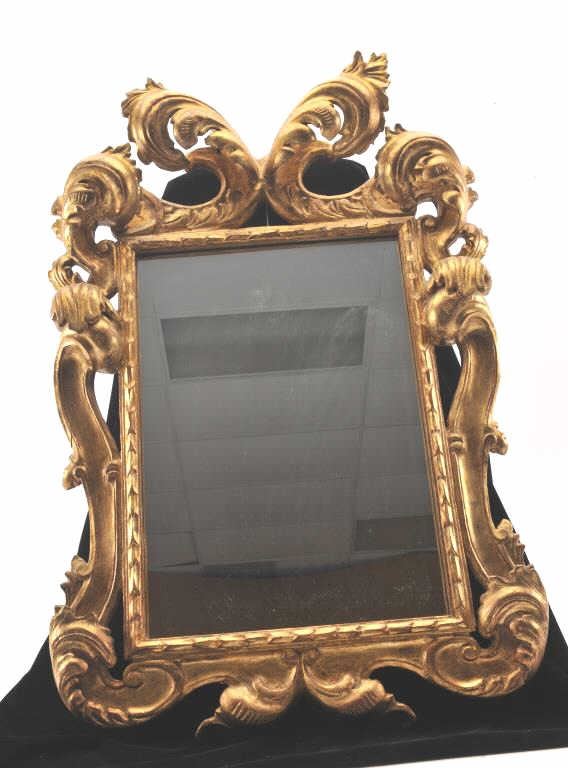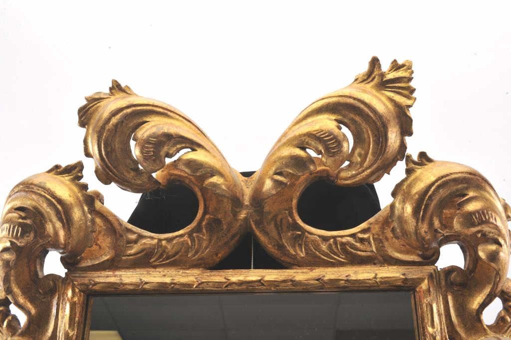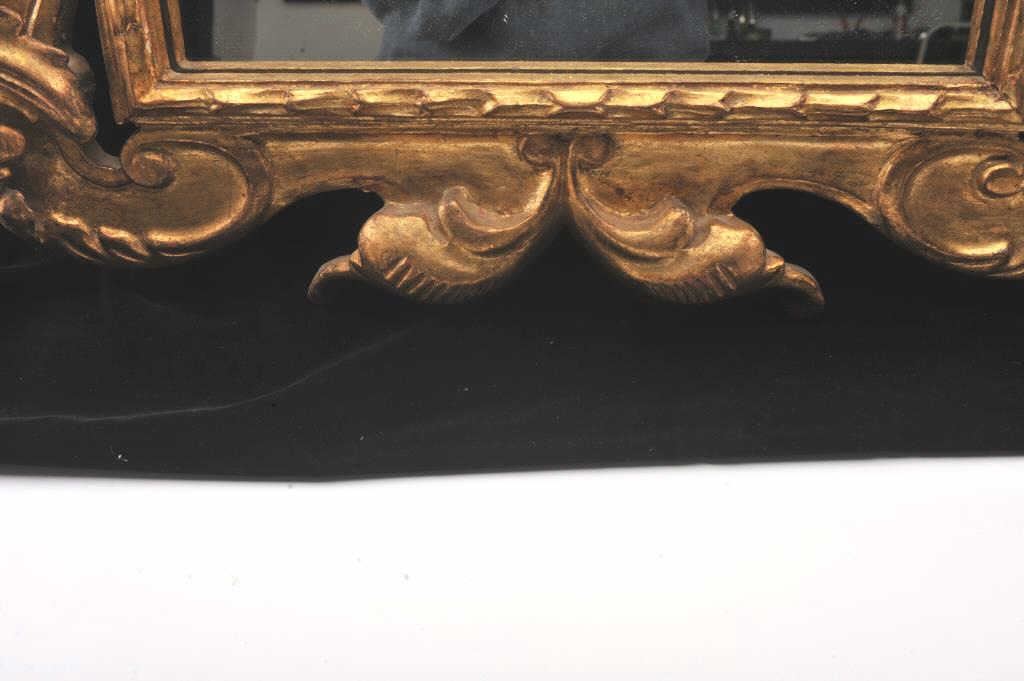Large decorative gesso on wood gold mirror. The mirror is 36” x 24” including the elaborate gold frame. The mirror is not marked, but is heavy and of older construction. Est.: $50-$100.