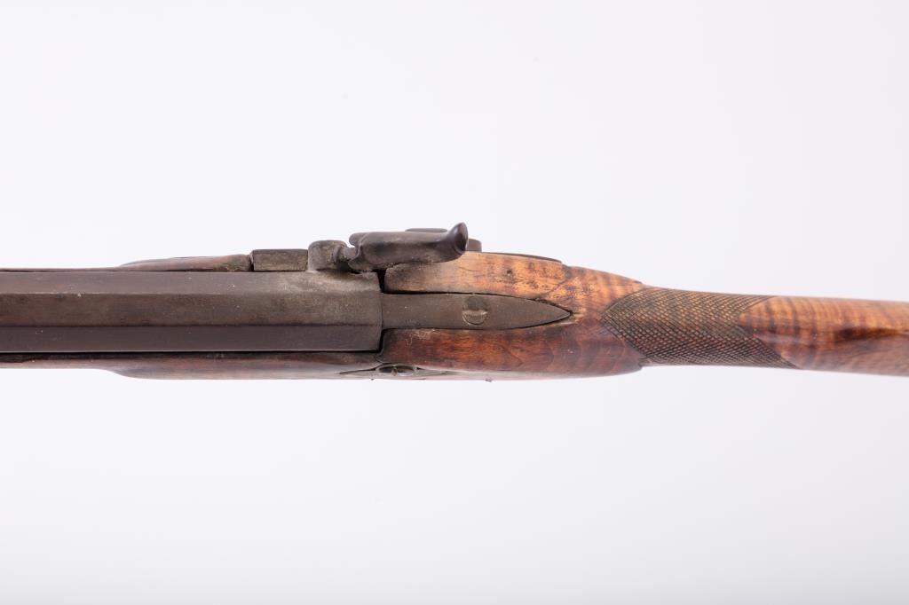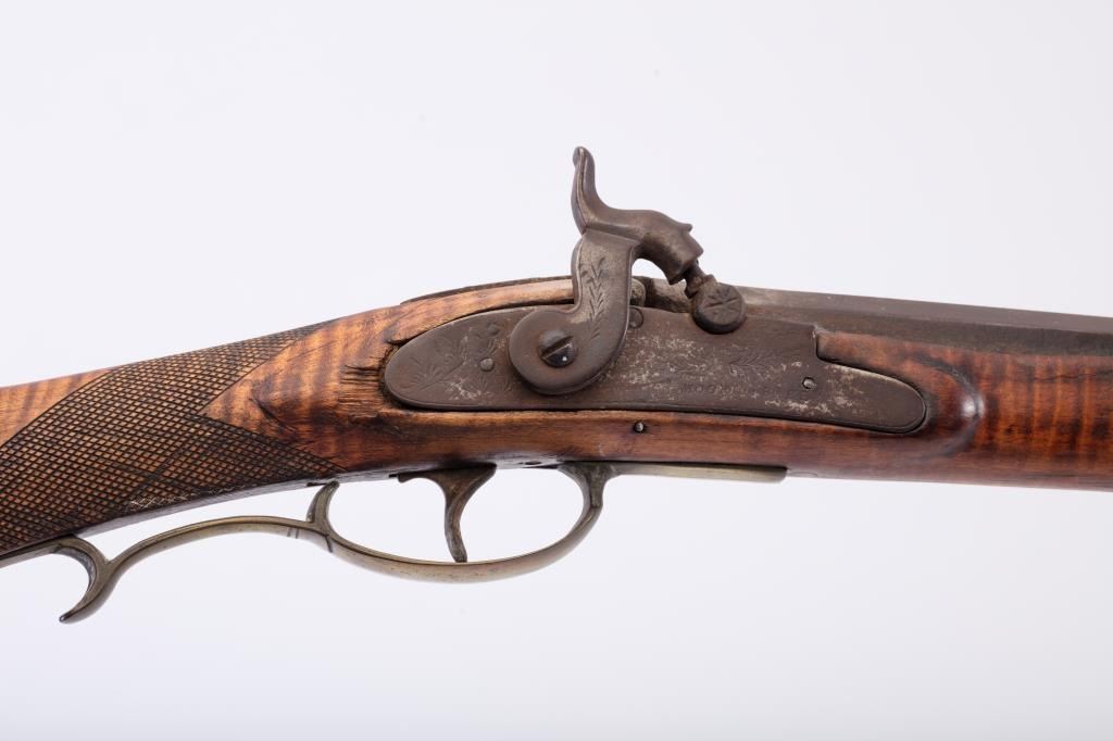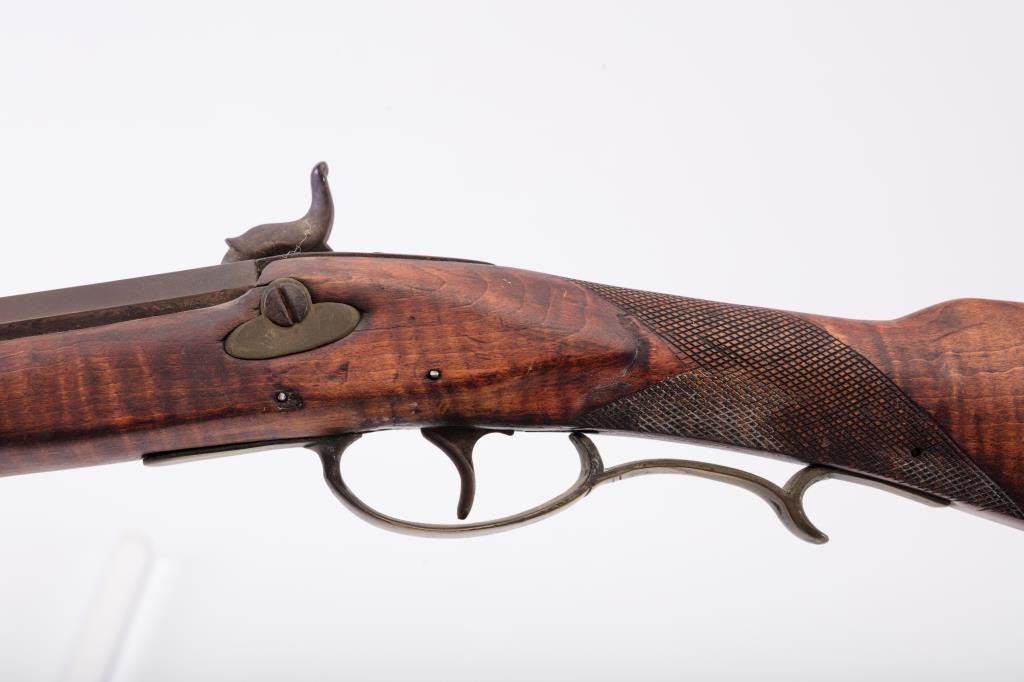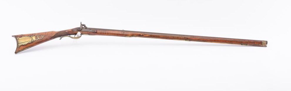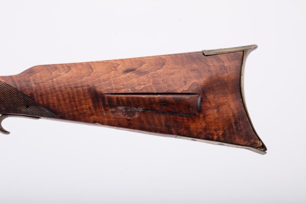 Full stock Percussion Kentucky rifled with pierced patch box marked “R. Sterling, Newburg” in Cumberland County (About 50 miles from Philadelphia). Measures 59” overall with a 42” barrel of medium weight inapproximately .46 caliber smoothbore (Bored Out). The barrel is full octagon with V notch and blade front sight. The wood has been lightly sanded ad refreshed with small repair to toe of the butt. The action is workingand a single trigger. Also old repair to area behind hammer regluing original piece and losses of wood behind hammer from firing. From an old Northern California collection. Est.: $1000-$2000