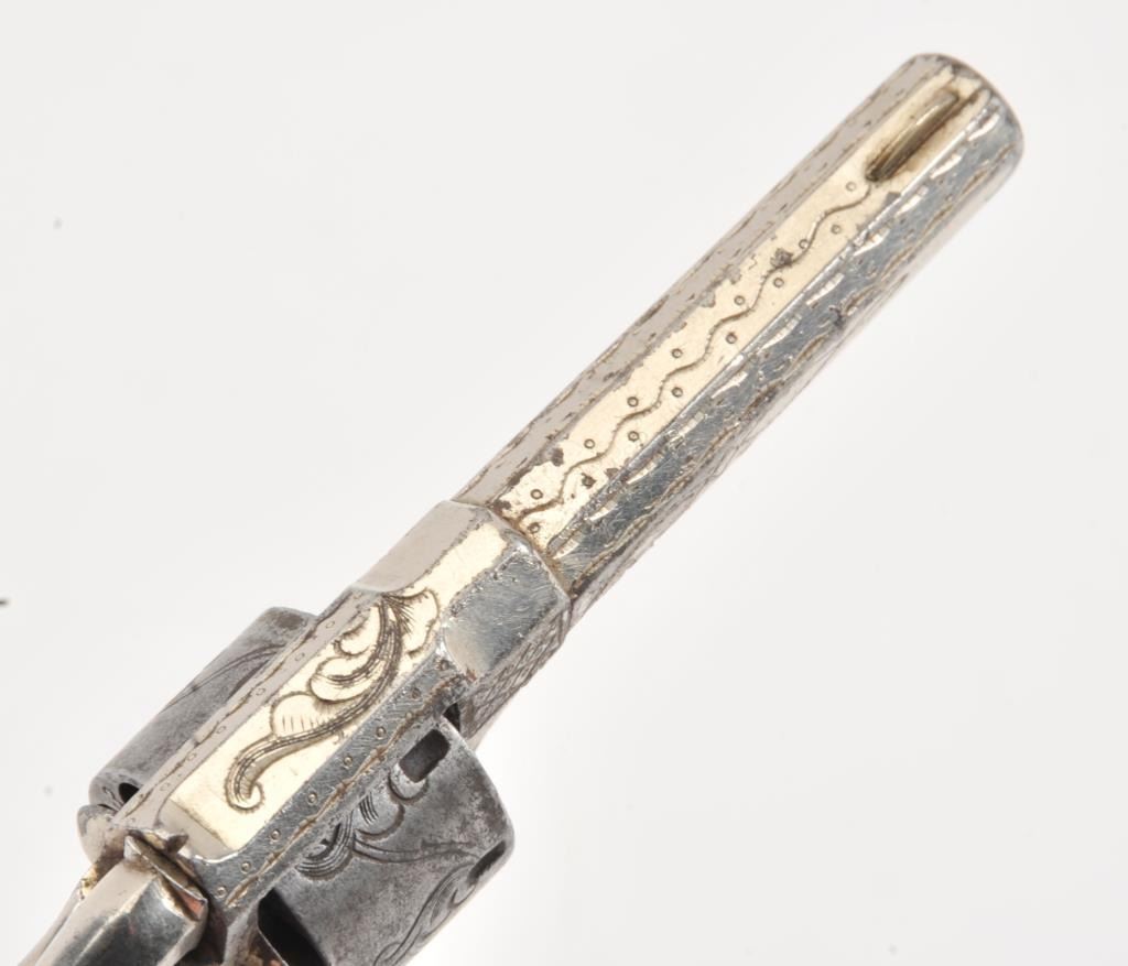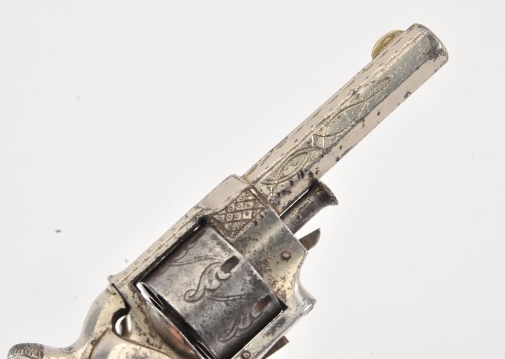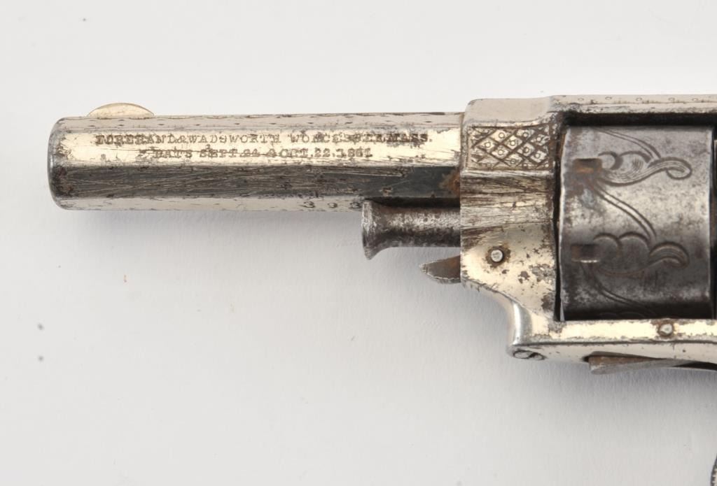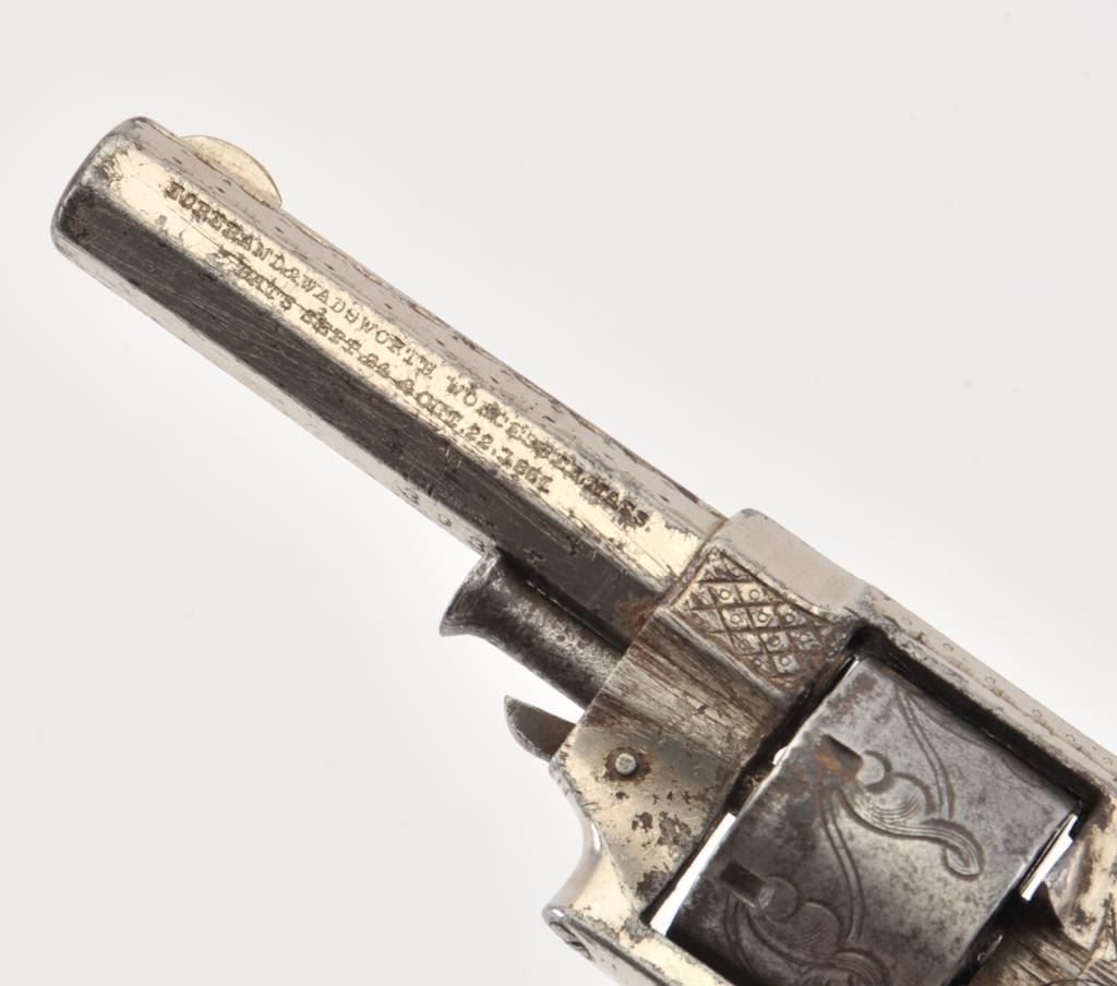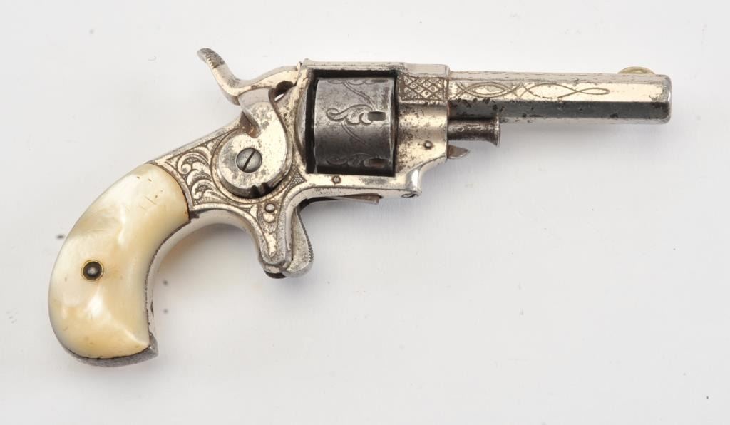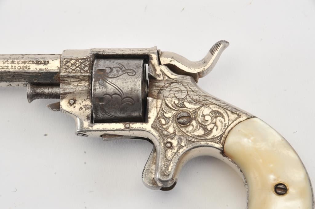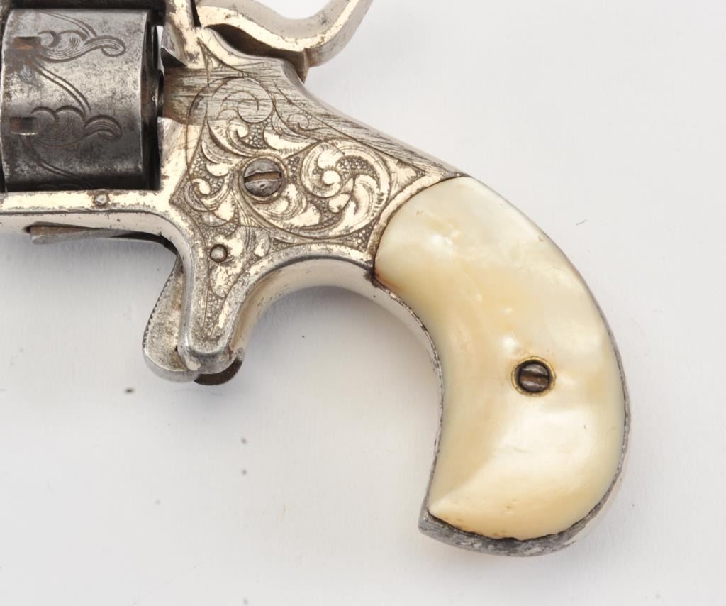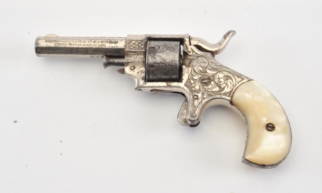 Forehand and Wadsworth .22 caliber side hammer 7 shot .22 caliber revolver fully New York style engraved with pearl grips and silver plated finish. Last patent date is 1861. 40%-60% original finish remains withdrifting at the edges and on the cylinder. Minor erosion and pitting where finish has lifted. Good markings on the side of the barrel. The grips are very good with deep and colorful luster. (Antique) Est.: $350-$700