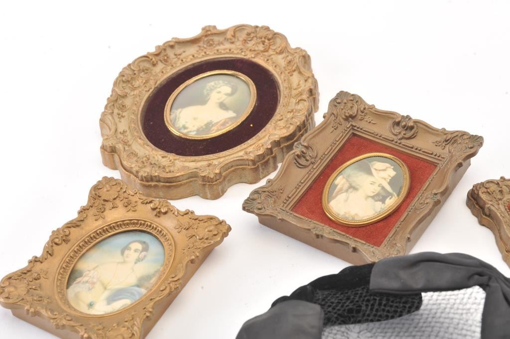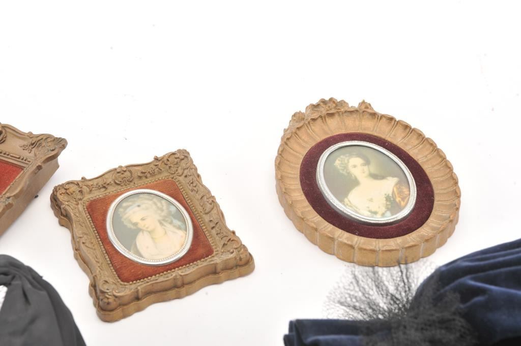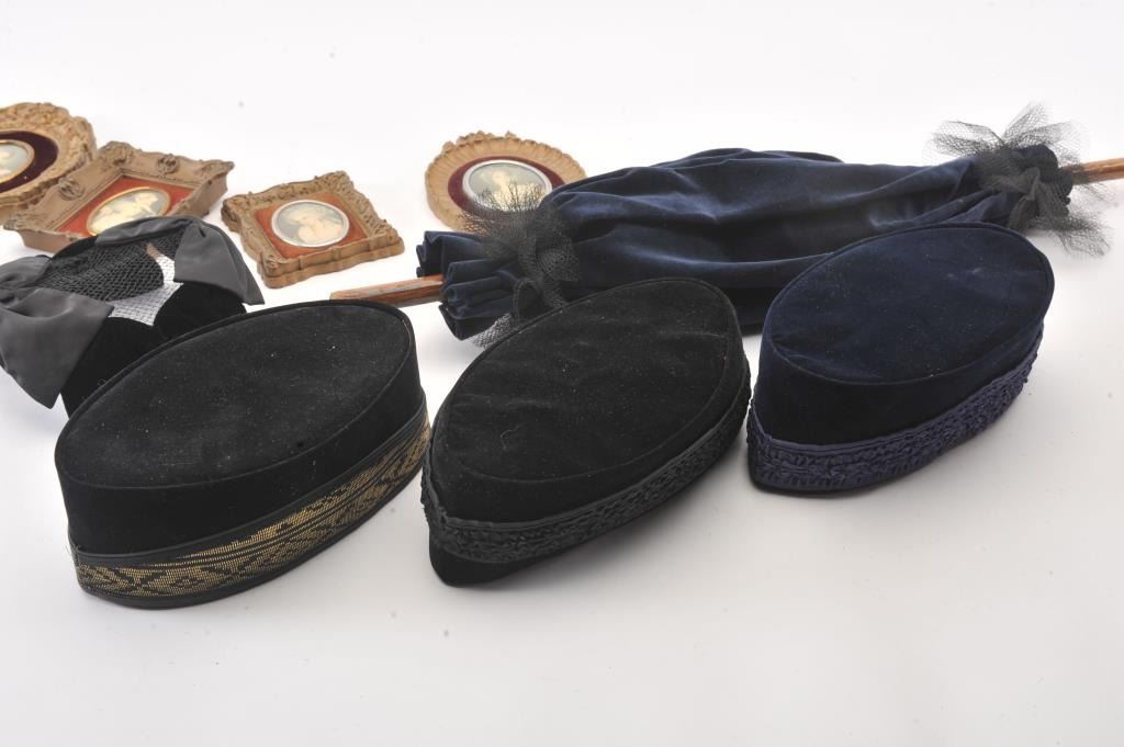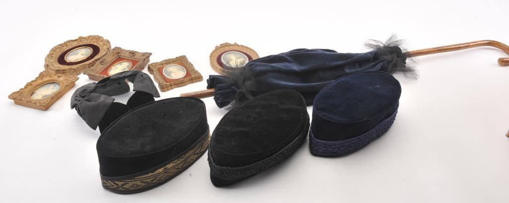 Antique lot of photos, small mirror, ladies hats, parasol and more. Est;$100-300