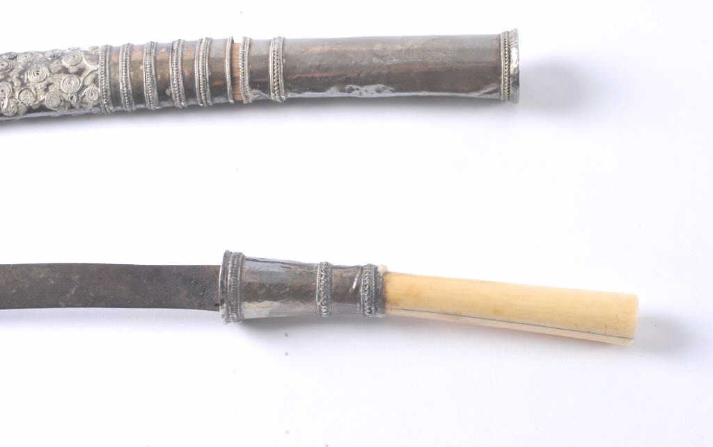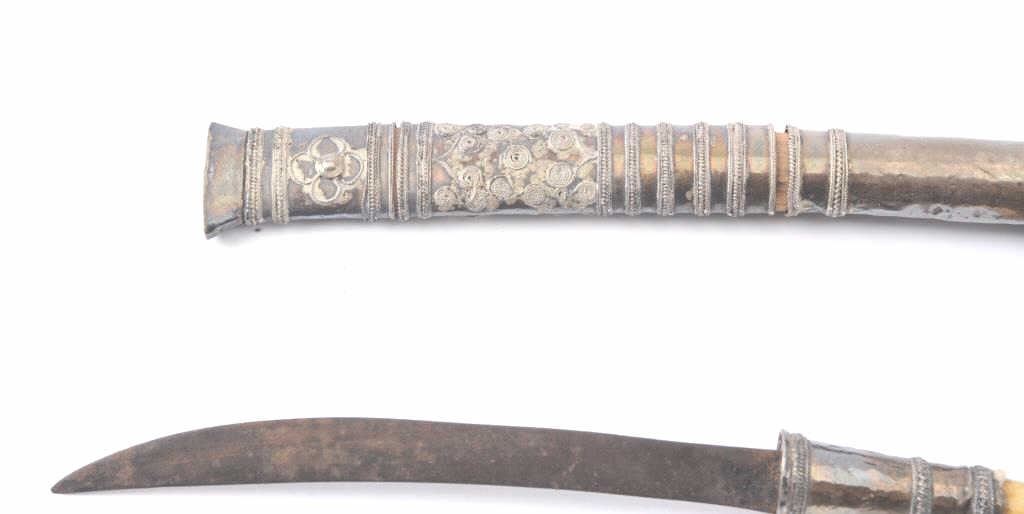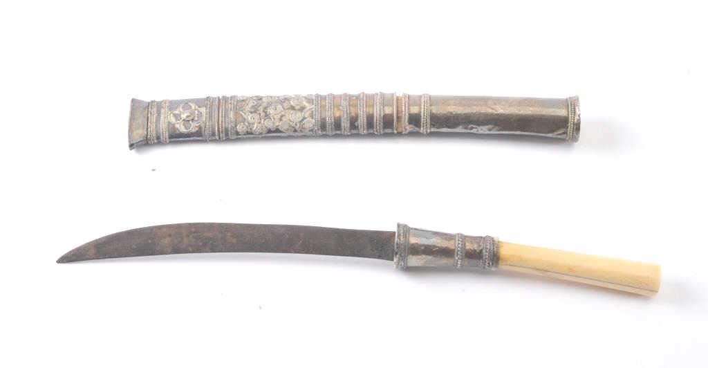 An antique small Burmese dha with silver mounts and ivory hilt. Fine quality. 13 inches overall. 5 3/4 inch blade. Silver in good condition. Blade has some old rust. Est:$125-175