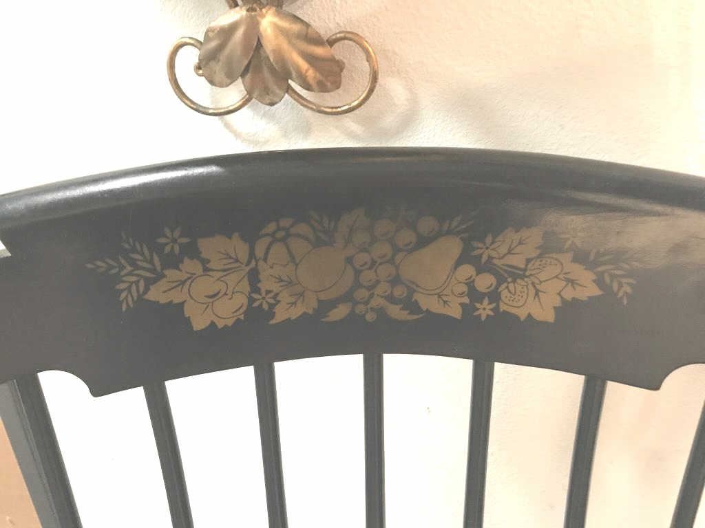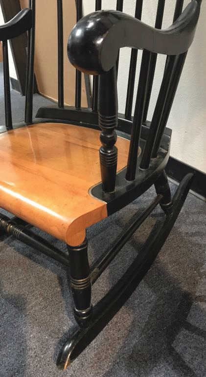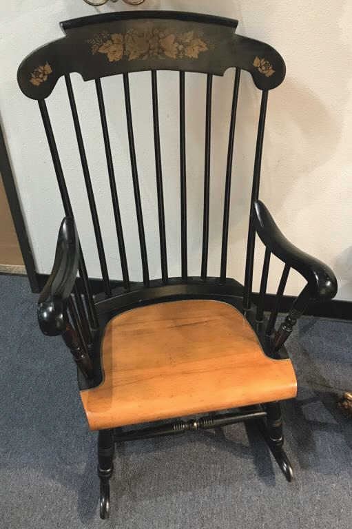Attractive vintage-style wood rocking chair; stenciled head support, two tone finish; approximately 41” in height, 25” wide and 28” deep. Est.: $125-$250.