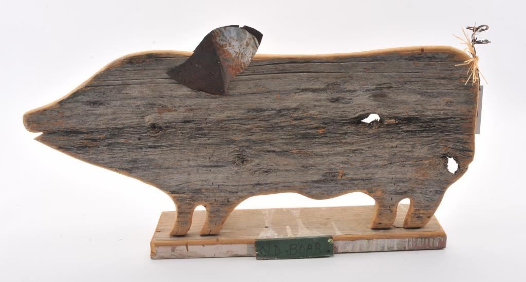 Folk Art wooden sign of pig with metal ears on wood base and titled “Old Boar”; approximately 19” in height, 35” wide and 6” deep. Est.: $50-$100.