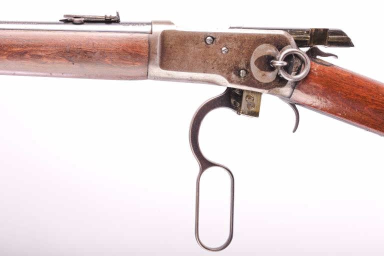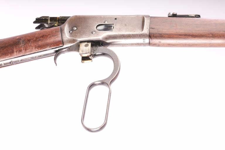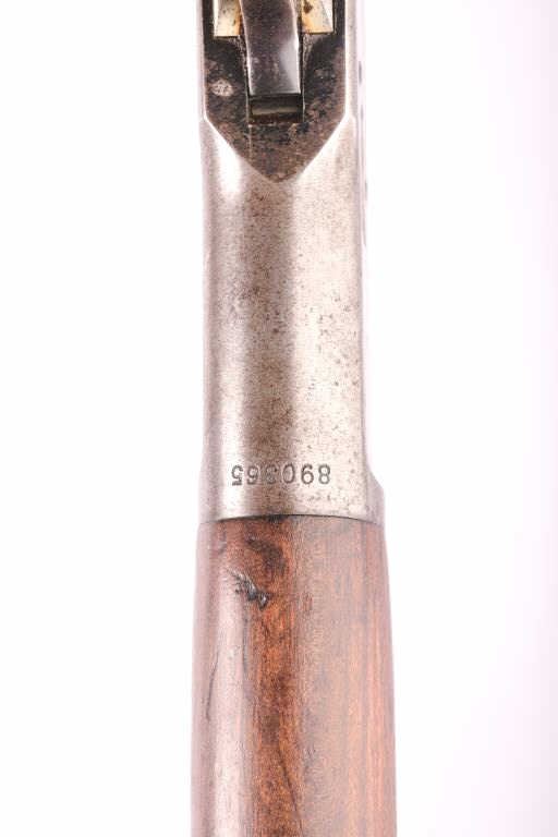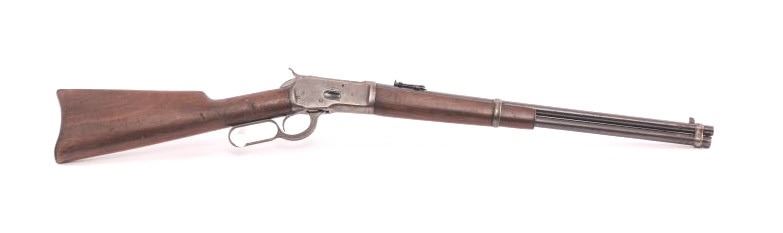 Winchester Model 92 lever action SRC, .44 W.C.F. caliber, 20” barrel, blued finish, wood stocks, S/N 890365; overall good to very good condition with majority of original blued finish remaining on barrel and loadingtube, grey/brown patina on receiver mixed with traces of original blued finish in protected areas, crisp action, sharp markings, good bore, and good wood stocks with butt stock showing scattered mars andscratches from carry and storage. (C&R). Est.: $1400-2800