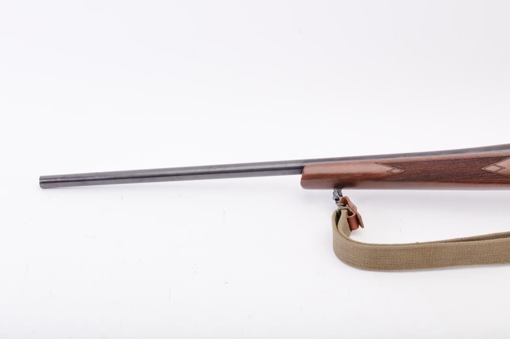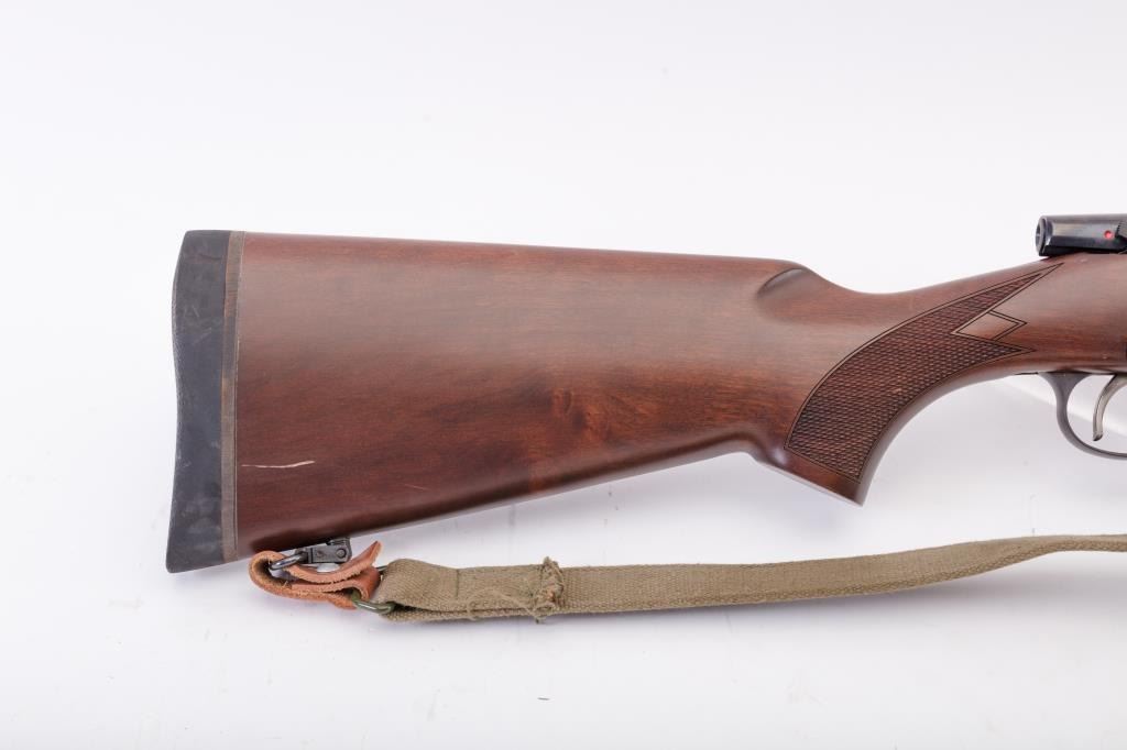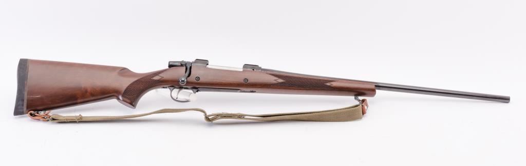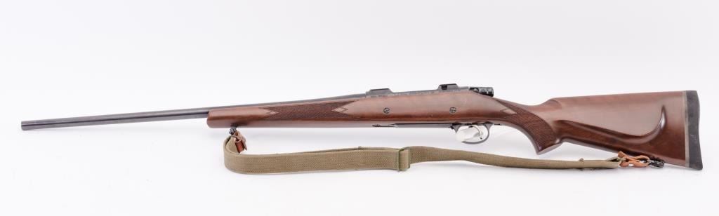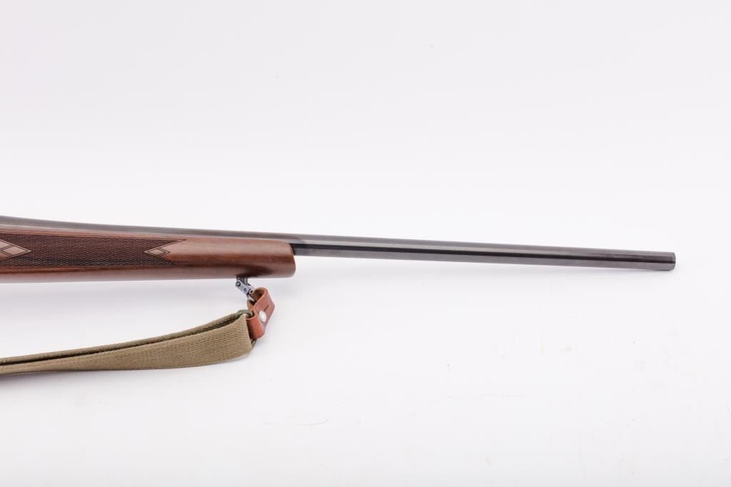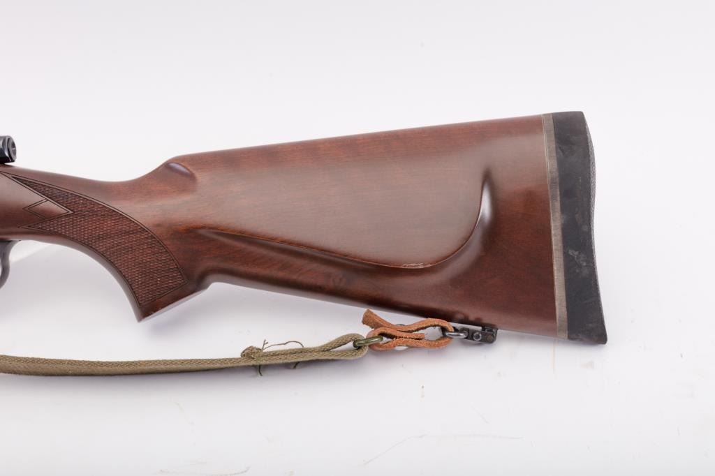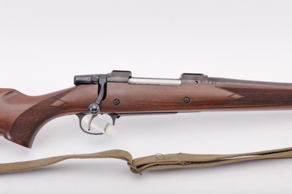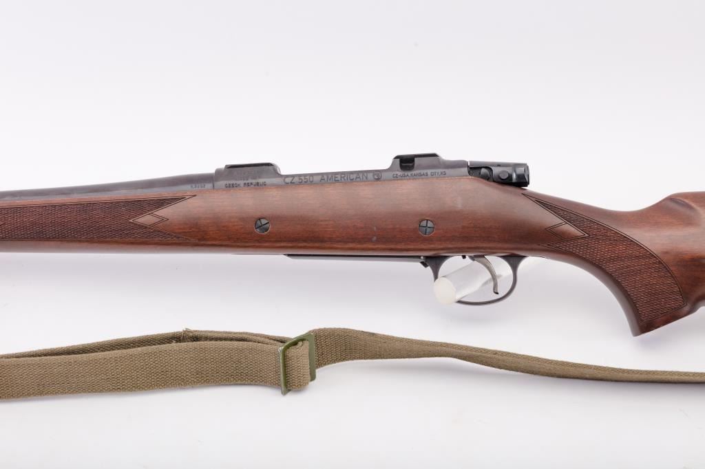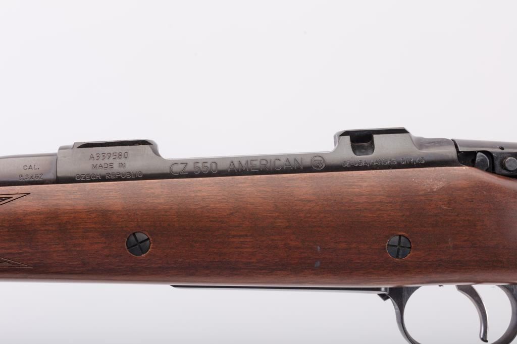 CZ Model 550 Medium bolt action rifle, 9.3 x 62 caliber, Serial #A111321. The rifle is in fine overall condition with a 20” barrel. The rifle retains nearly all of the factory blue finish with just handling marks noted.The receiver is import marked and features integral scope mounts. The full length Mannlicher checkered wood stock is in very good condition with fine figure in the butt stock, small mars and scratches. TheEuropean hogback style butt ends with a ventilated rubber recoil pad. The bore is good, the action is crisp and markings are sharp on this scarcely seen Mannlicher stocked CZ in the venerable 9.3 x 62chambering. Est.: $700-$1,400. (Modern).