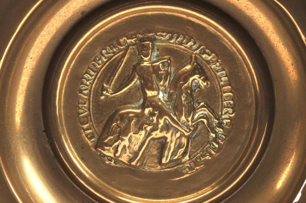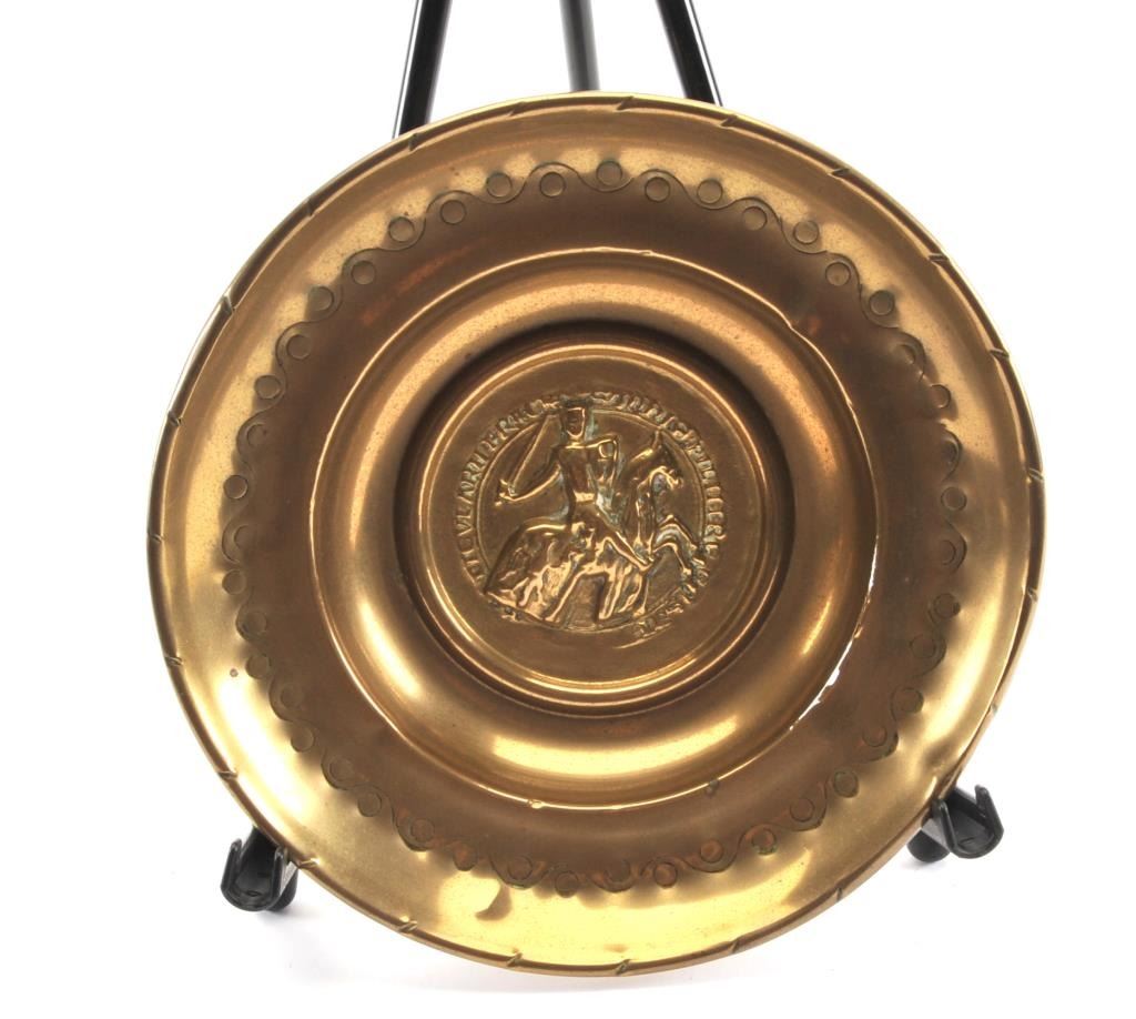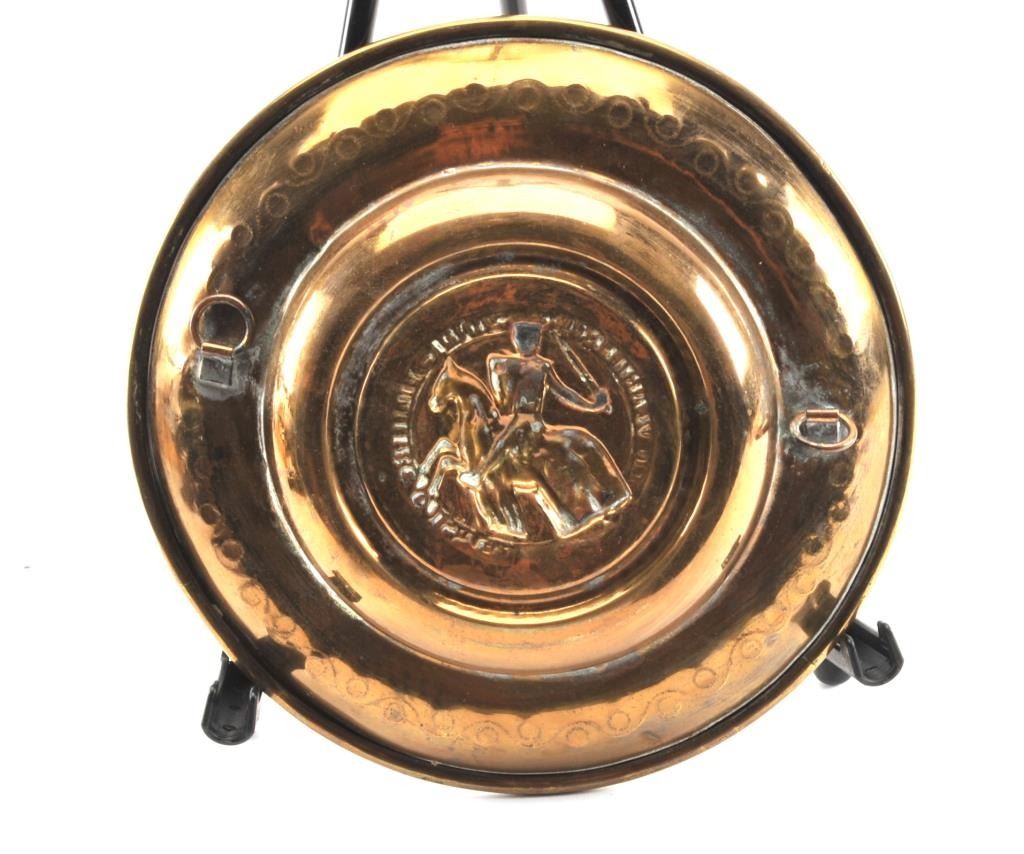 Alms bowl made of hammered brass. 200-500 plus years old showing hangers that were soldered om later to hang in church. Brought from Europe after church destroyed in WWII. Looks to be early polish crest with knight on horseback. Est.: $750-1500