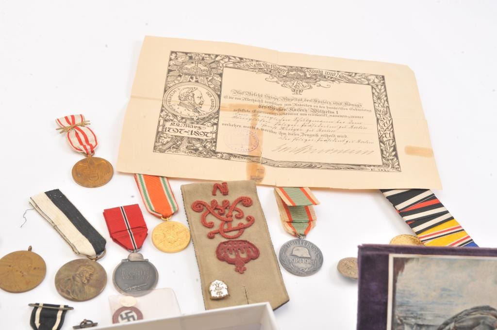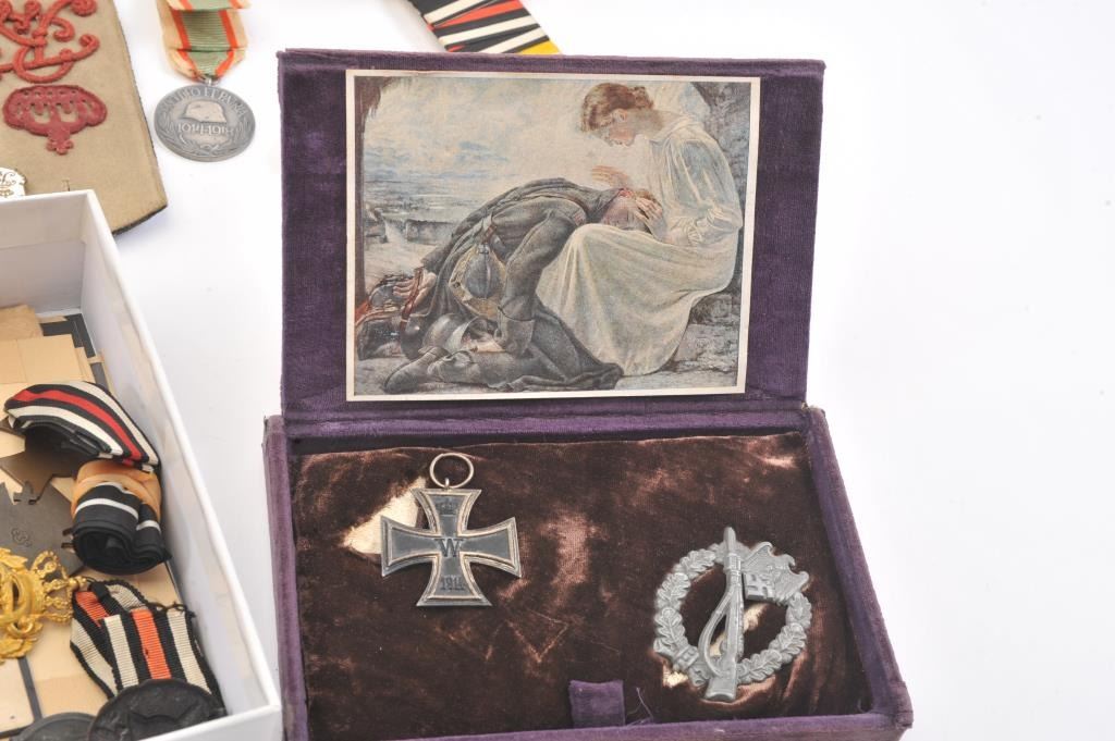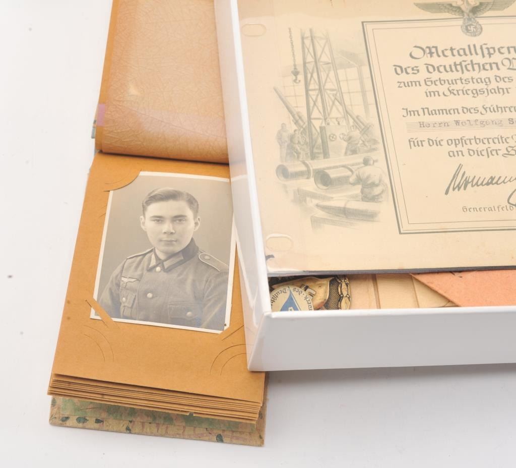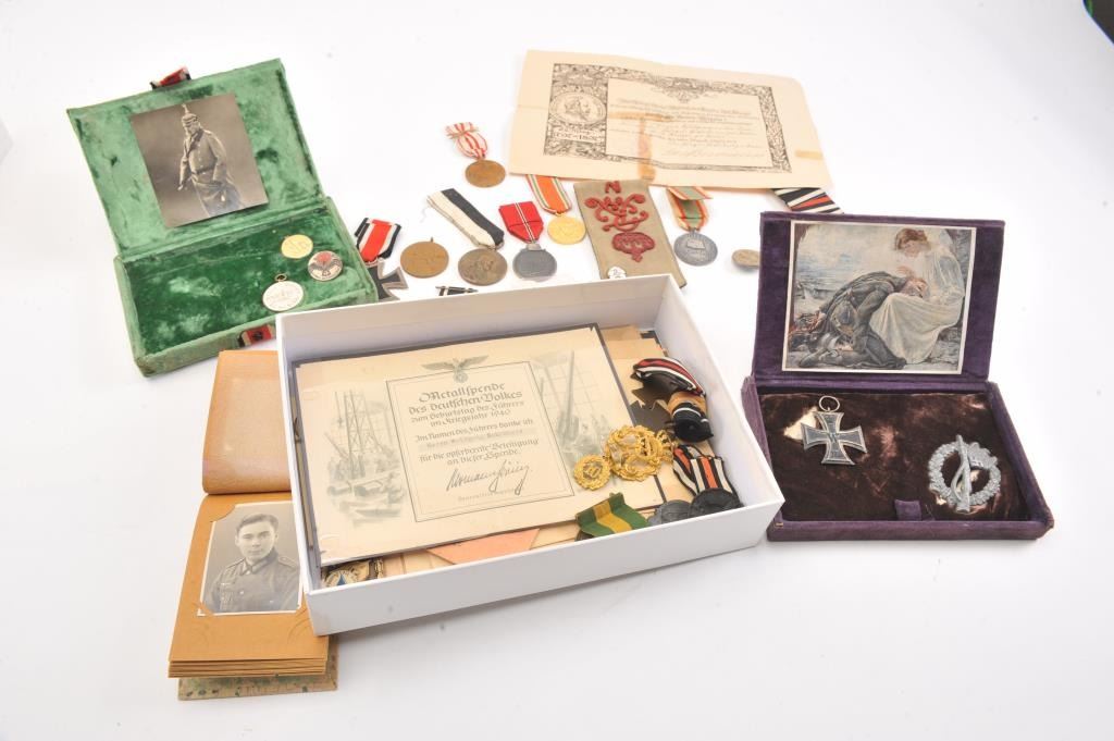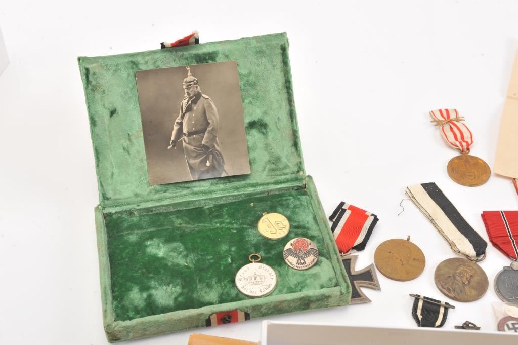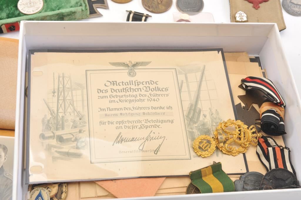 Lot of WWI and WWII German and Austrian military medals and photos, including Iron Crosses, Wound Badges and misc. medals belonging to Wolfgang Schonherr, from the family. Est. $300-600