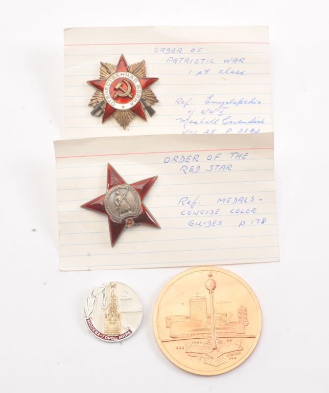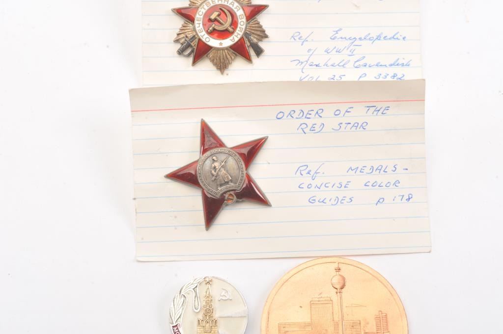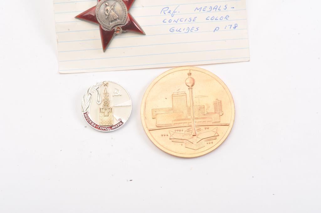 Lot of Russian military medals and West German coin commemorating the 20th anniversary of the democratic republic of Berlin. Est. $100-200