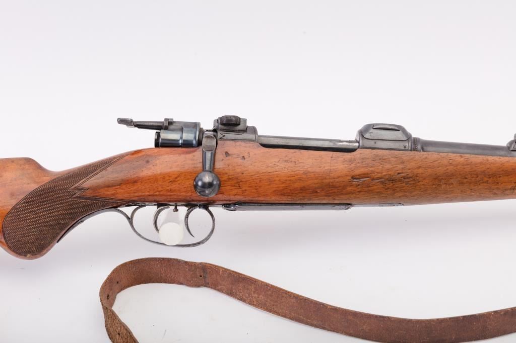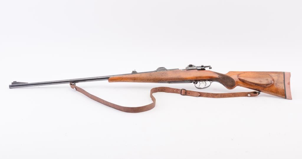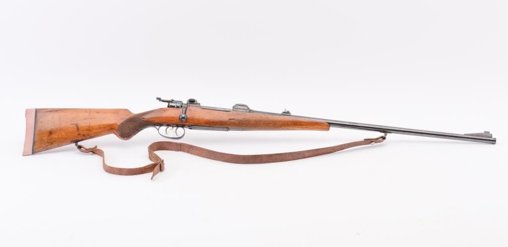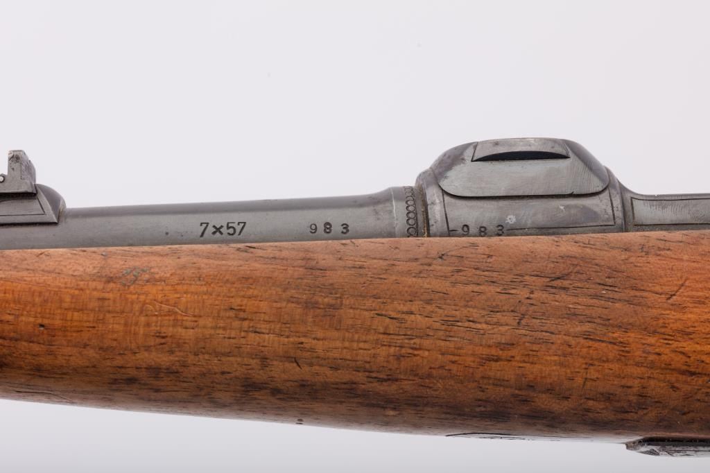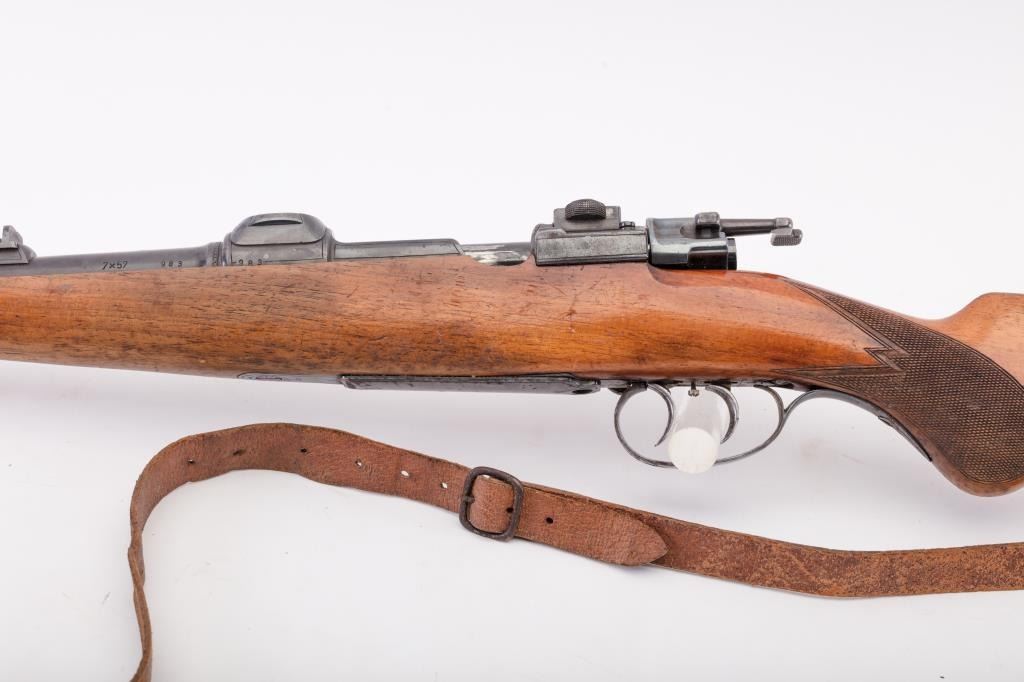 Custom Model 98 Mauser bolt action sporting rifle, 7 x 57 caliber, Serial #983. The rifle is in very good overall condition with a 24” round barrel with a ramped blade front and two-leaf folding rear sights. The barrel retains the majority of its blue finish with a sling swivel added. The barrel address reads, “FRITZ ALBRECHT, ALBRECHTS-SUHL.” The metal surfaces retain the majority of their blue finish with light surface rust onthe magazine plate and trigger guard. The rifle has had custom claw mounts added during the period of use. The custom checkered wood stock has a Schnabel fore end, pancake cheek piece and Prince of Wales grip. Thebutt stock ends with a solid red rubber recoil pad providing a 14 ¾” LOP to the front trigger. The rifle includes sling swivels and a period leather rifle sling. The bore is good, the action is crisp and the markings are sharp on this custom Mauser with a desirable barrel address from Suhl, Germany. Est.: $500-$1,000. (C+R).