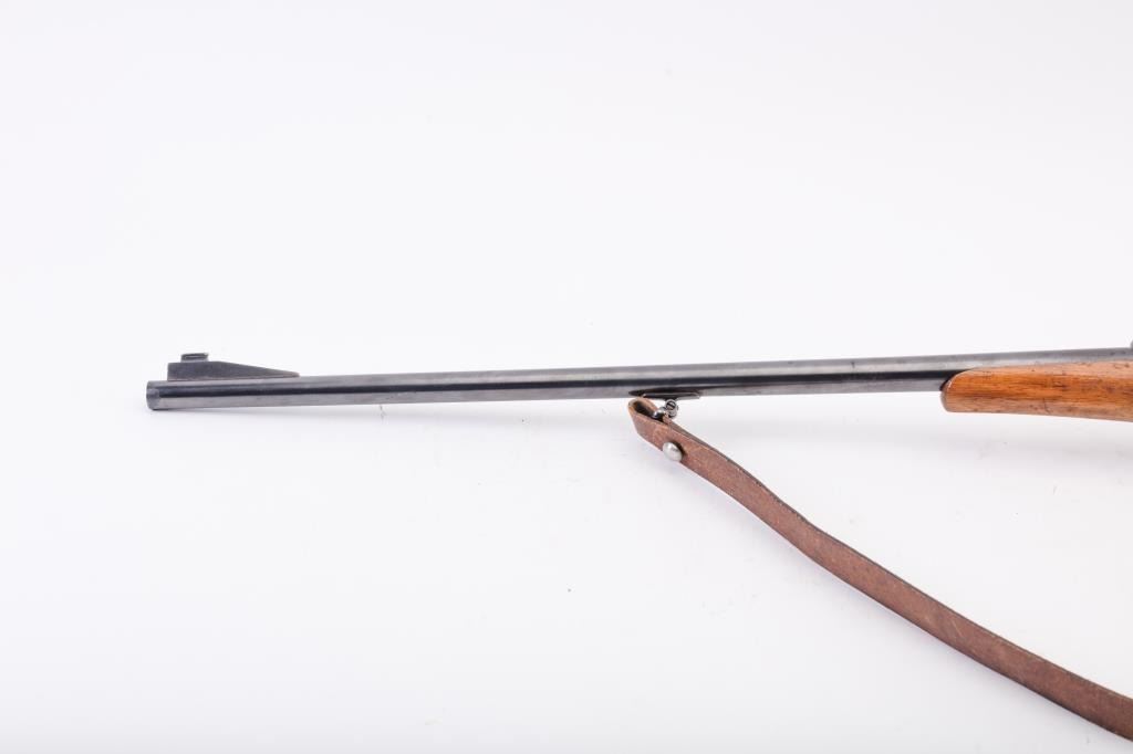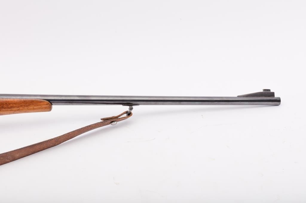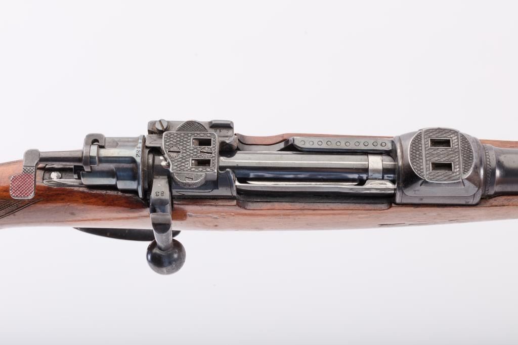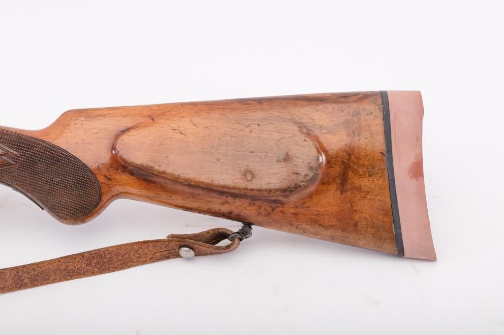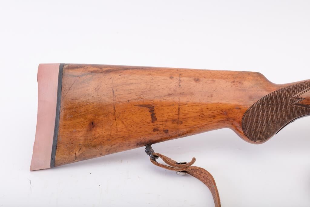 Custom Model 98 Mauser bolt action sporting rifle, 7 x 57 caliber, Serial #983. The rifle is in very good overall condition with a 24” round barrel with a ramped blade front and two-leaf folding rear sights. The barrel retains the majority of its blue finish with a sling swivel added. The barrel address reads, “FRITZ ALBRECHT, ALBRECHTS-SUHL.” The metal surfaces retain the majority of their blue finish with light surface rust onthe magazine plate and trigger guard. The rifle has had custom claw mounts added during the period of use. The custom checkered wood stock has a Schnabel fore end, pancake cheek piece and Prince of Wales grip. Thebutt stock ends with a solid red rubber recoil pad providing a 14 ¾” LOP to the front trigger. The rifle includes sling swivels and a period leather rifle sling. The bore is good, the action is crisp and the markings are sharp on this custom Mauser with a desirable barrel address from Suhl, Germany. Est.: $500-$1,000. (C+R).