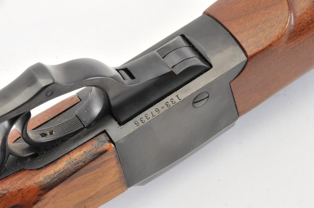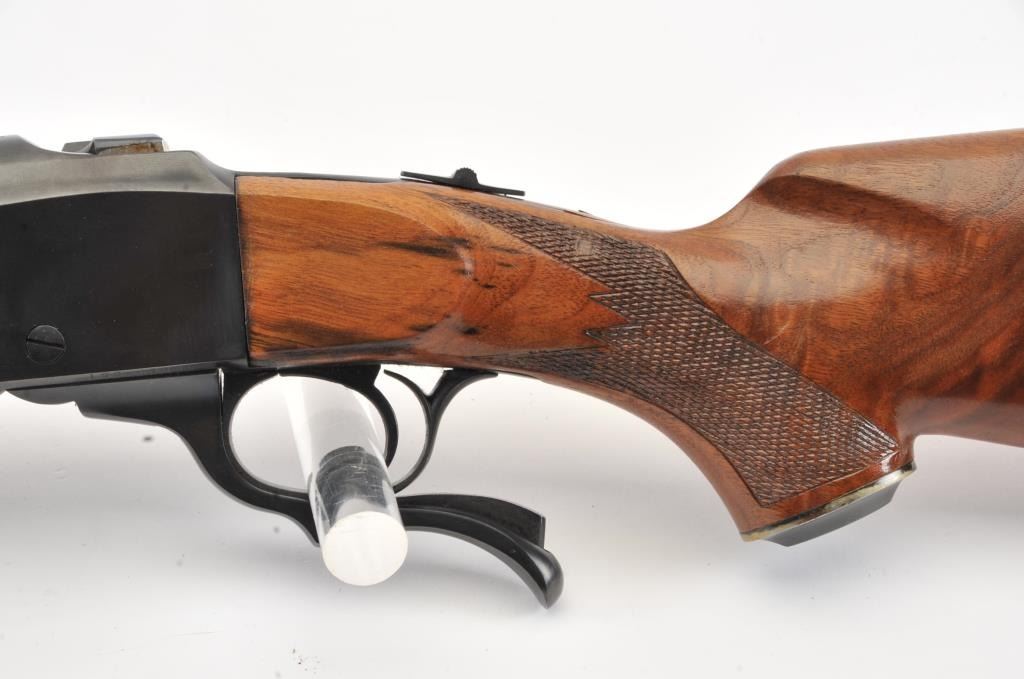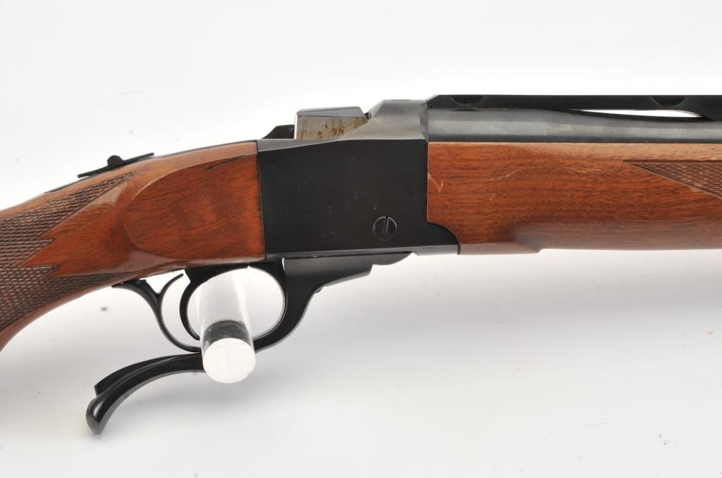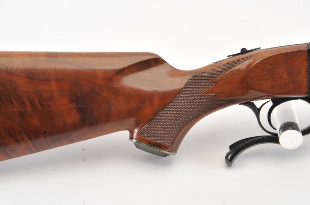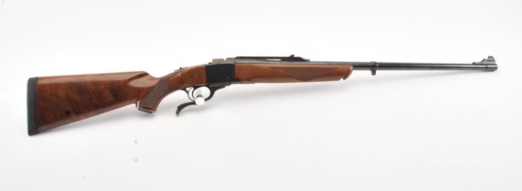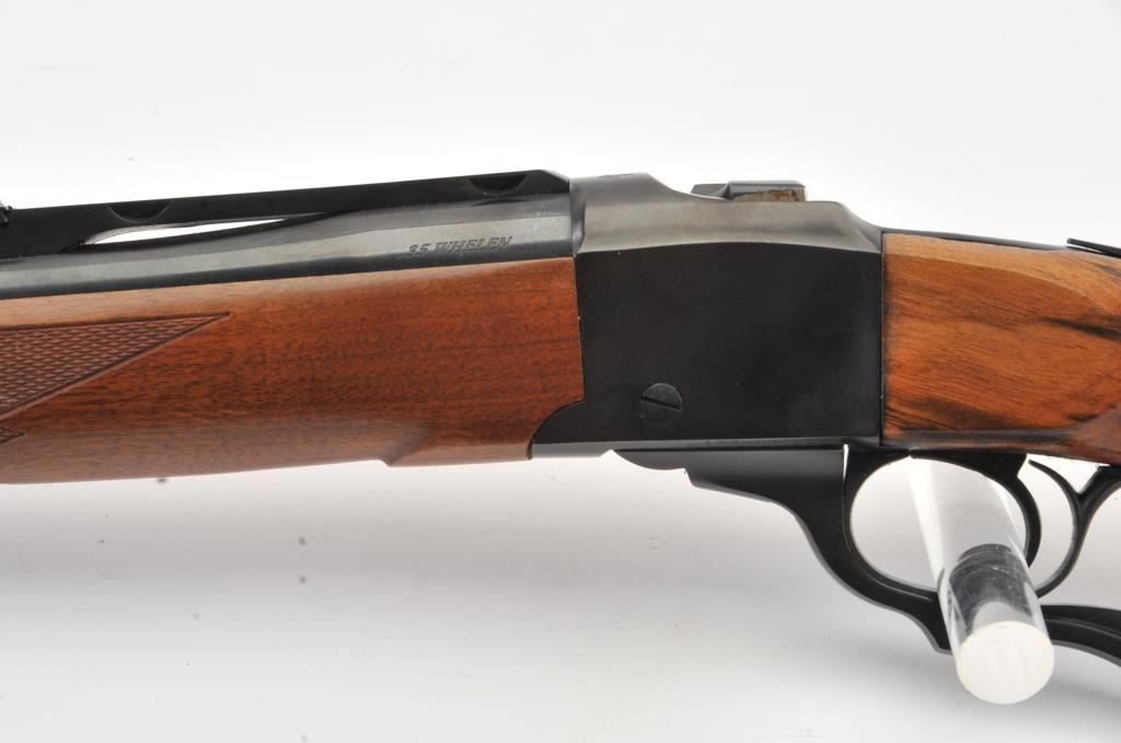 Ruger No.1 single shot rifle, .35 Whelen caliber, Serial #133-67336. The rifle is in fine overall condition with a 26” barrel with a ramped blade front and folding rear sights. The barrel and receiver retainnearly all of the original blue finish with a quarter rib added. The checkered Walnut stock is in very good condition with small mars from carry and use. The butt stock has been given an additional coat of varnish andends with a solid rubber recoil pad providing a 14” LOP. The bore is dirty and may clean to good. The action is crisp and the markings are sharp on this desirable Ruger in the venerable Whelen cartridge. Est.:$700-$1,400. (Modern).
