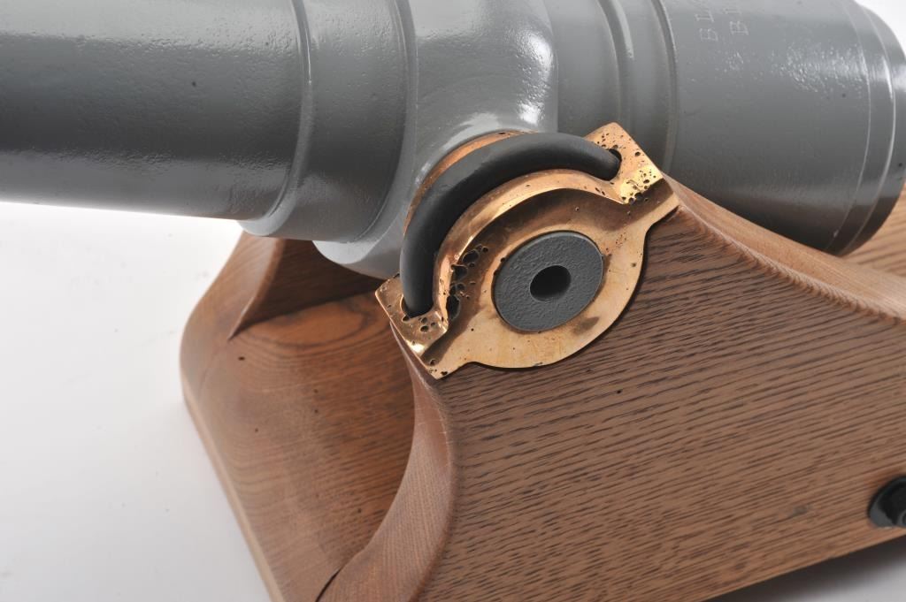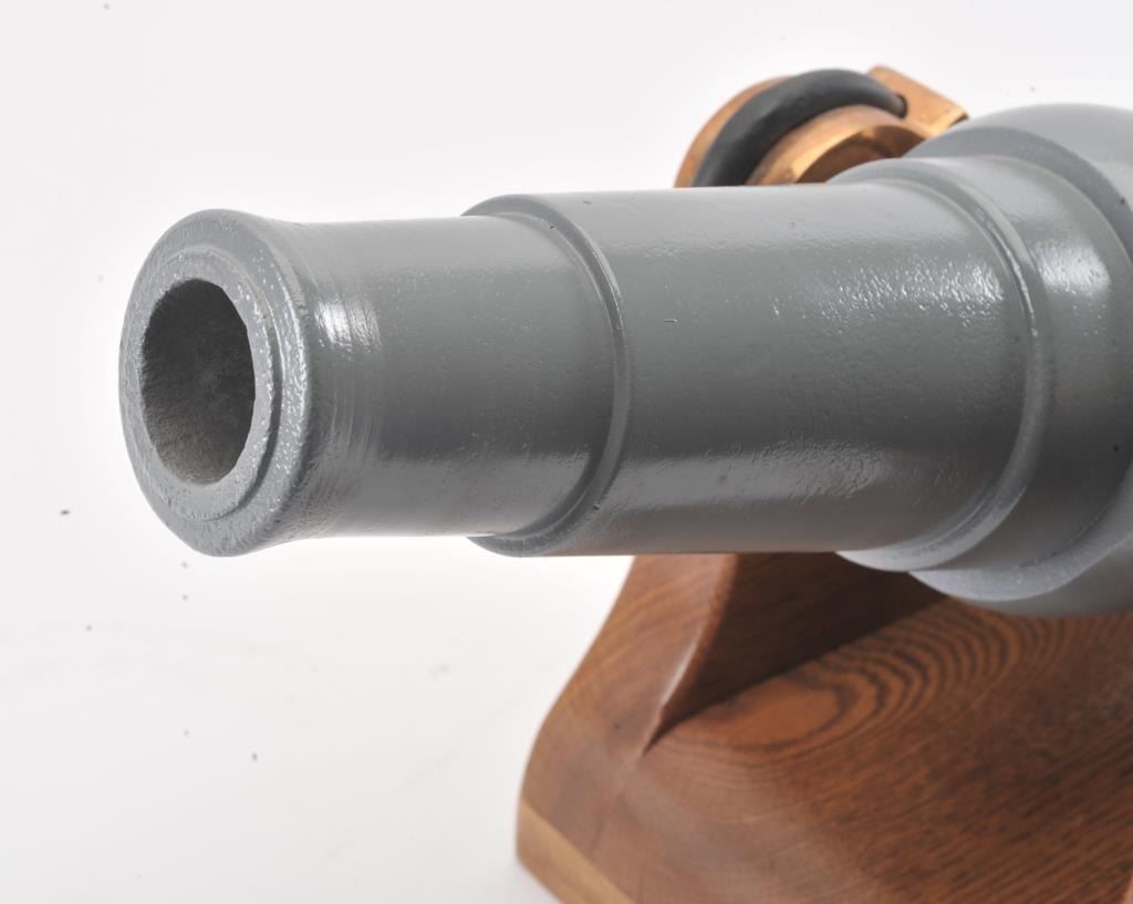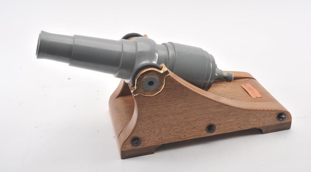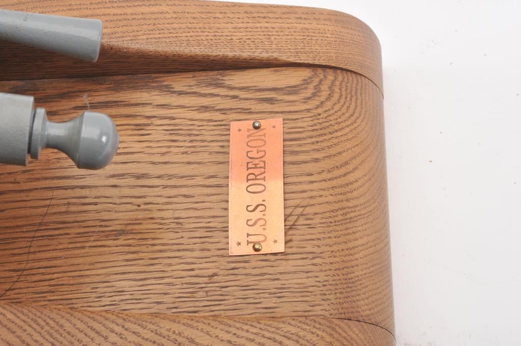 Restored iron signal cannon on wood carriage with brass plaque “U.S.S. Oregon”; approximately 25” long with a 20” barrel painted Navy grey; 13” in height and 9.5” wide; old auction catalog page states cannonwas from the first U.S.S. Oregon that was launched Oct. 26, 1893 and scrapped on the West Coast in 1956; a restored Great White Fleet collector’s item. Est.: $600-$1,200.