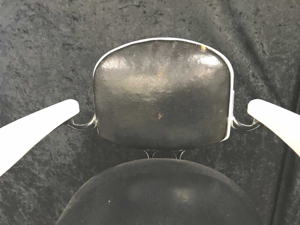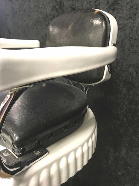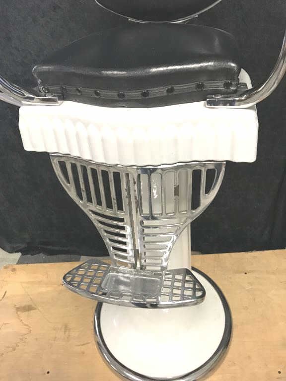 Vintage child’s porcelain Barber chair with black leather cushions; approximately 46” in height; good to very good condition overall and a great display piece! Est.: $600-$1,200.