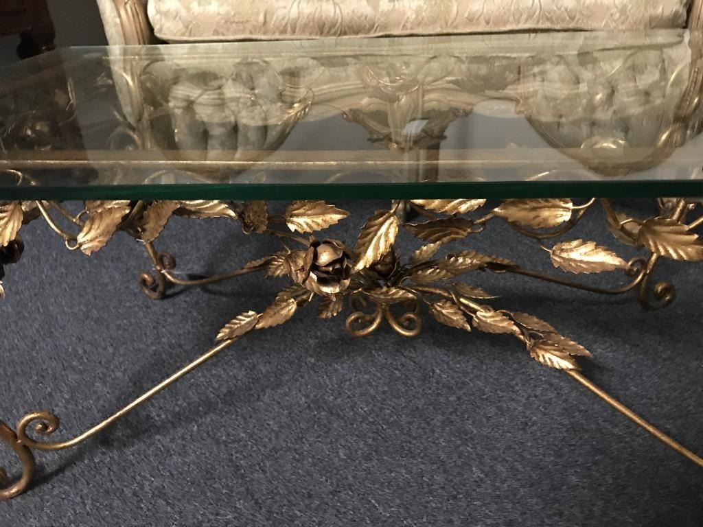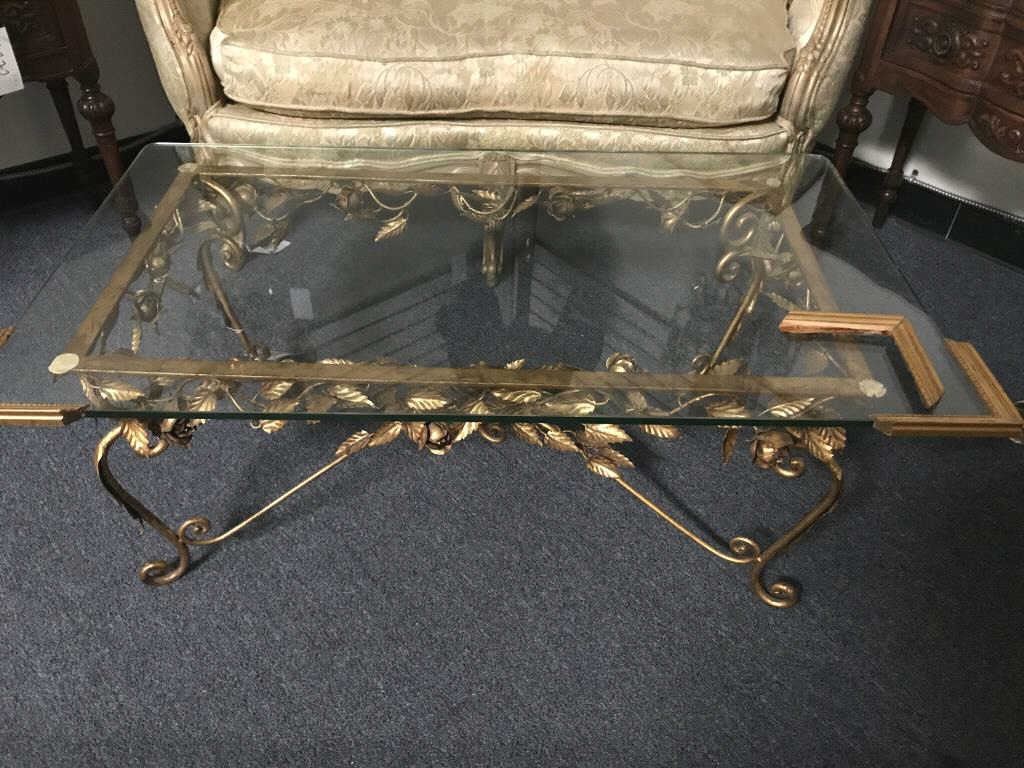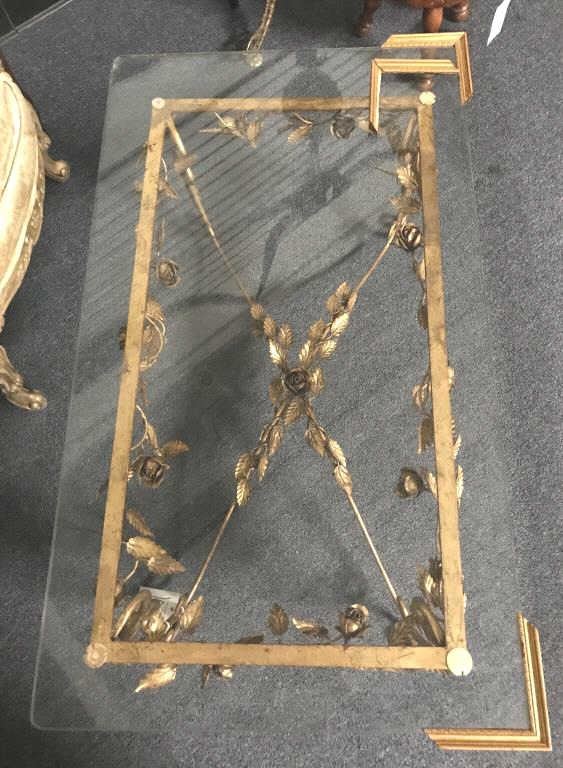 Fancy metal gold gilt coffee table with glass top; approximately 16” in height, 40” wide and 23” deep. Est.: $75-$150.