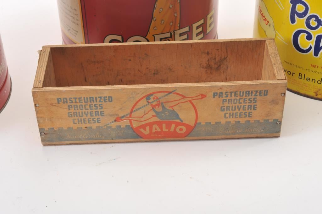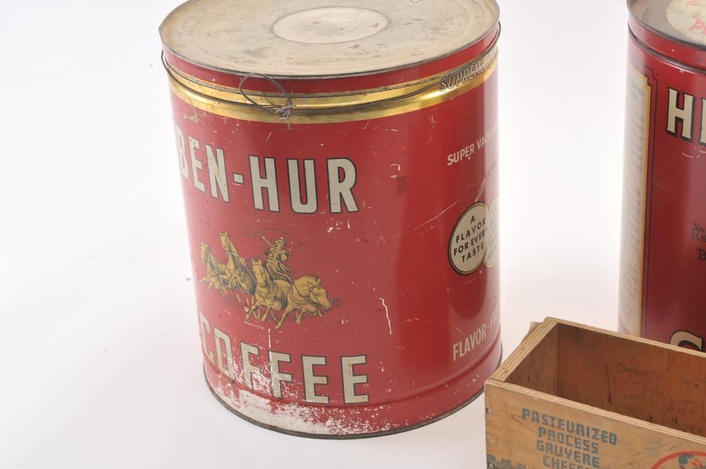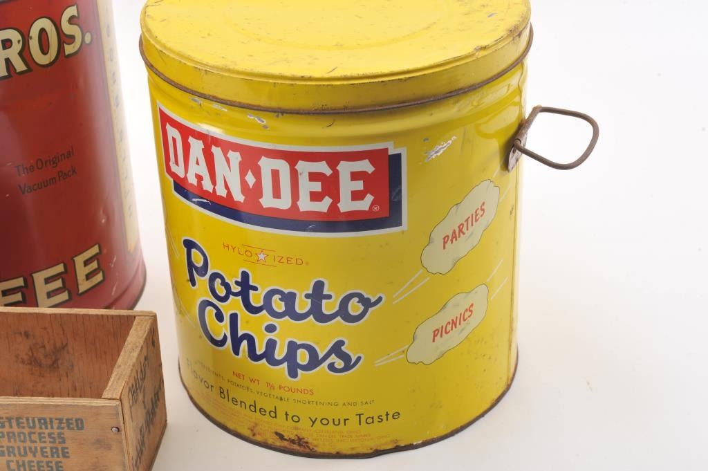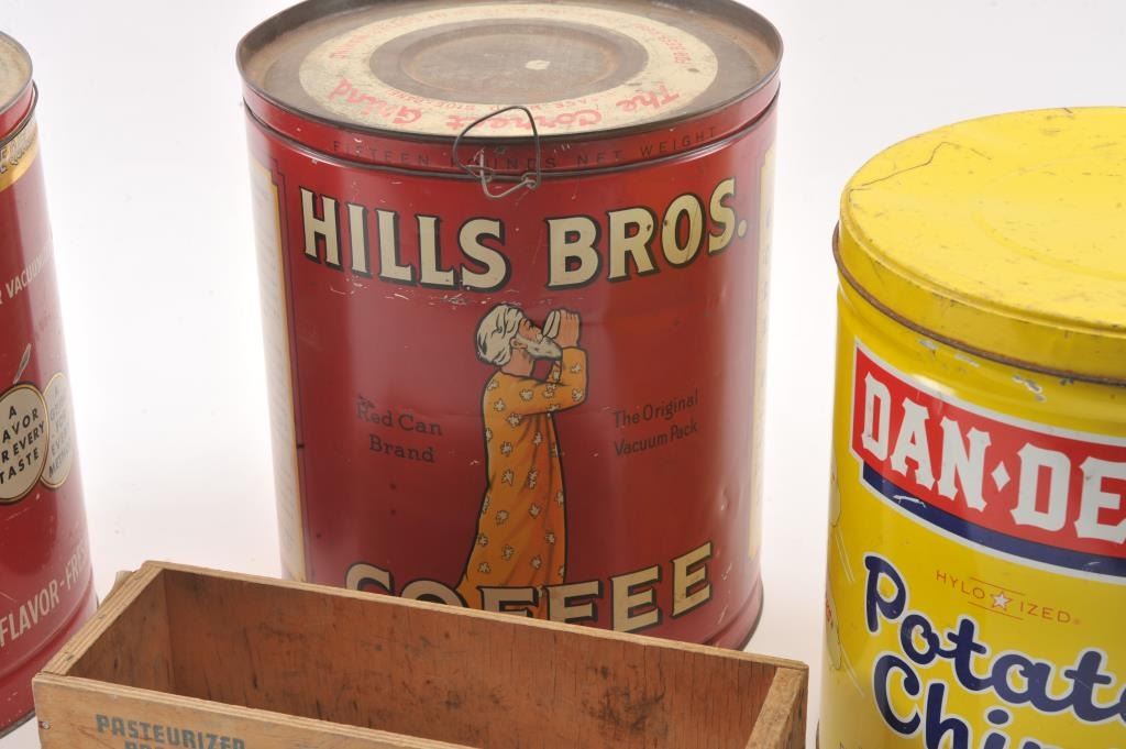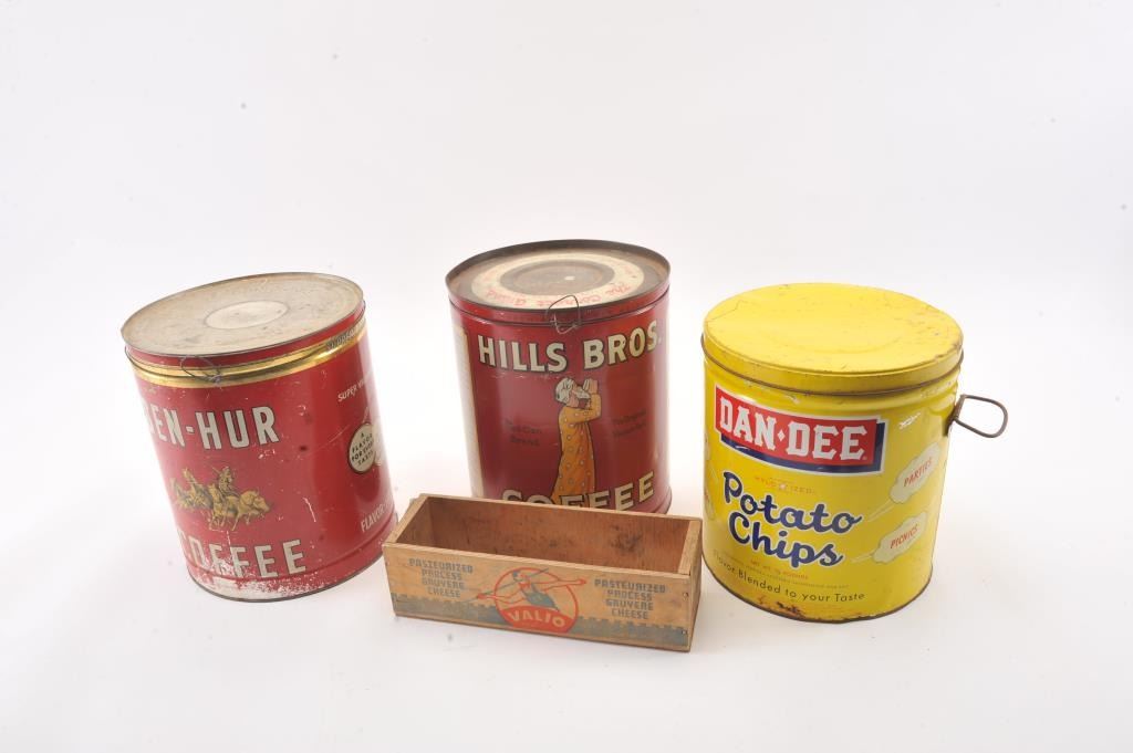 Advertising tin lot, 3 big tins, DanDee Chips, Ben-Hur Coffee, Hills Bros. Coffee & small crate Valio Cheese. Est:$100-200