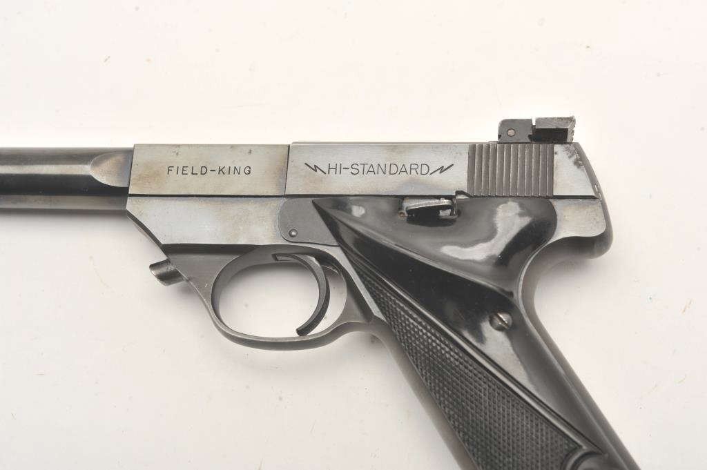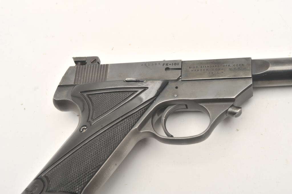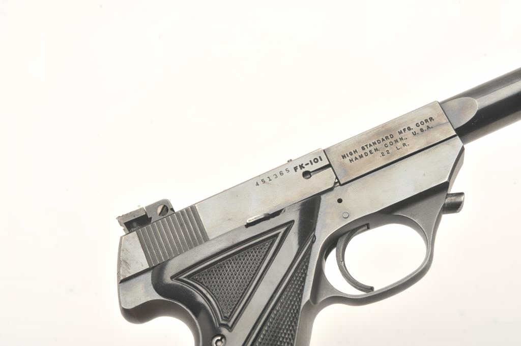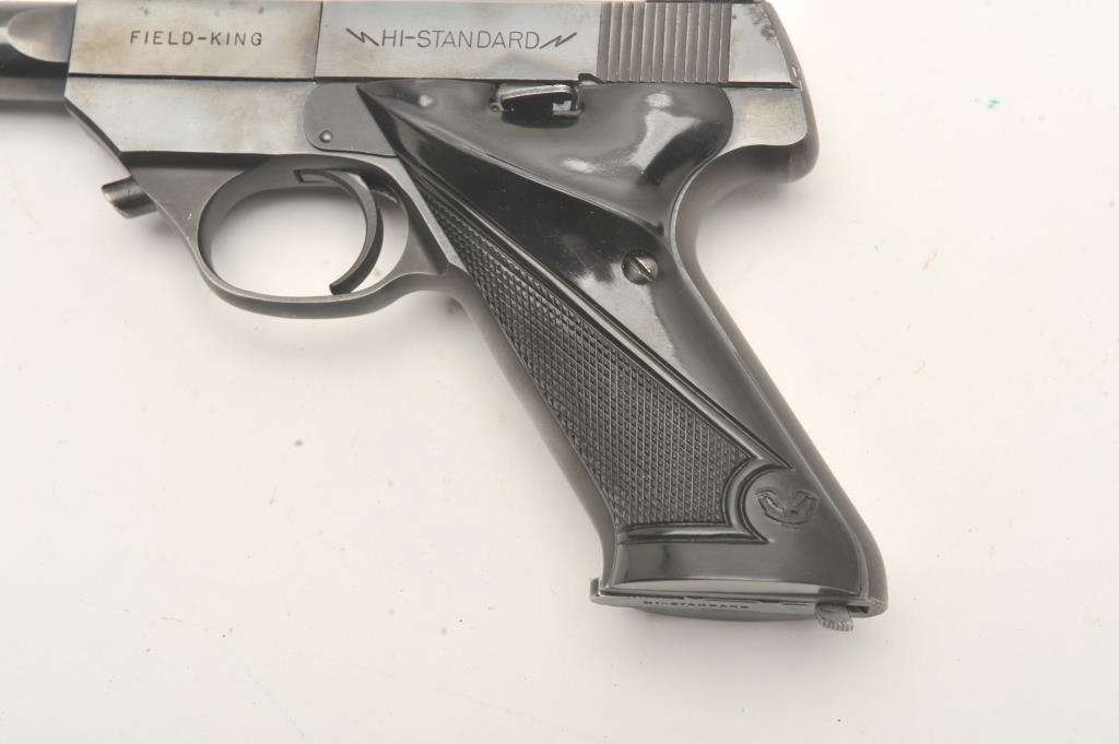 Hi-Standard Model FK-101 Field King, #451365, .22 LR cal., 6 3/4" ported bull barrel, blued finish, adjustable sights, with checkered plastic grips. Pistol is in very good condition overall, showing 95% originalfinish, thinning slightly at the muzzle and grip frame. The grips are very good plus with no chips or cracks. The bore and action are very good. The block of the barrel has a hairline crack where the barrel round meets the square portion of the barrel (approx 5/8" crack under the USA in "Hamden Conn USA"). Includes one correct mag. (C&R / PPT) Est. $400-800