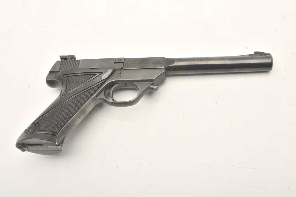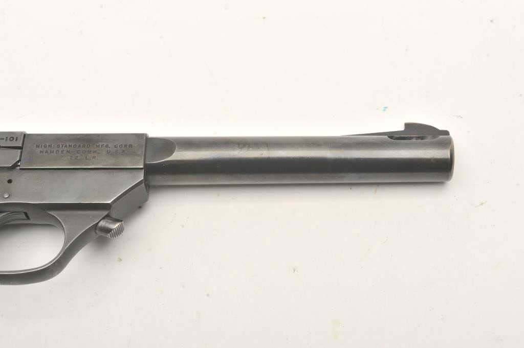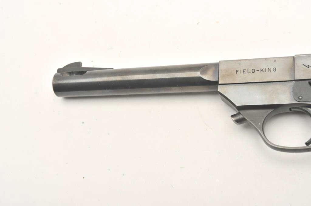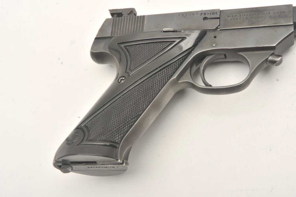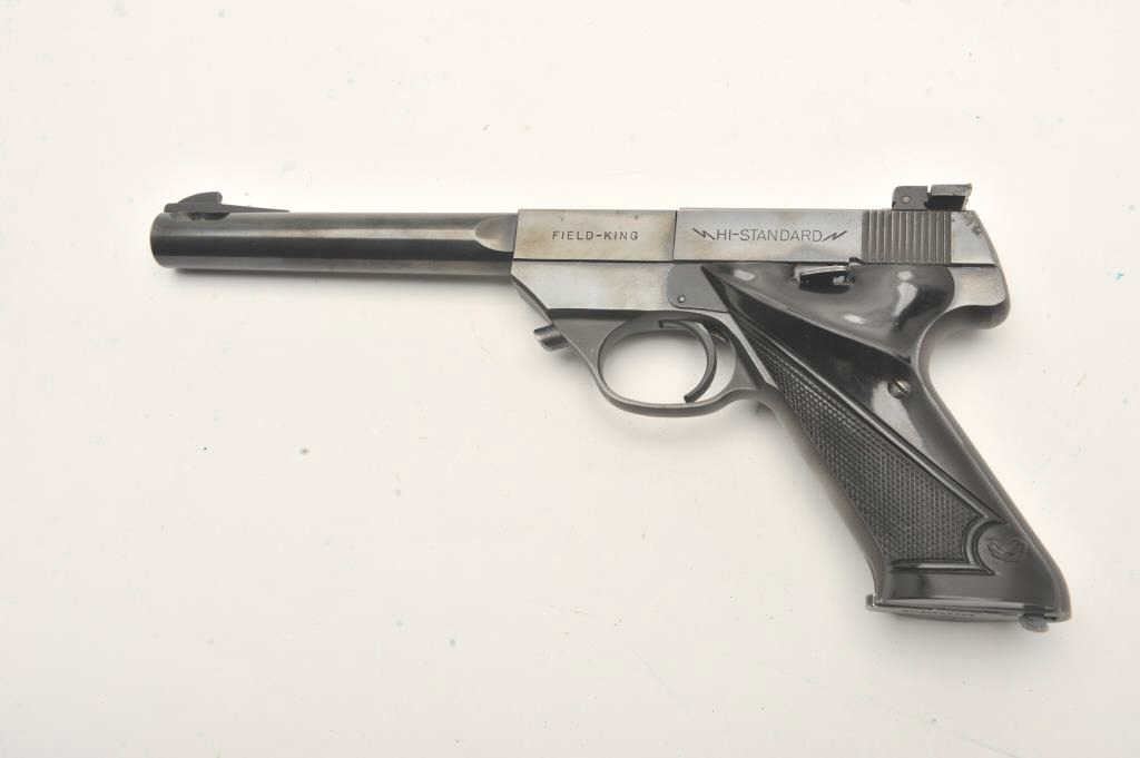 Hi-Standard Model FK-101 Field King, #451365, .22 LR cal., 6 3/4" ported bull barrel, blued finish, adjustable sights, with checkered plastic grips. Pistol is in very good condition overall, showing 95% originalfinish, thinning slightly at the muzzle and grip frame. The grips are very good plus with no chips or cracks. The bore and action are very good. The block of the barrel has a hairline crack where the barrel round meets the square portion of the barrel (approx 5/8" crack under the USA in "Hamden Conn USA"). Includes one correct mag. (C&R / PPT) Est. $400-800
