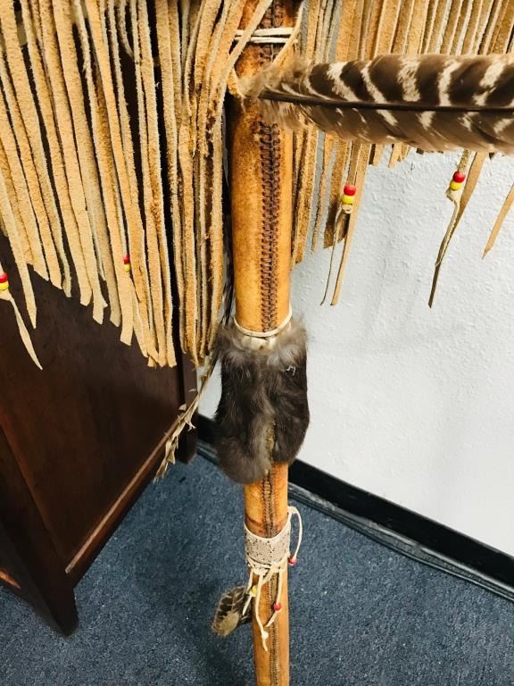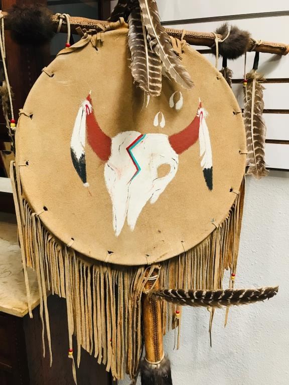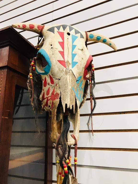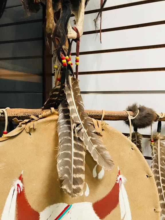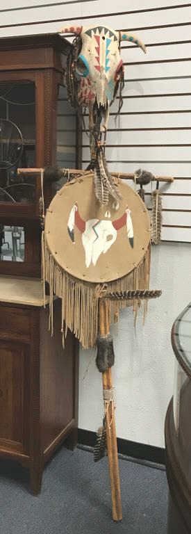 Large Indian Wall Hanging with banner, skull, feathers & beads. Est:$300-600