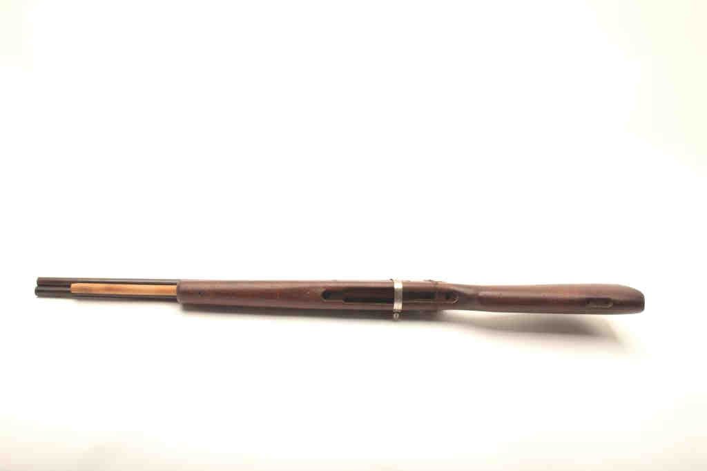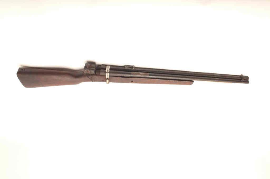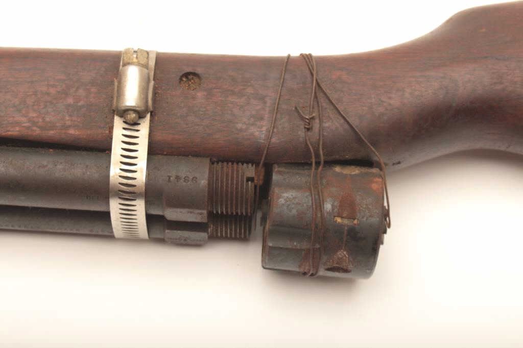 Fantasy gun, cut down 1903 stock with two W.W. Greener military barrels attatched with a hose clamp to simulate a double barrel, and a cylinder from an unknown revolver wired to the rear. Stock has damage to the leftforend, and was probably why it was donated to the project. Est. $20-40