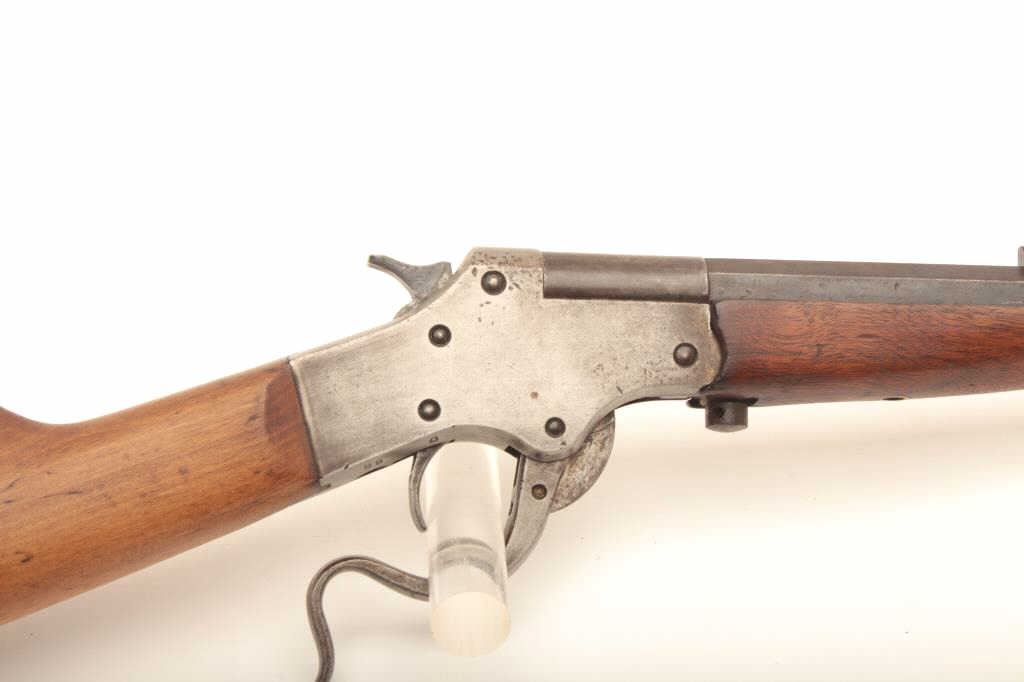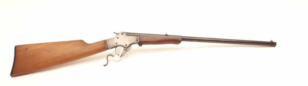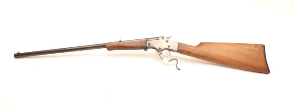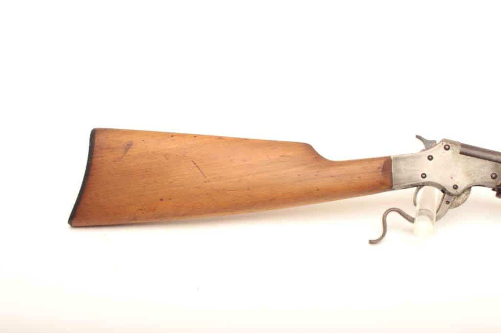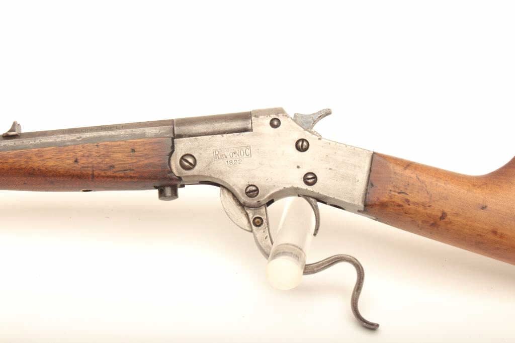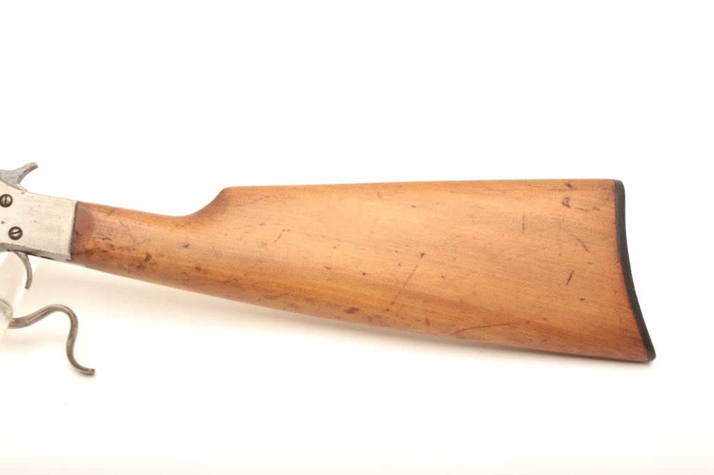 Rev-O-Noc single shot tip up .22 cal rifle, #1822, 20" barrel, blued finish smooth wooden stock. Rifle is in fair condition overall, original finish has turned to a brown patina, bore is fair, action is working. Originalbutt plate is retained. (C&R) Est. $40-80