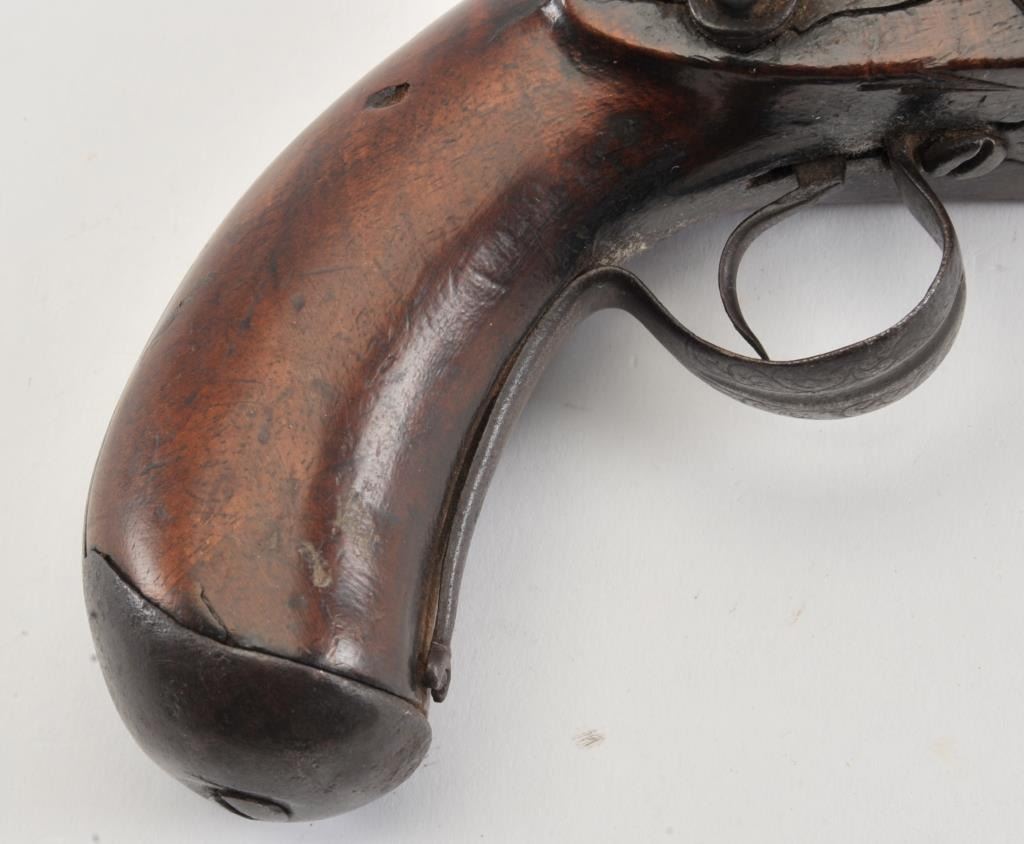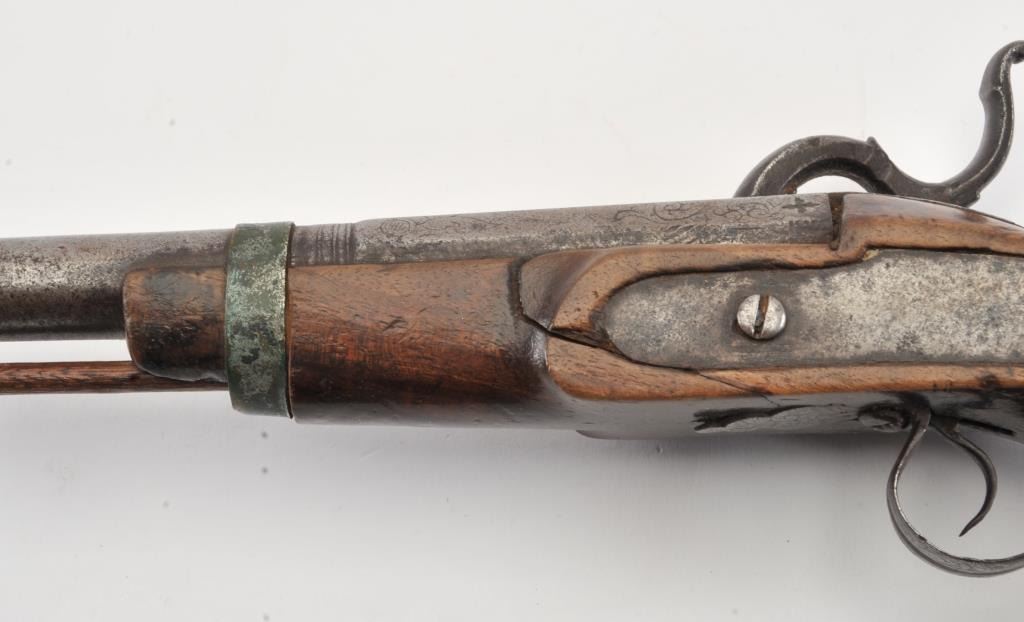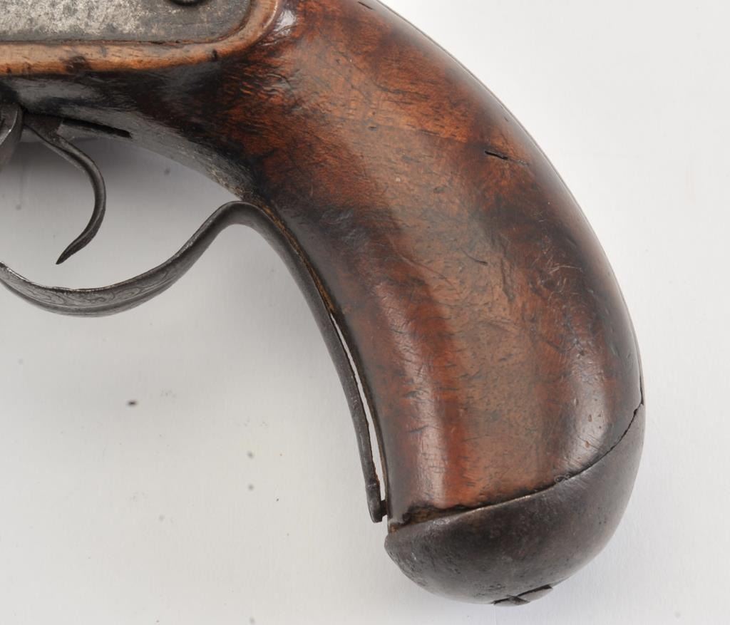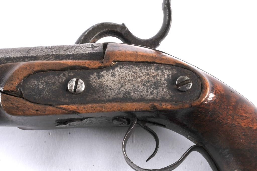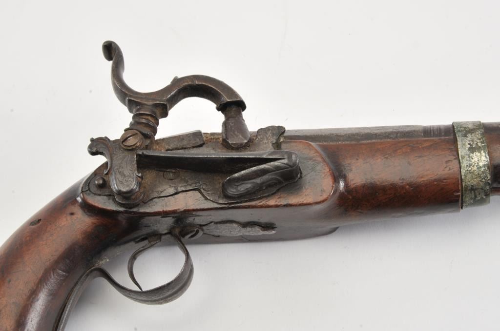 Spanish Miquelet pistol showing period conversion to percussion with maker’s mark at rear of barrel which is not legible. Good overall condition with minor pitting, erosion and dark patina. The wood is sound and fairto good with one split and normal aging. .60+ caliber smoothbore caliber and 11 ½” overall with a 7 ¼” barrel. Spanish colonial era with a very characteristic hammer. (Antique) Est.: $300-$600