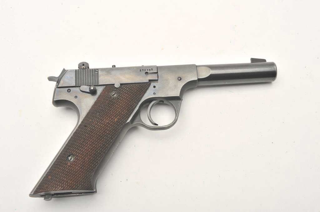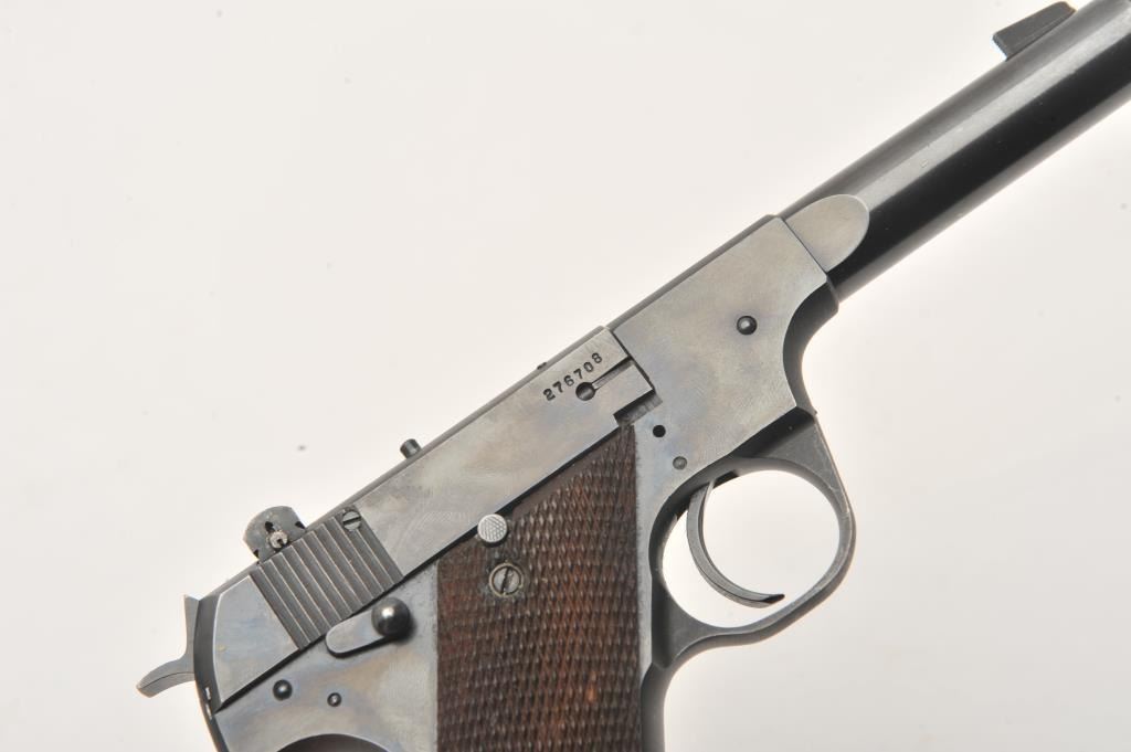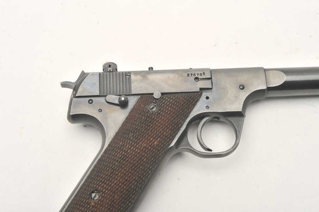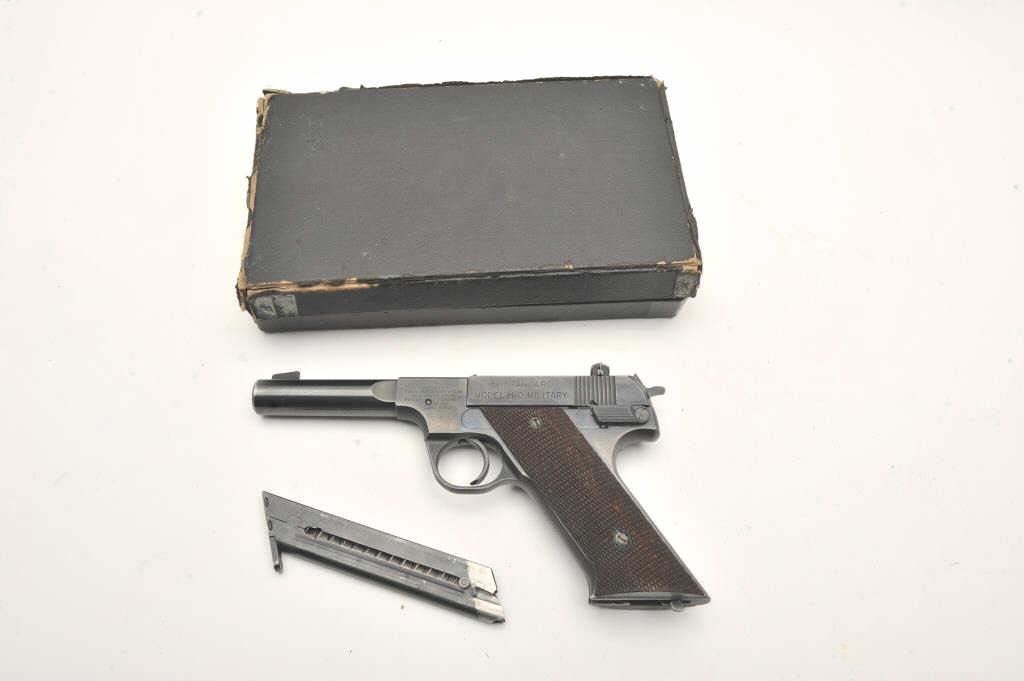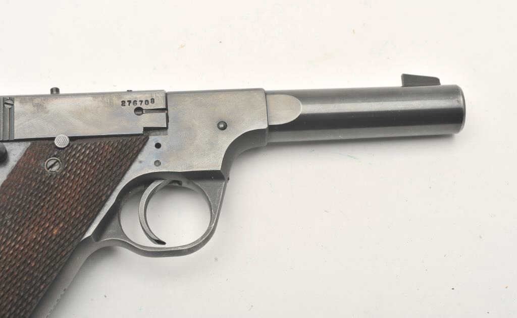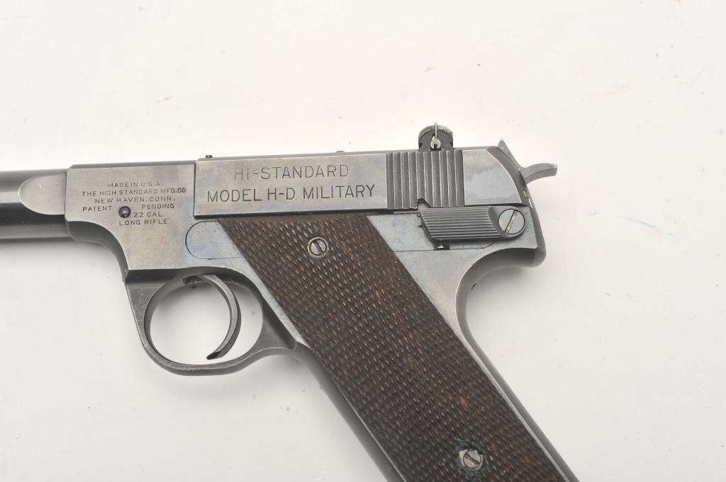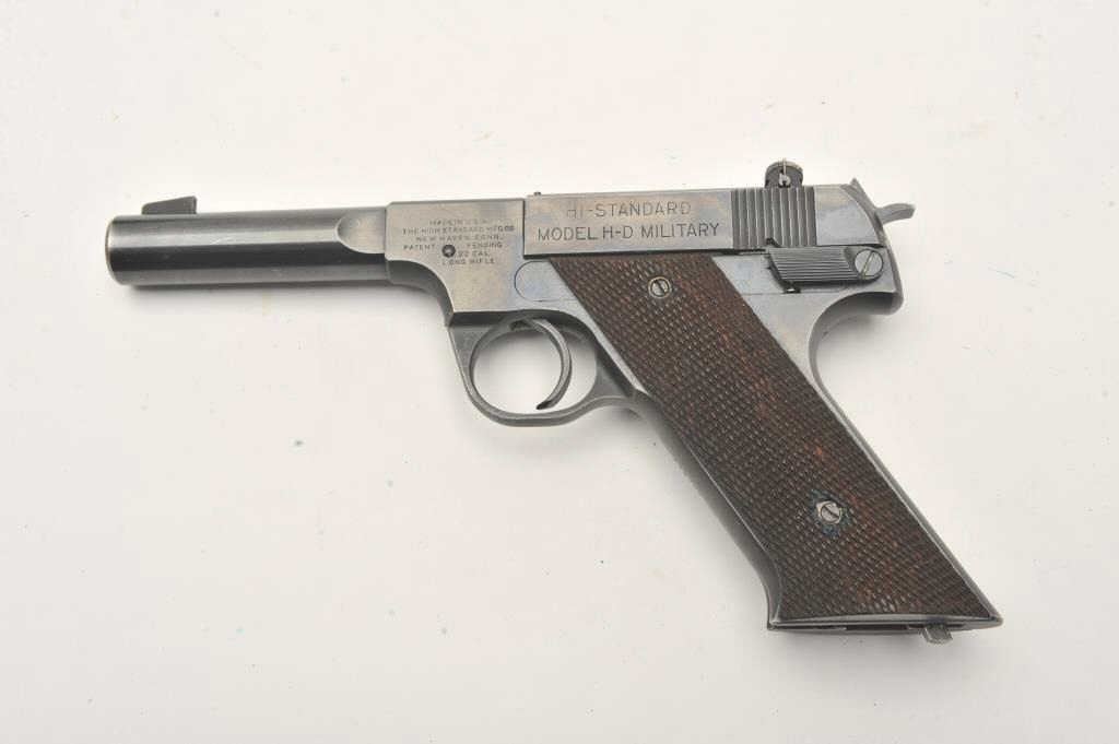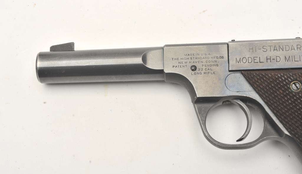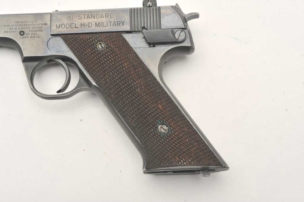 Hi-Standard Model H-D Military, #276708, .22 LR cal., 4 1/2" heavy barrel, blued finish, adjustable sights, with checkered grips. Pistol is in fine condition overall, showing approximately 95% original finish, thinningslightly at the muzzle and grip frame. There are mars from storage and use. The grips are very good plus with no chips or cracks. The bore is bright, action is very good. Includes original box in fair condition andone correct mag. (C&R / PPT) Est. $500-1000
