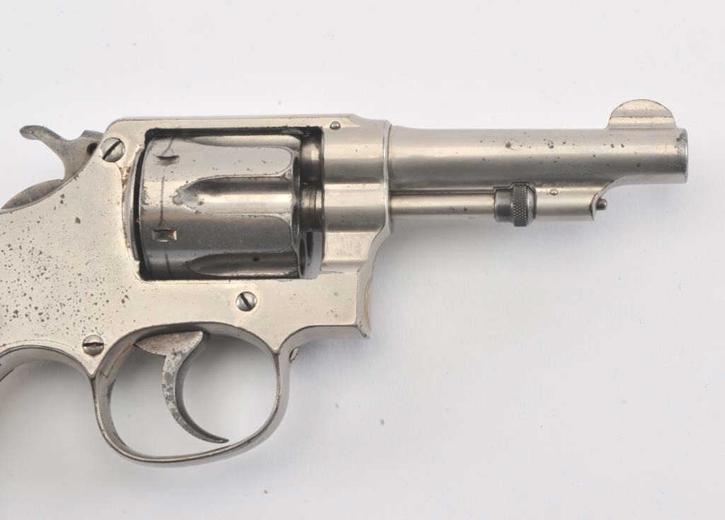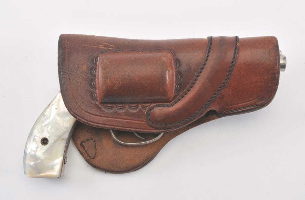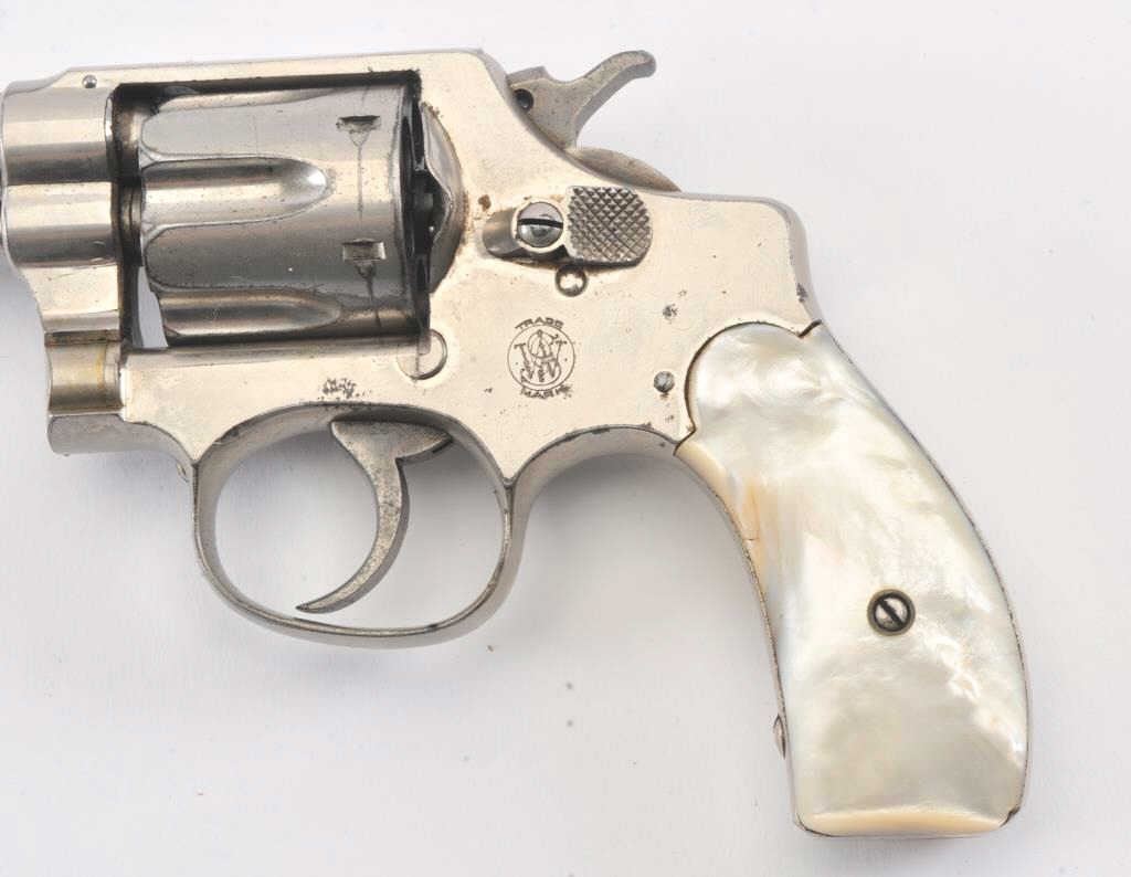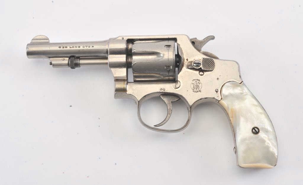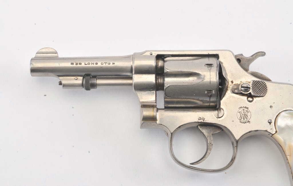 Smith & Wesson Hand Ejector double action revolver, .32 caliber, Serial #85720. The pistol is in good overall condition with a 3 ¼” barrel. The pistol retains the majority of its nickel finish with some scratches tothe left frame and light surface rust on the right. The smooth pearl grips are in good condition with a small flea bite chip at the base of the left panel. The bore is fair, the action functions and the markings aresharp. The lot includes a hand tooled leather, open top belt holster marked, “POLICE SPECIAL LEWIS L.A. CAL”. Est.: $250-$400. (C+R/PPT).