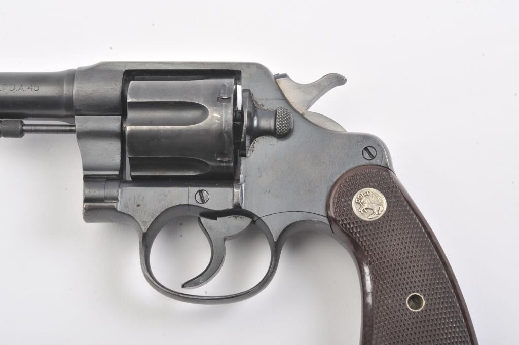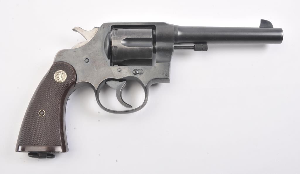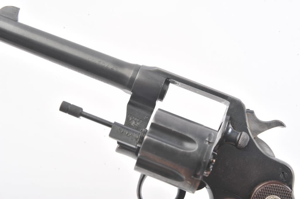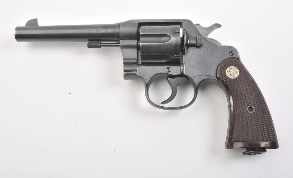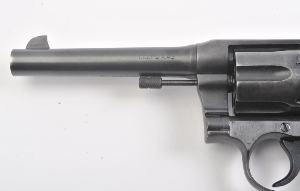 Colt Model 1917 double action revolver, .45 ACP caliber, Serial #193082. The pistol is in fine overall condition with a 5 ½” barrel with shark fin front sight. The pistol retains nearly all of the matte blue finishwith wear at the muzzle and a drag line on the cylinder. The butt is marked, “US ARMY MODEL 1917 No. 37631” and the lanyard ring is retained. The checkered plastic medallion grips are in very good condition. The boreis good, the action is crisp and the markings are sharp. Est.: $350-$700. (C+R/PPT).