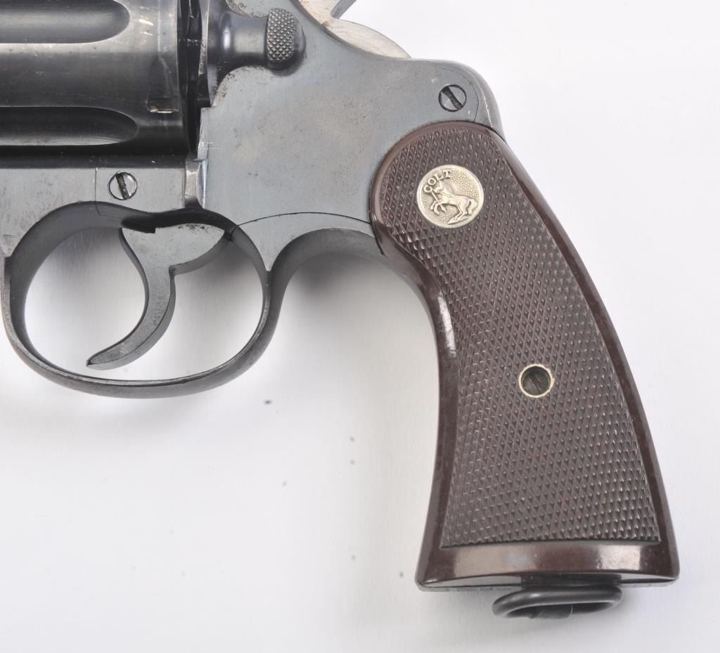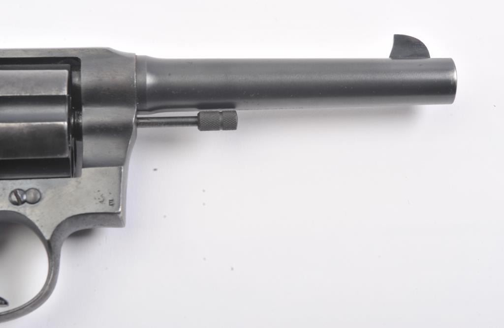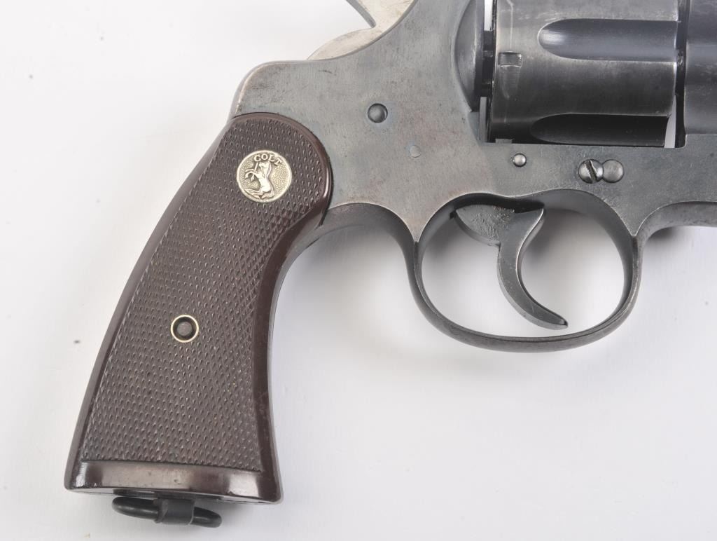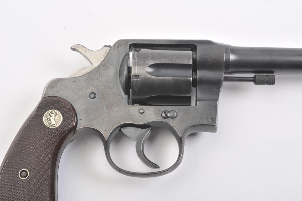 Colt Model 1917 double action revolver, .45 ACP caliber, Serial #193082. The pistol is in fine overall condition with a 5 ½” barrel with shark fin front sight. The pistol retains nearly all of the matte blue finishwith wear at the muzzle and a drag line on the cylinder. The butt is marked, “US ARMY MODEL 1917 No. 37631” and the lanyard ring is retained. The checkered plastic medallion grips are in very good condition. The boreis good, the action is crisp and the markings are sharp. Est.: $350-$700. (C+R/PPT).