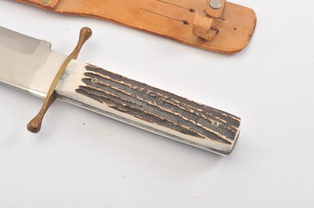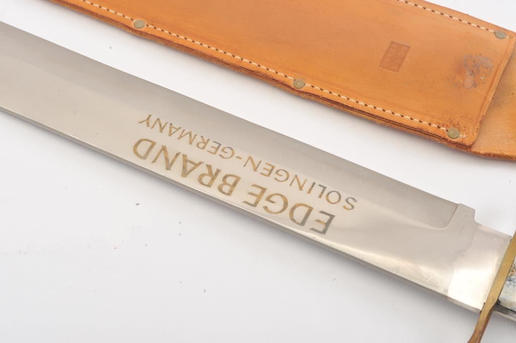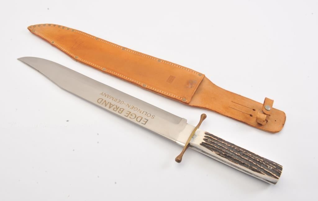 Edge Brand custom giant Bowie knife. The knife is 23 ½” in total length with a 17 ½” clip point blade. The blade is in good condition with no signs of sharpening. The blade is marked, EDGE BRAND SOLINGEN-GERMANY. The handguard is brass and the scales are crisp stag with two pins. The leather scabbard is in good condition. Est.: $200-$300.