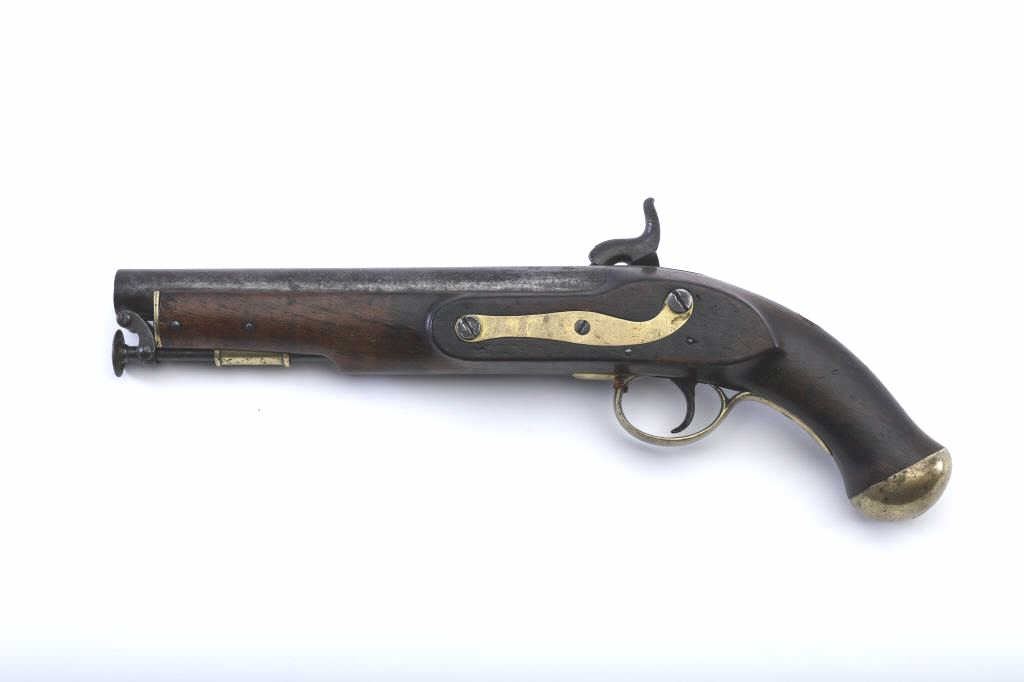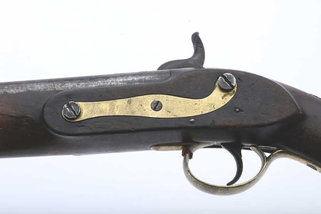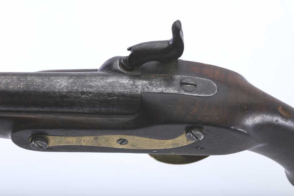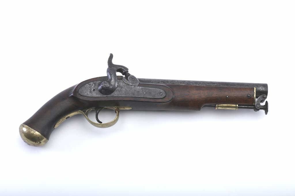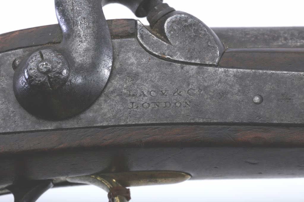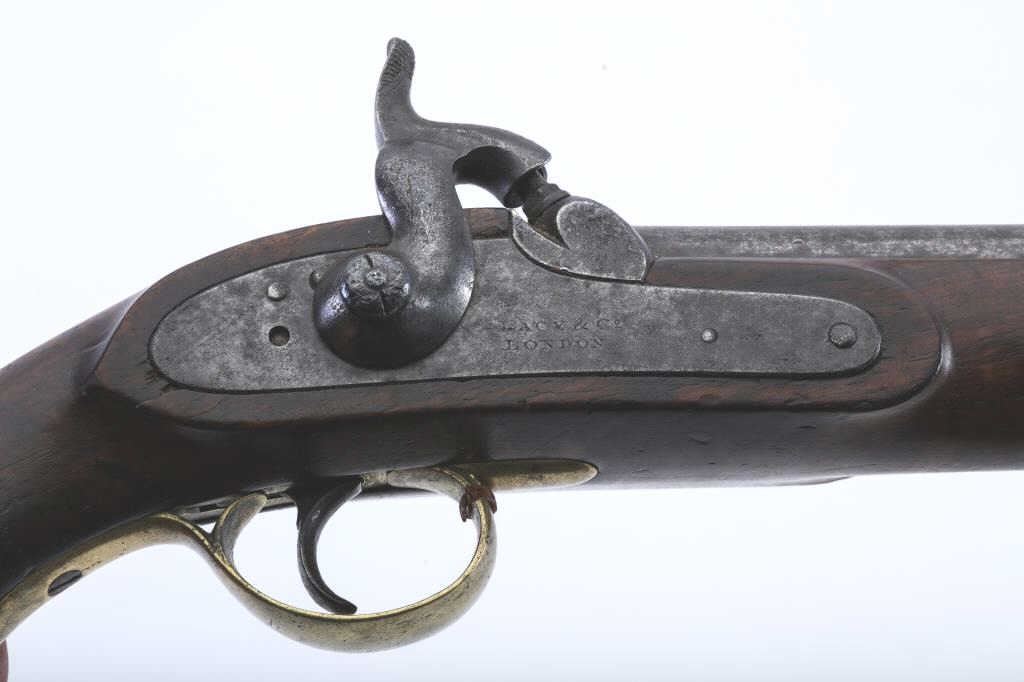 English Military style percussion pistol with lock marked “Lacy & Company, London”. Measures 15 ¾” overall with a 9” barrel of .69-70 caliber smoothbore, full stock and swivel ramrod. Plain brass mounts. Very goodcondition with normal aging and very good plus wood. The action works well. The type purchased by merchant marine and officers for personal use. (Antique) Est.: $400-$800