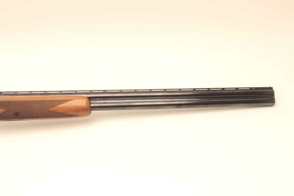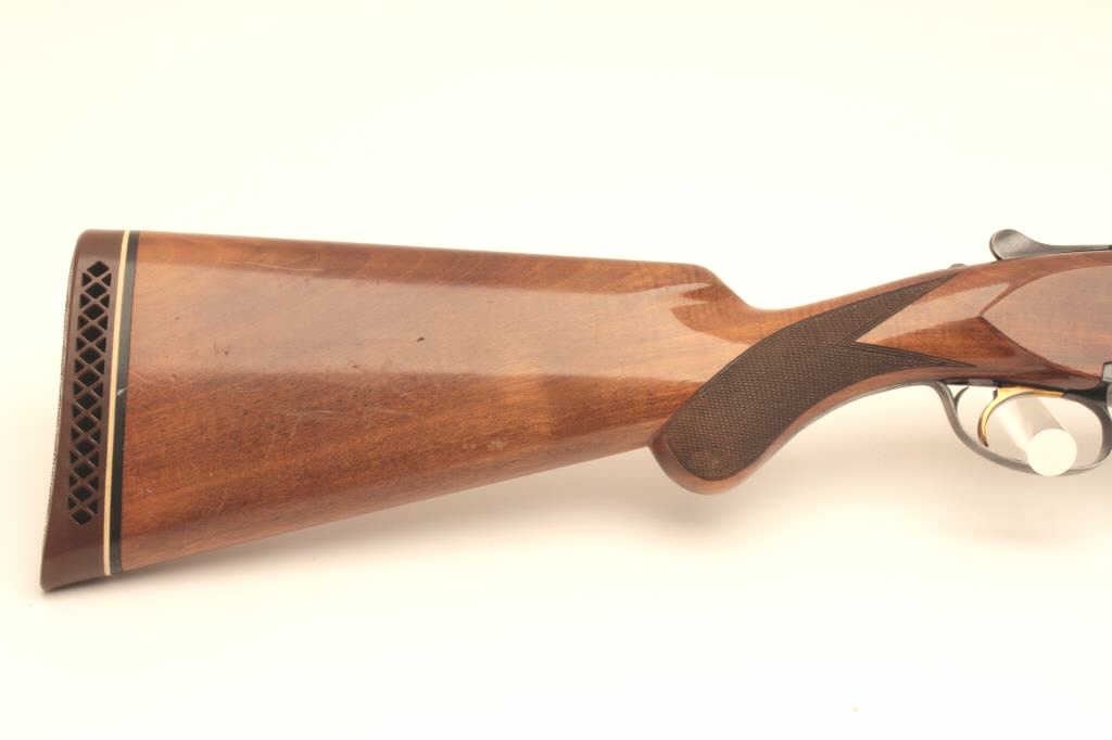 Browning Over/Under Lightning Model Superposed shotgun in 12GA with 30” barrels choked full over modified, low rise vent rib, long tang round knob, single trigger, and auto ejector, S/N 97850. 90%-95% blue on thebarrels. 50%-70% original blue on action with area of light cleaning and erosion. The wood is good plus with dings in fore end and minor scratches in buttstock. Measures 14” to the end of thick pad. Good bores. Est:$700-1400 Note-original 3" mag and Factory (Browning) rubber pad.