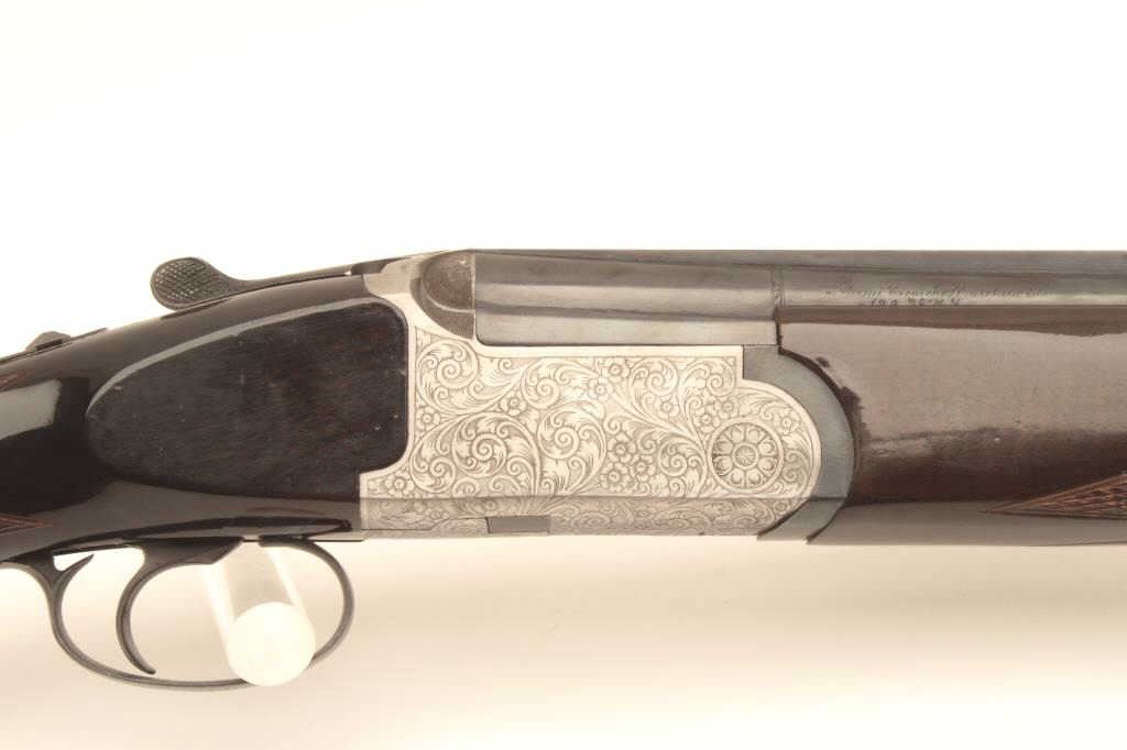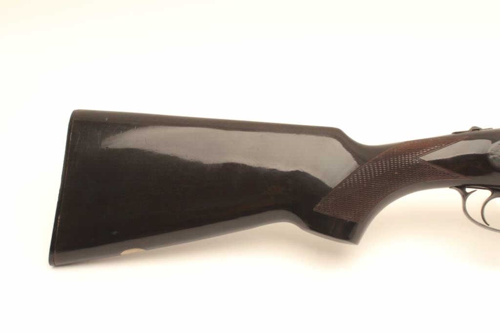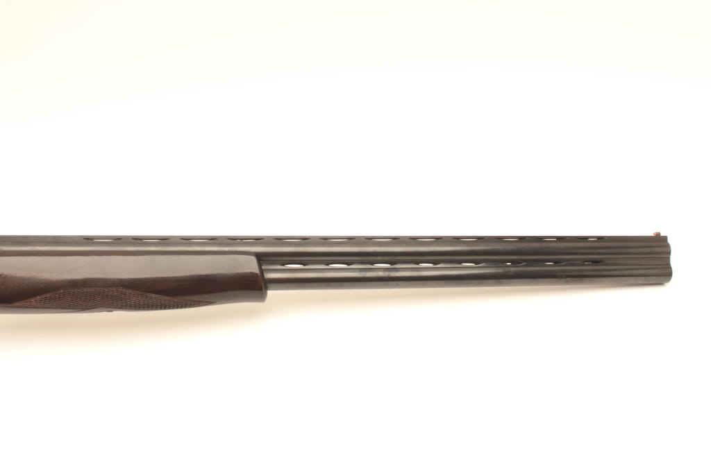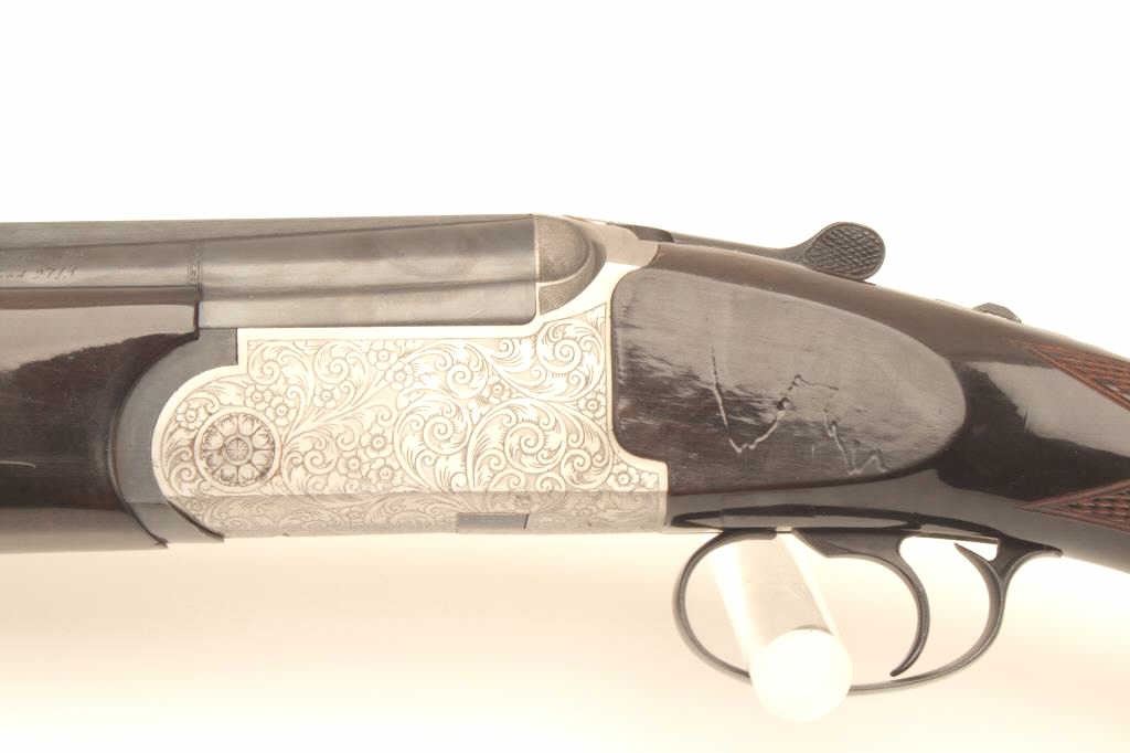 Armi Tecuchi Italy manufactured 12GA Over/Under shotgun with 28” barrels, single trigger, auto ejectors, vent rib, split barrels, and engraved. Choked full over modified. Measures 13 ½” to the end of thebutt plate. Very good plus to almost fine used condition. Imported by Arms Sport Miami. S/N 30289. (Modern) Est.: $200-$400