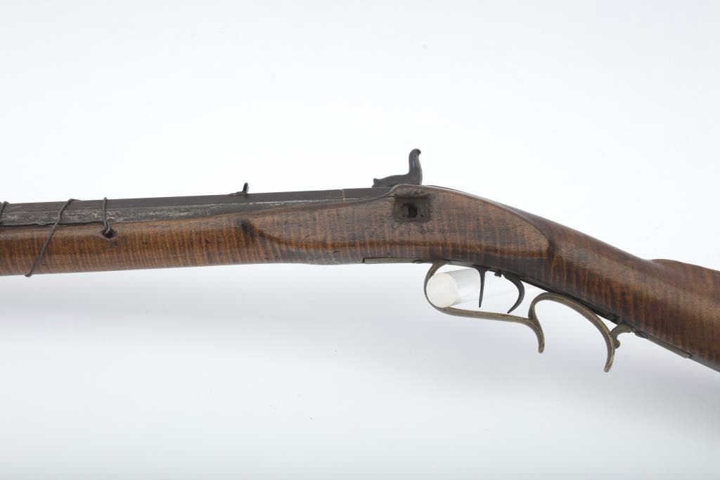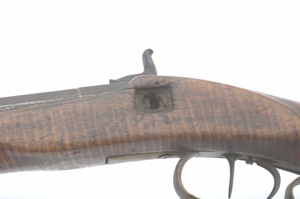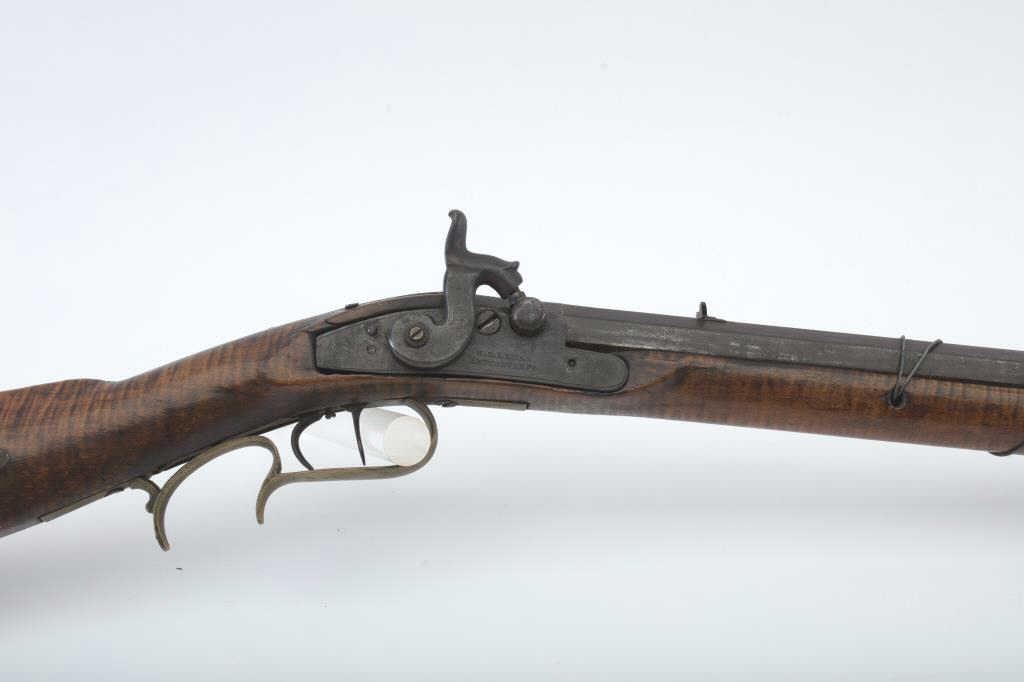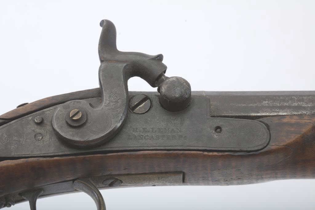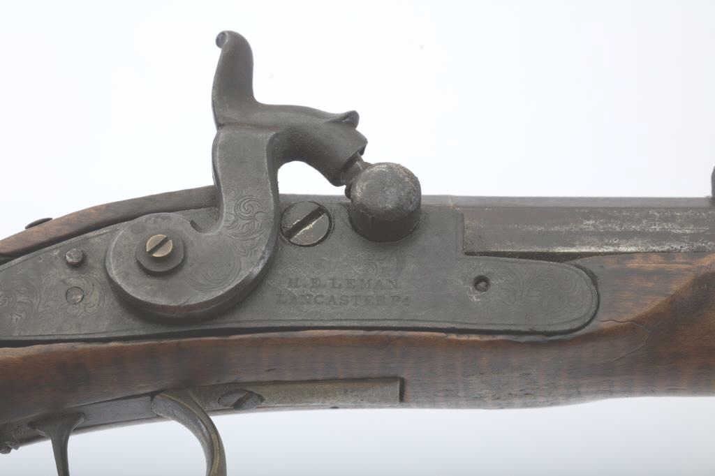 “H.E. Leman Lancaster” marked (On Lock) percussion plains rifle with fancy patch box and barrel shortened during period of use to 23”. .41 caliber rifled barrel of standard weight and brass mountings. The stock showsnatural “Fiddleback” stripping. The barrel has been re-secured to stock by removing pins and adding wire. The action works when the triggers are set but otherwise does not hold on full cock. Deep patina and fair to goodoverall. Found in Colusa, CA in gold rush area by early collector who purchased from family of settlers who carried this rifle west. Note: The small side plate and screw removed and hole enlarged. (Antique) Est.:$400-$800