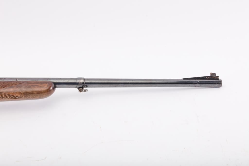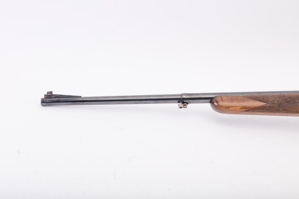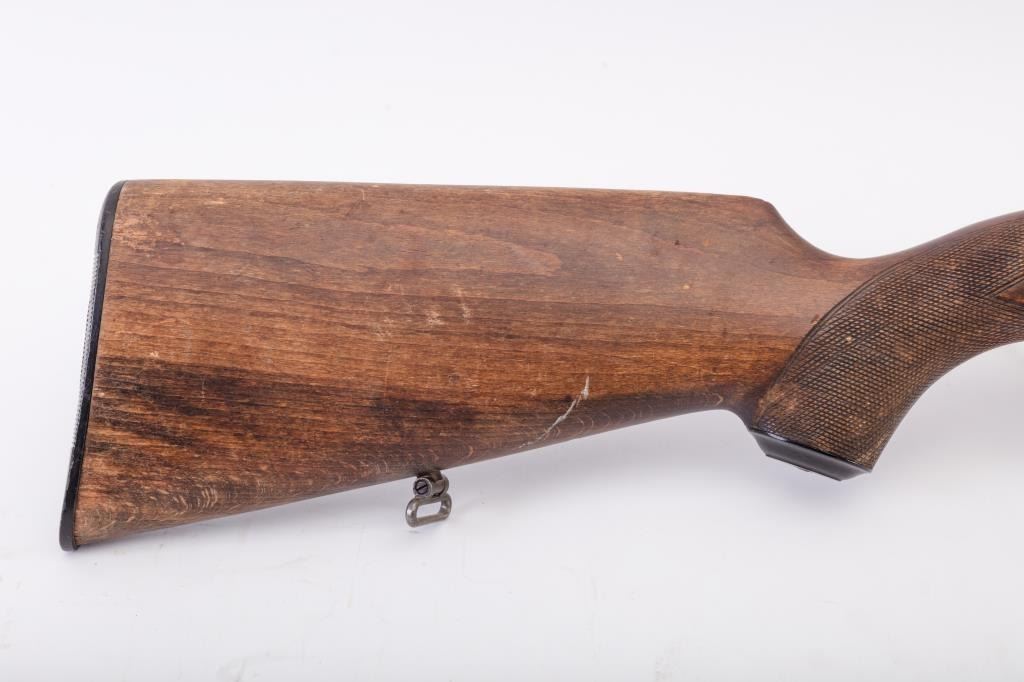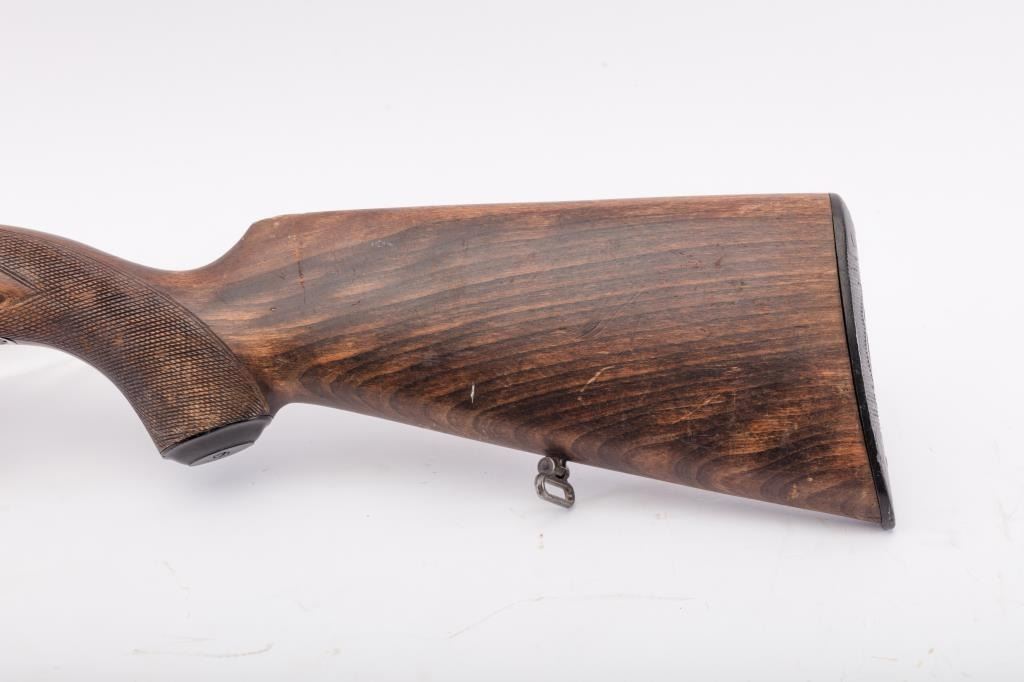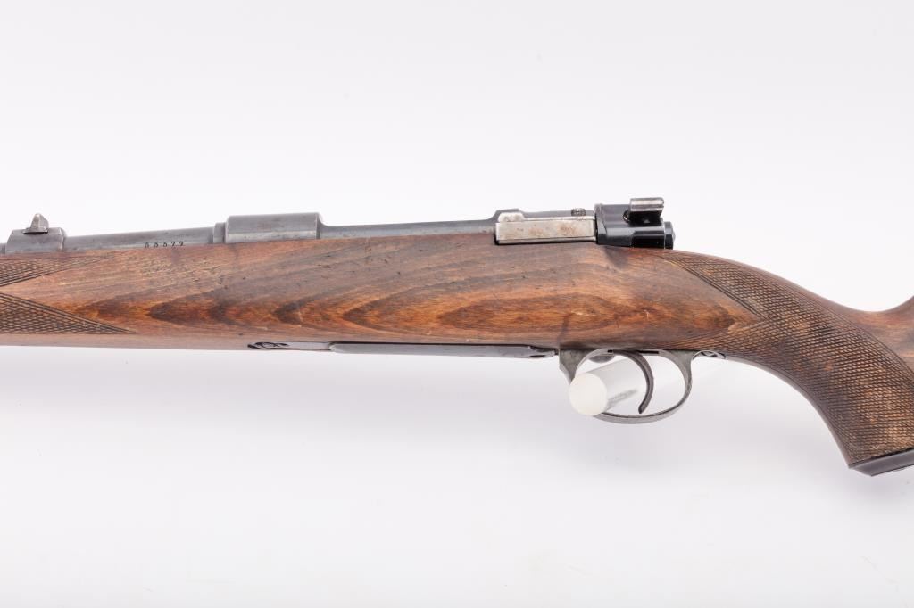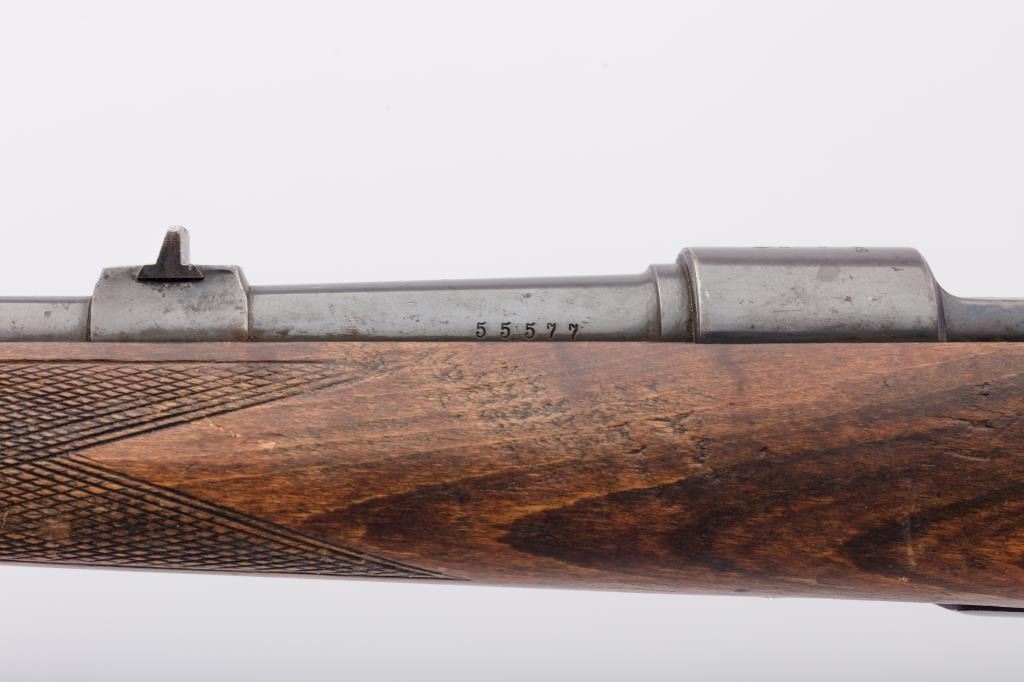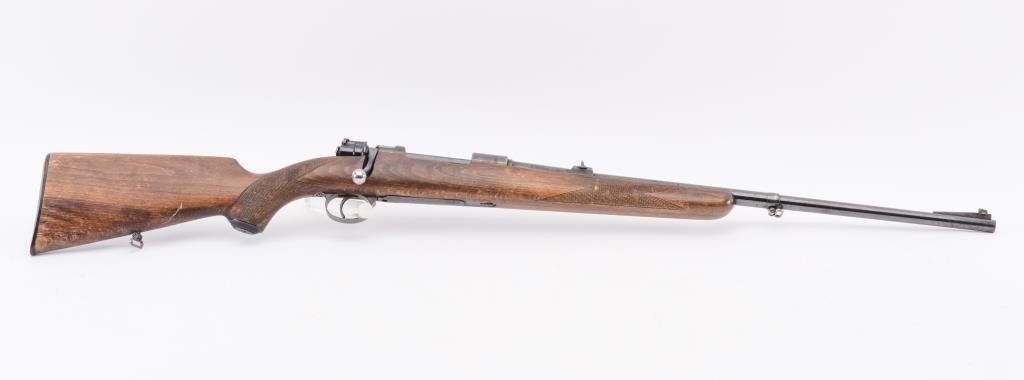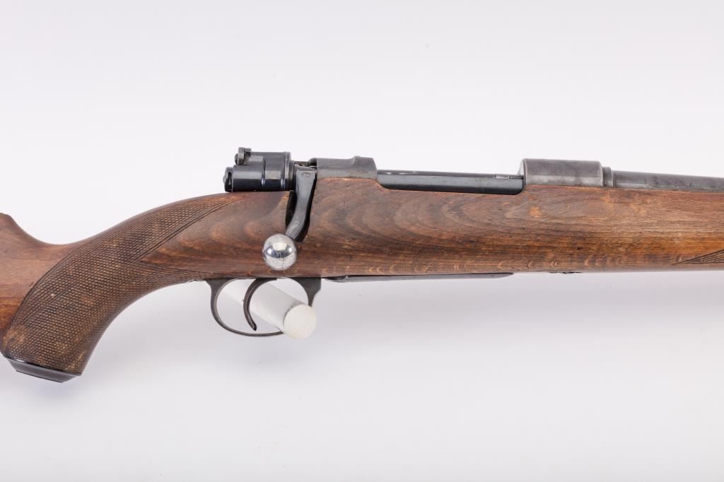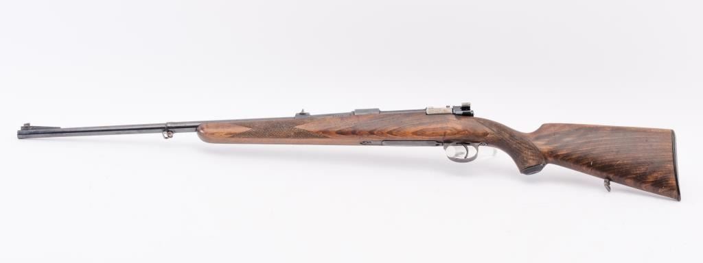 Husqvarna Commercial Model 98 Mauser bolt action sporting rifle, 8 x 57 caliber, Serial #55577. The rifle is in very good overall condition with a 24” import marked barrel with a ramped blade front and standing leafrear sights. The barrel retains the majority of its blue finish with a sling swivel added. The barrel address reads, “HUSQVARNA VAPENFABRIKS A.B. KAL. 8 m.m.” The receiver retains a significant amount of the factoryblue finish with light surface rust on the magazine base and a crisp crest marked, “SWEDEN” on the front ring. The checkered wood stock is in good condition with some flattening of the checkering, small mars anddents. The butt stock retains the sling swivels and ends with a Husqvarna marked plastic butt plate. The bore is good, the action is crisp and the markings are sharp on this Husqvarna. Est.: $350-$700. (C+R).