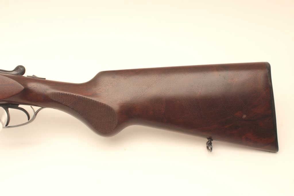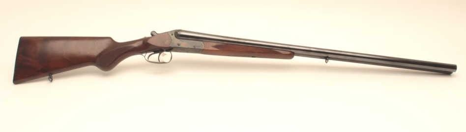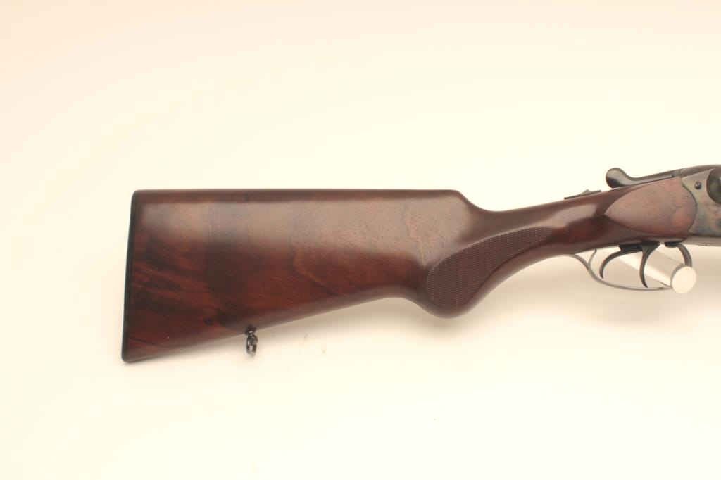 Suhl Germany Post War (GBR) guild gun in 12GA with 28” barrels choked modified right and full left, double triggers, standard extractors, rounded pistol grip European style stock with sling swivels, S/N 879716.Blue and case color finish remain in excellent condition with 98%-99% plus and colors are very brilliant. The stocks are fine to excellent. 2 ¾” chamber and shows very little to almost no use. With Europeanleather carry case. Obtained by an American G.I. in Europe before the wall came down and imported for own use. No import marks. Current replacement for comparable Suhl made gun is $2000-$2500. (Modern) Est.: $500-1000