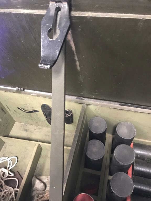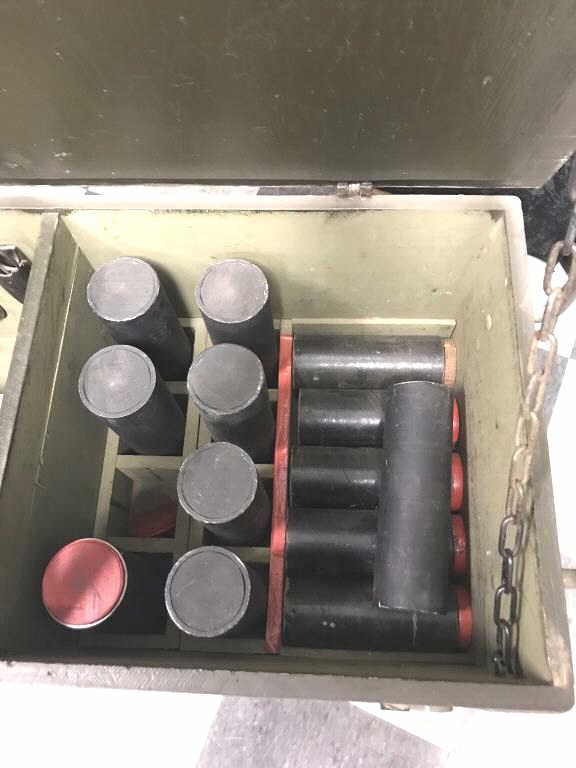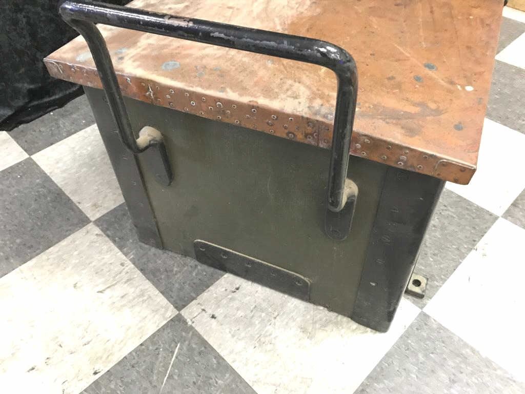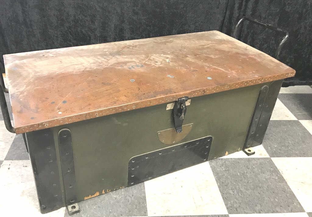 Large Heavy Duty military metal locker, approximately 50” long with metal handles and anchoring straps; 16” in height, 22” deep with contents including 13 empty shell holders and other misc. items. Est.:$200-$300.