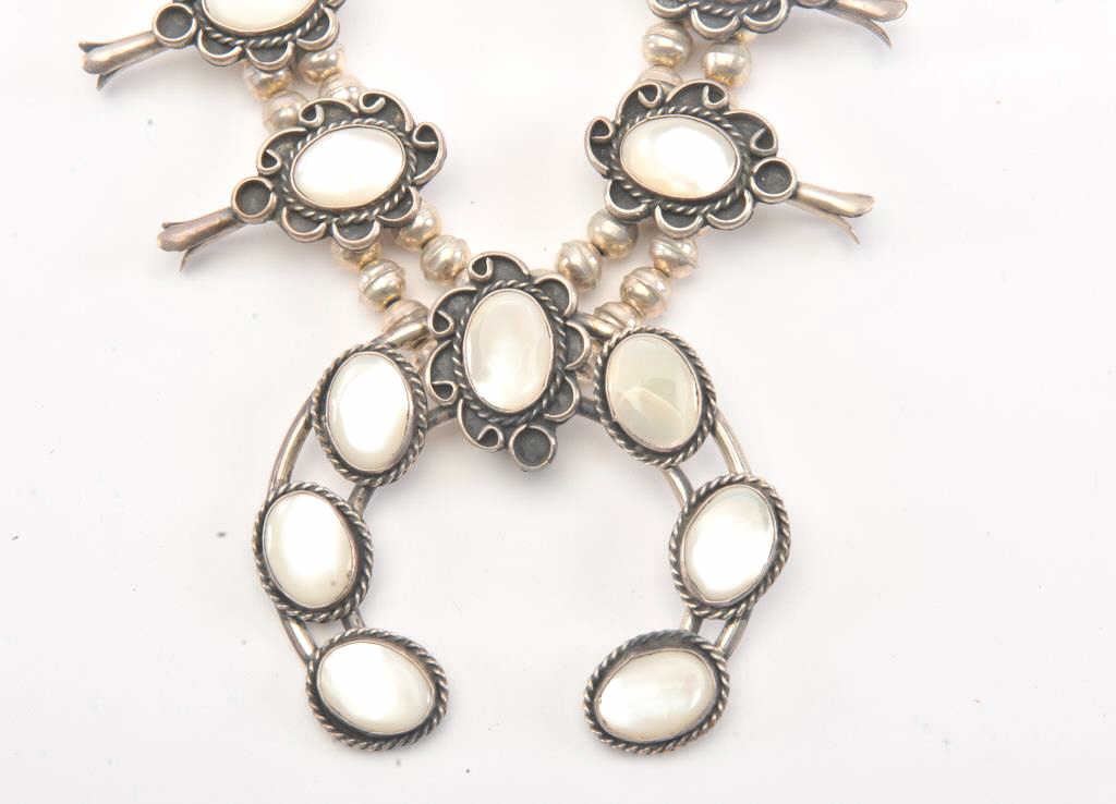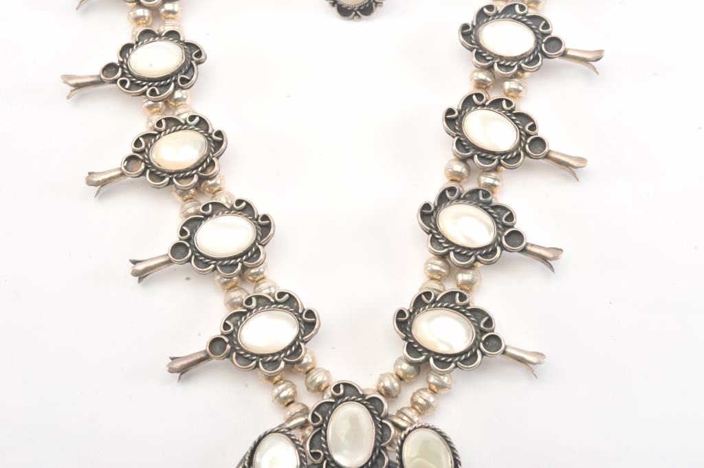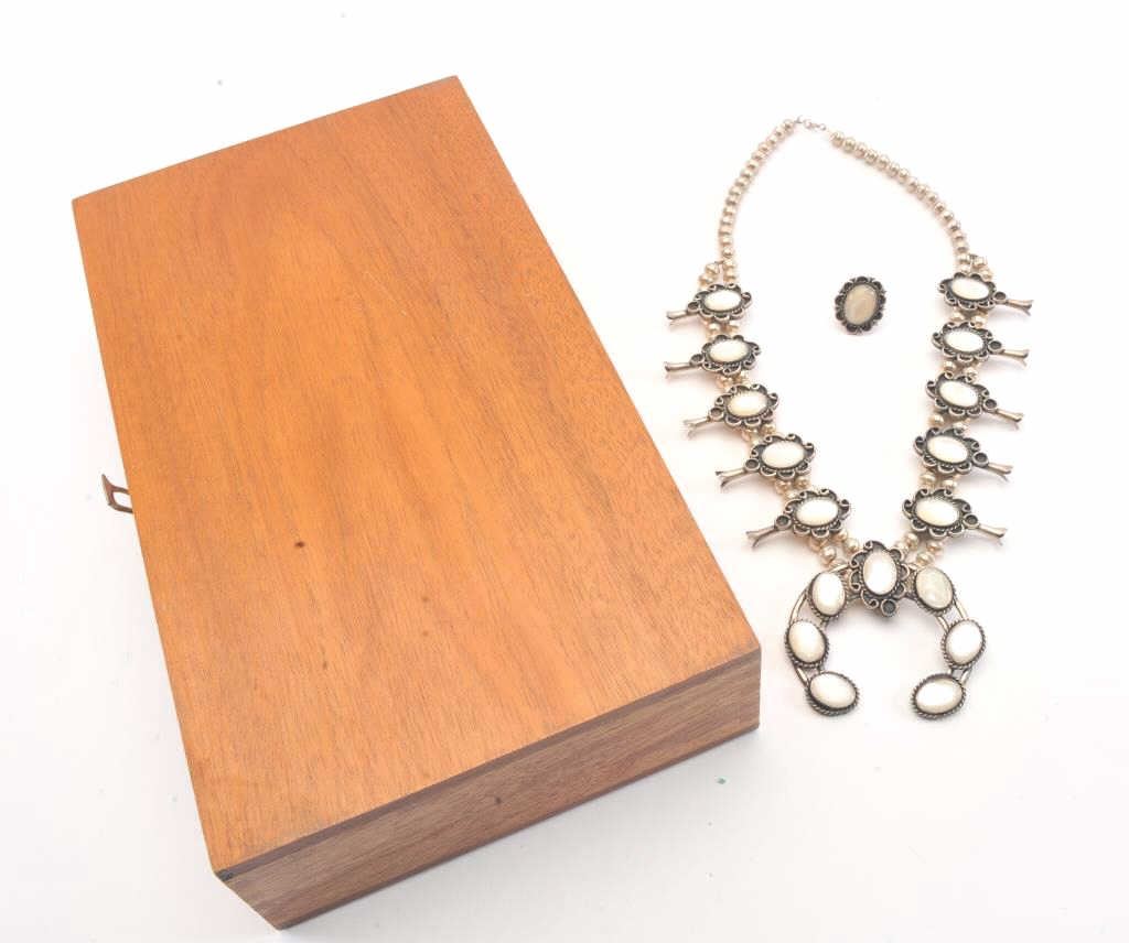 Vintage American Indian silver and pearl squash blossom necklace with matching ring contained in a wood box. Beautifully accomplished! Est.: $250-$500.