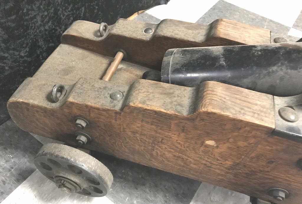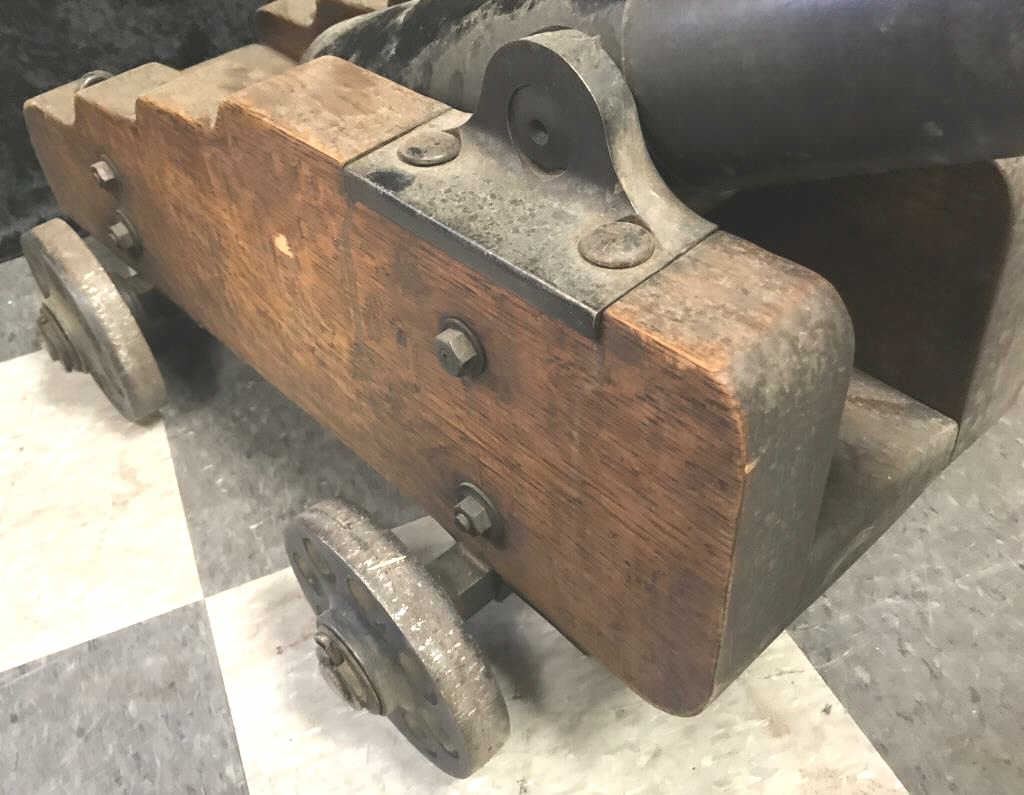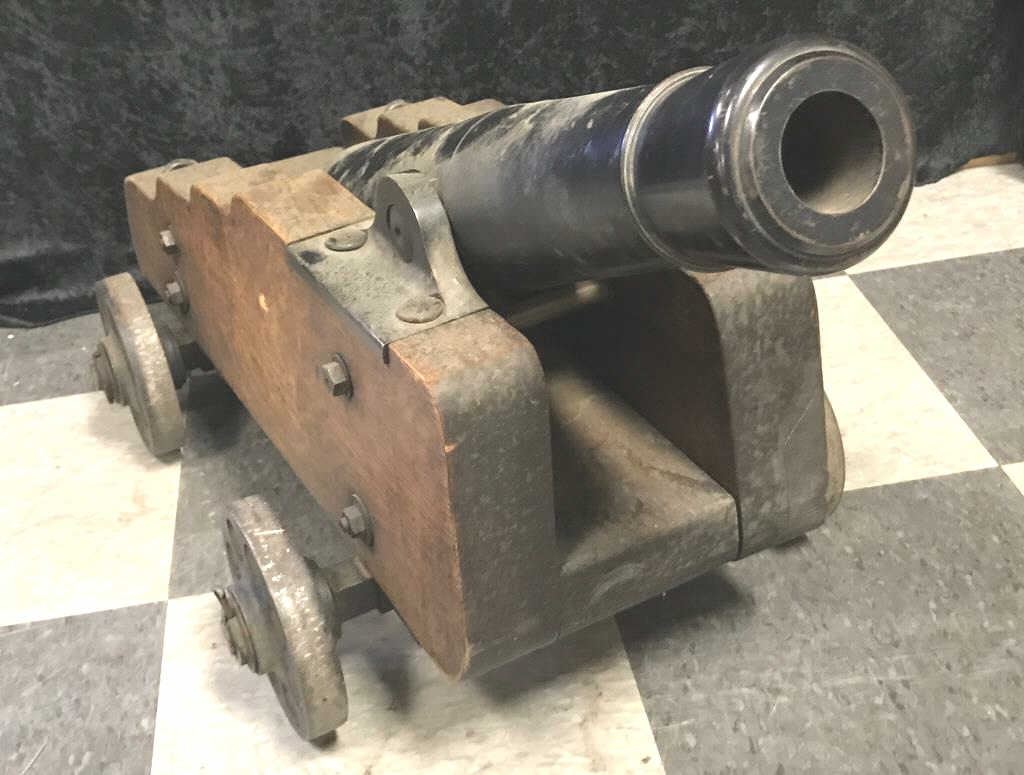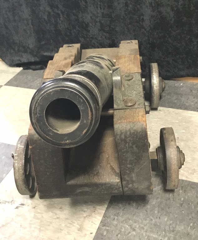 Vintage iron cannon with wood carriage displaying iron wheels; approximately 32” overall with a 24” barrel, 18” in height and 18” wide wheel to wheel. Est.: $300-$600.