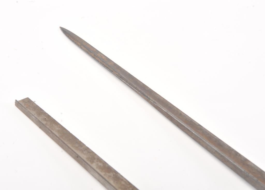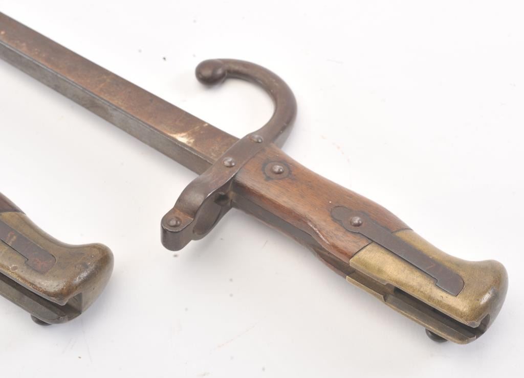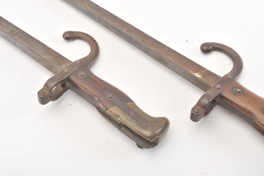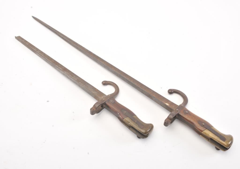 Lot of 2 French Bayonets. 1 broken. No scabbards. The full length one marked by St. Etienne Arsenal and dated 1878. 1 good and 1 poor condition. Est.: $40-$80