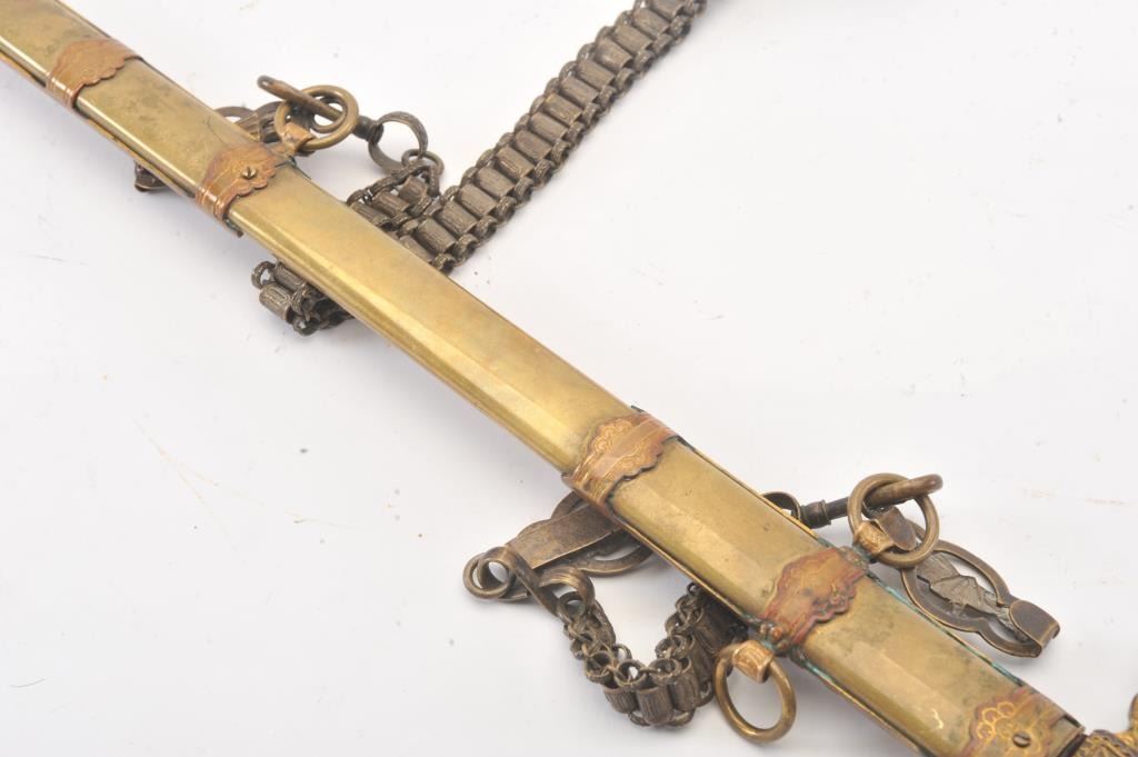 Exceptional and ornate Knights of Columbus fraternal sword with fancy gilt over cast brass decoration in knightly scenes with enamel cross and emblems. S.W. Jackson hammered into brass in block letters. Alsoetched on the blade. Manufactured by Henderson Ames Co. Kalamazoo, Mich. At about turn of the century. The condition is very good plus with uncleaned patina. Est.: $125-$250++