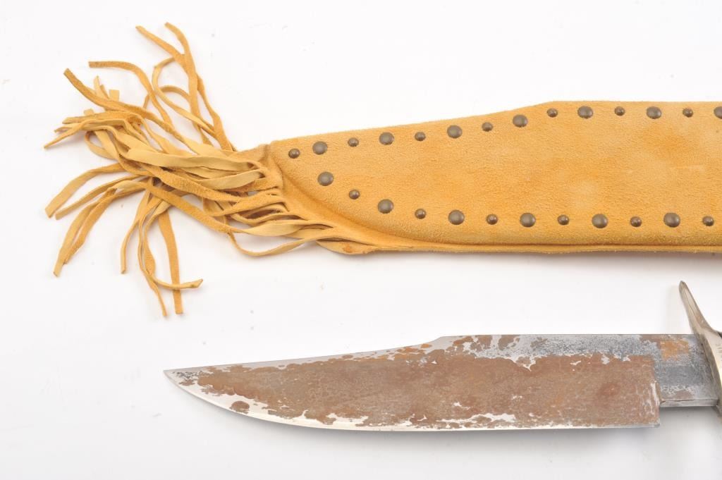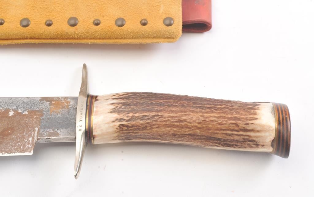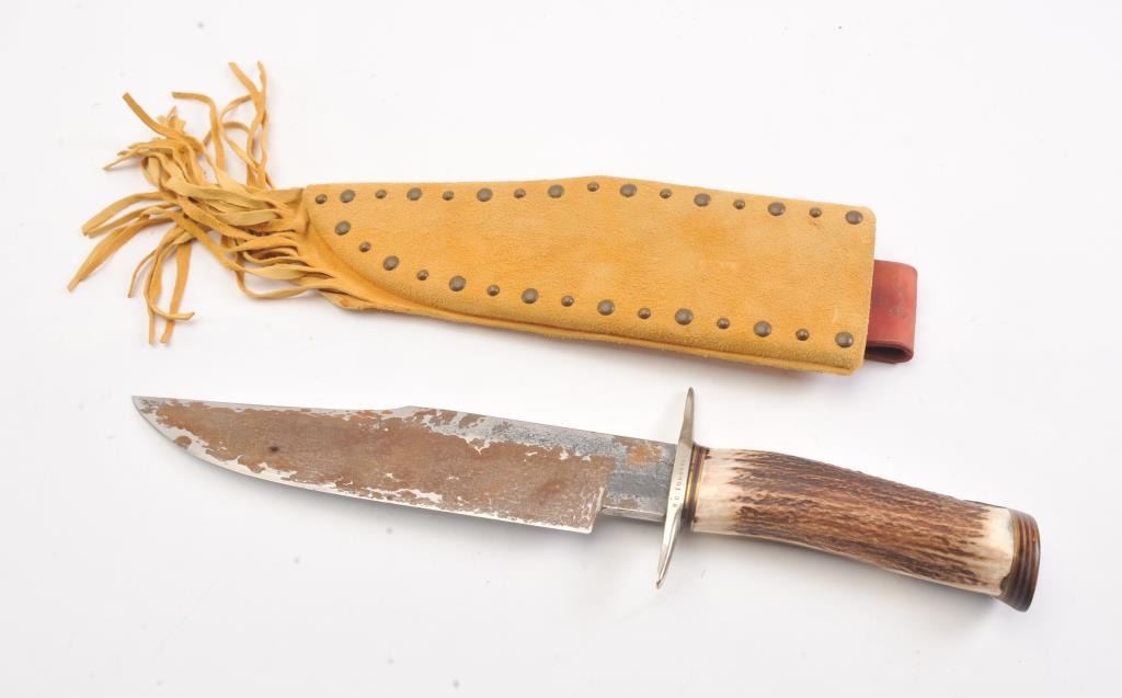 1960s-70s handmade Bowie signed “K.C. Tohannie” on the guard with stag grip and nice spacers and fringed scabbard. Clip point classic blade measures 10” and 15 ½” overall. The blade is very rusty from thescabbard. American Native maker. Est.: $175-$350