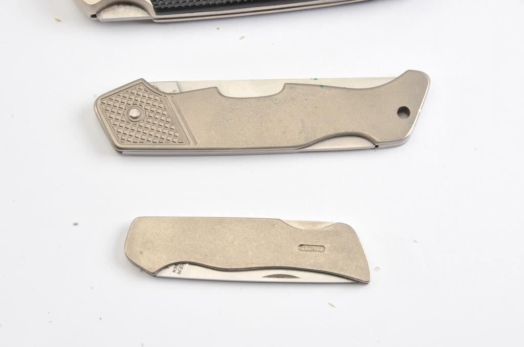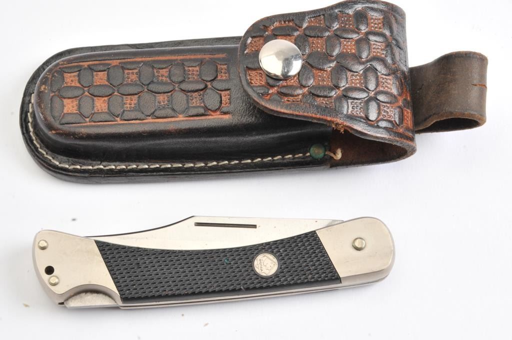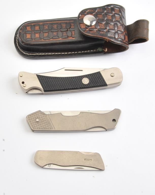 Lot of good folding knives as described: Puma stainless with a 3 7/8” blade in very good used condition. Boker titanium Solingen with 3 1/8” blade in near fine condition with slight sharpening. Smaller Boker stainlessSolingen with 2 ½” blade. Near fine. Est.: $200-$400