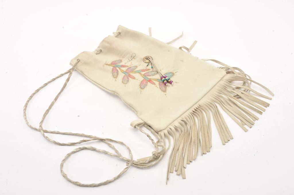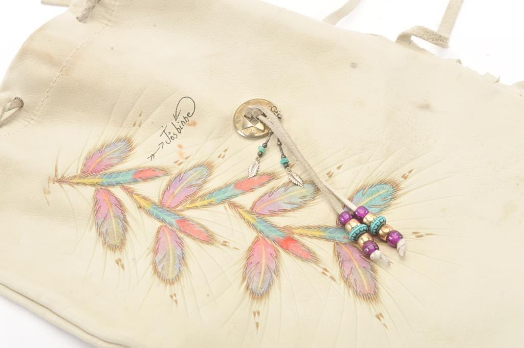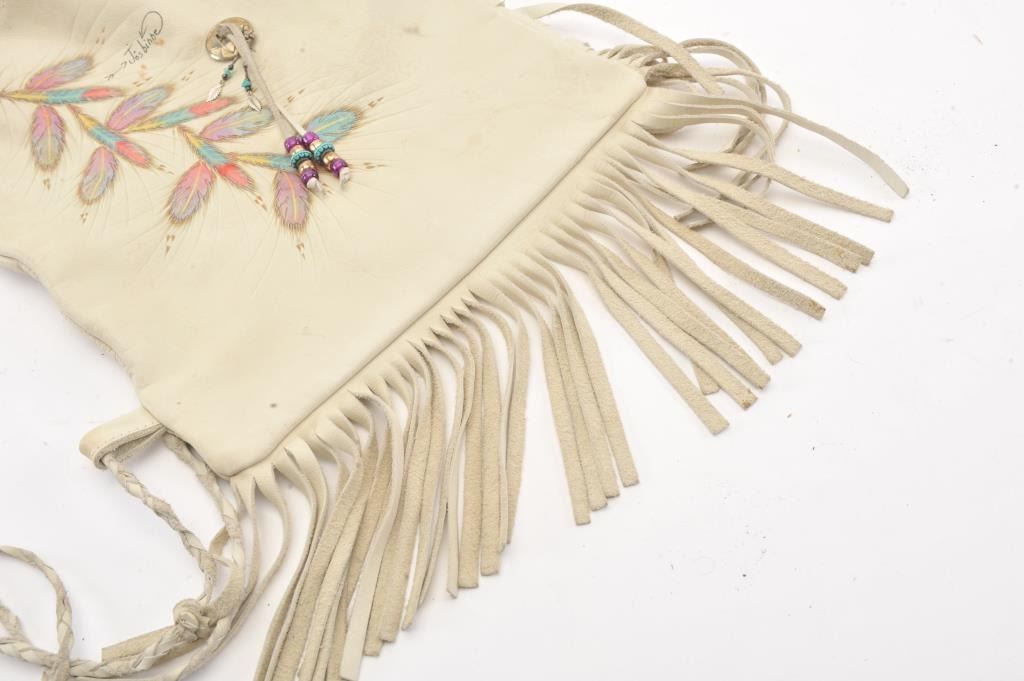 1970s handmade and decorated shoulder bag with fringe from elk hide signed “Jos. Bihhe” with slight staining and use. Very good condition. Est.: $75-$150