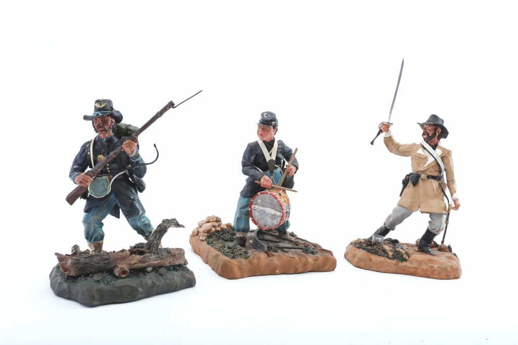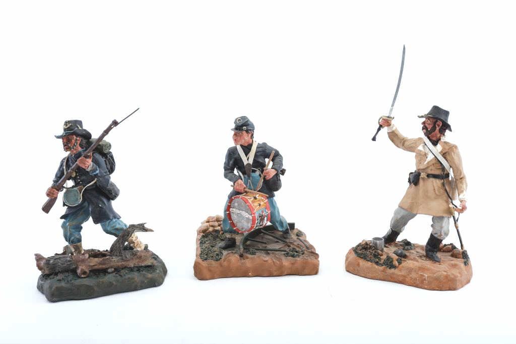 Lot of 3 Civil war soldier figures; Confederate Officer with sabre drawn, approx. 9" tall, Union infantryman with musket in marching order, approx 8 1/2" tall, and Union drummer boy with regimental drum, approx. 8" tall. All 3 have detailed bases. Est. $100-200