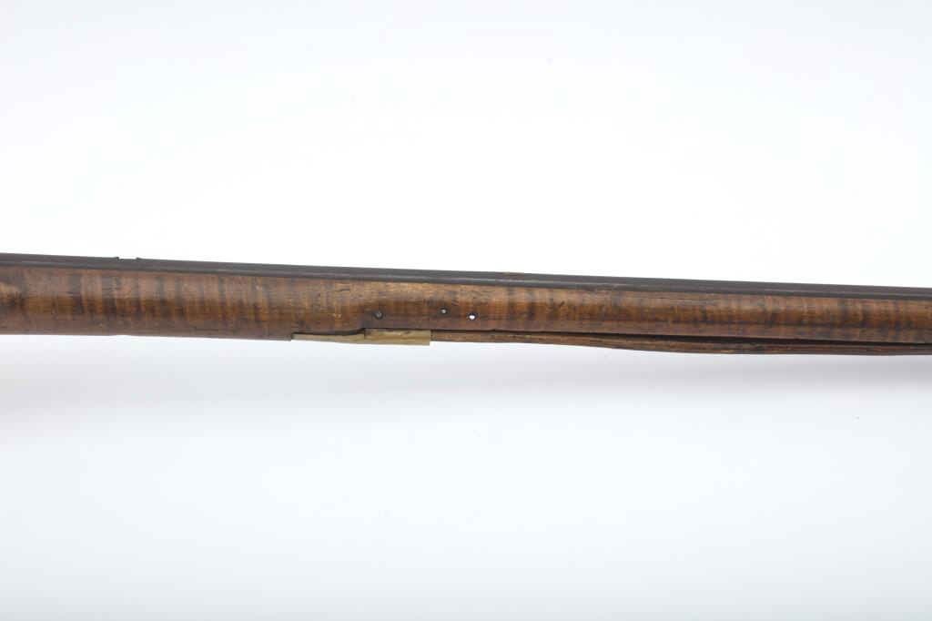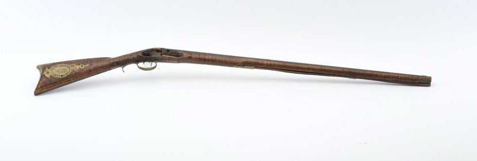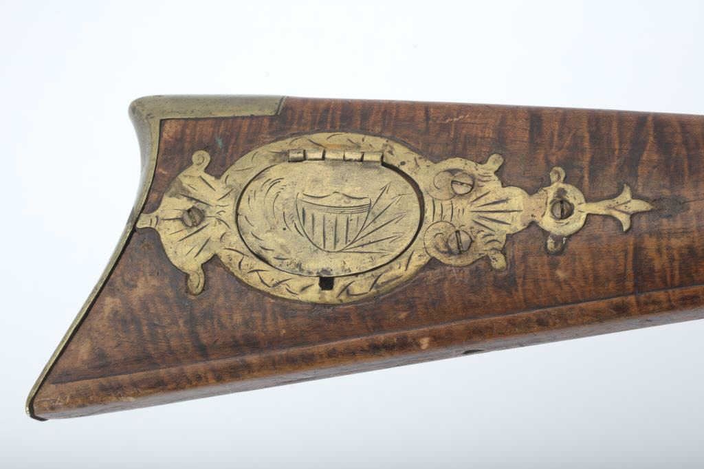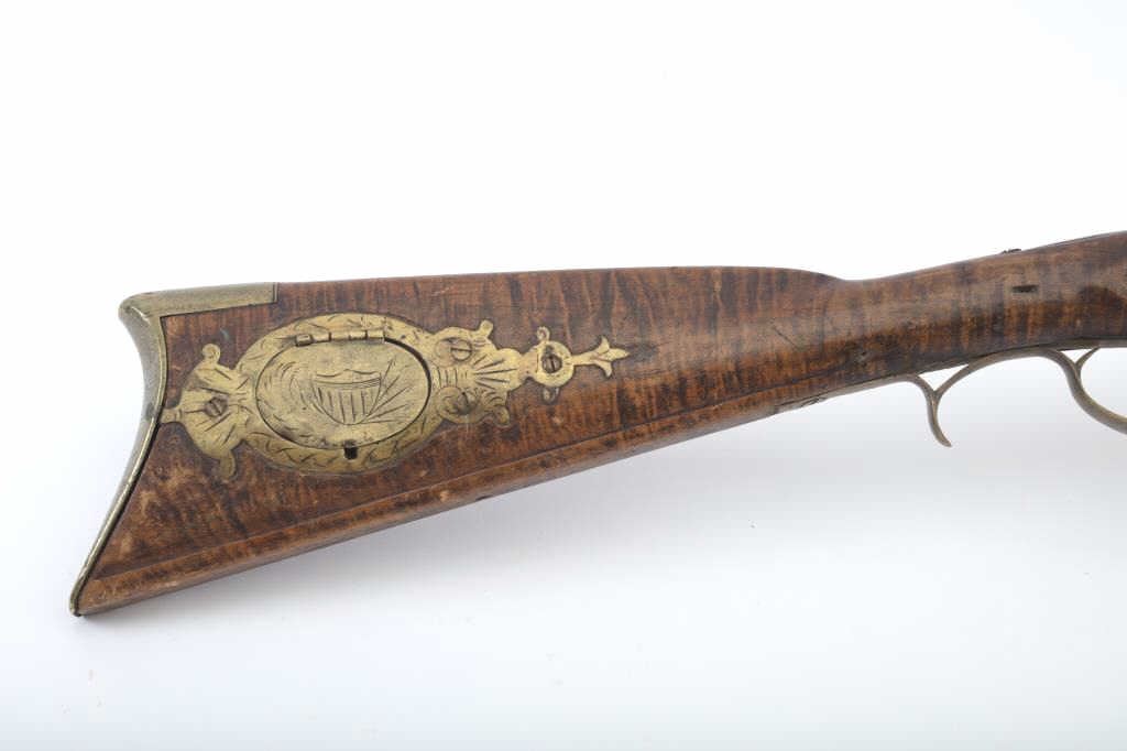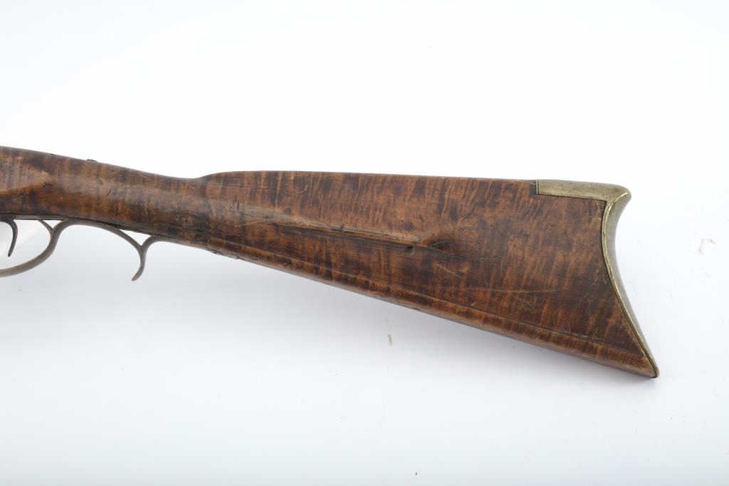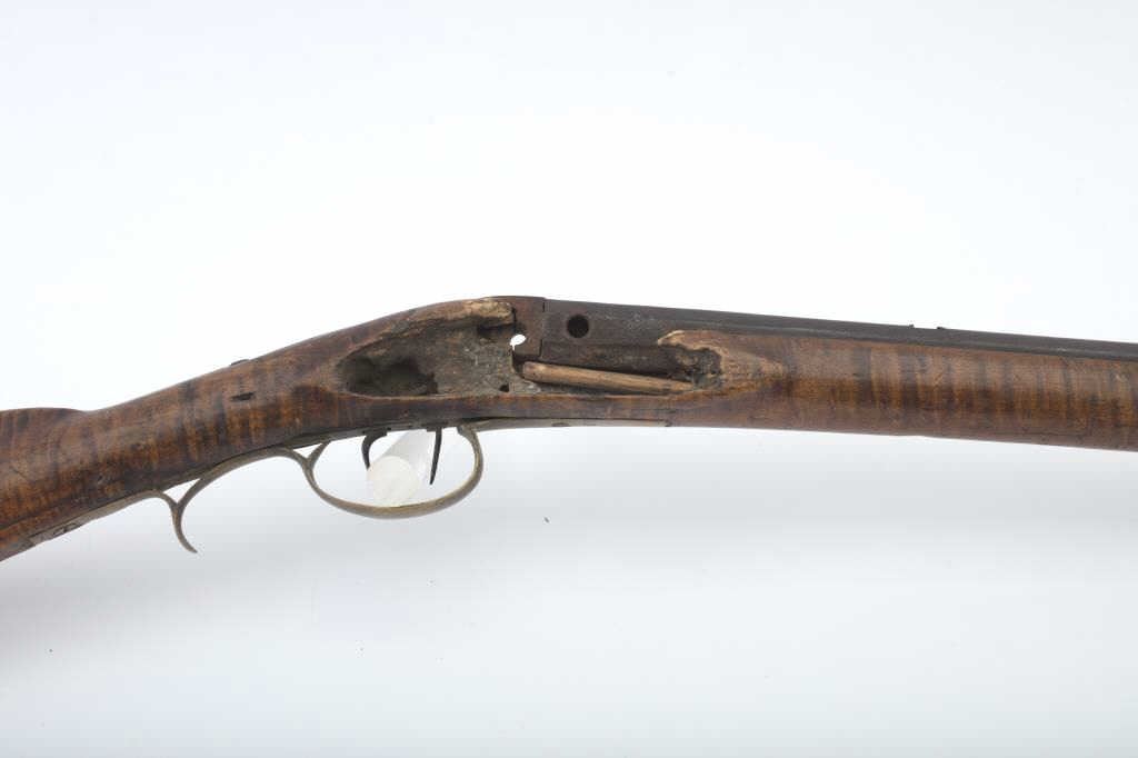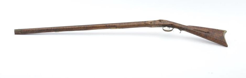 Relic full stock transition Kentucky to plains rifle missing lock and signed in script on the barrel “M.B.” with fancy engraved patch box with shield engraved at the center. Measures 51” overall with 35”medium weight barrel of .40 caliber rifled. The screw holes have been significantly enlarged that held the lock. The stock shows wear around the lock plate area. The triggers work. The patch box release is missing. Thewood shows nice striping and fairly thick butt. The sight was repositioned on the barrel and now missing. Found in Northern California by early collector. A restoration project. (Antique) Est.: $250-$500