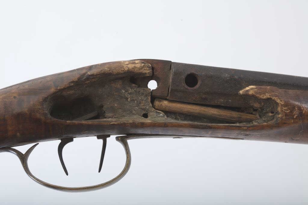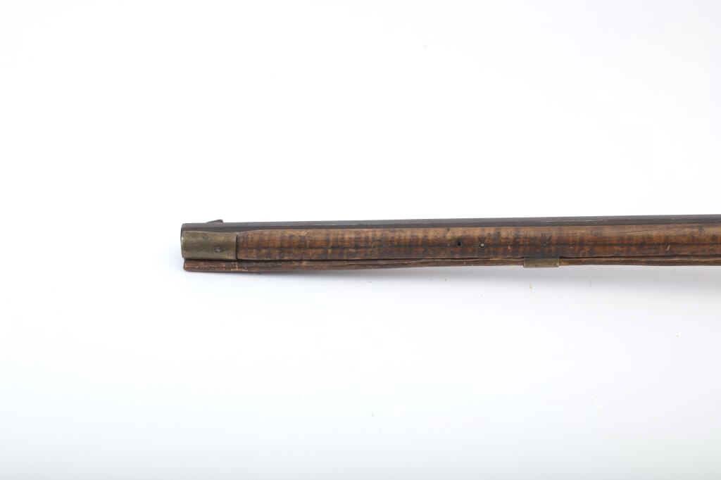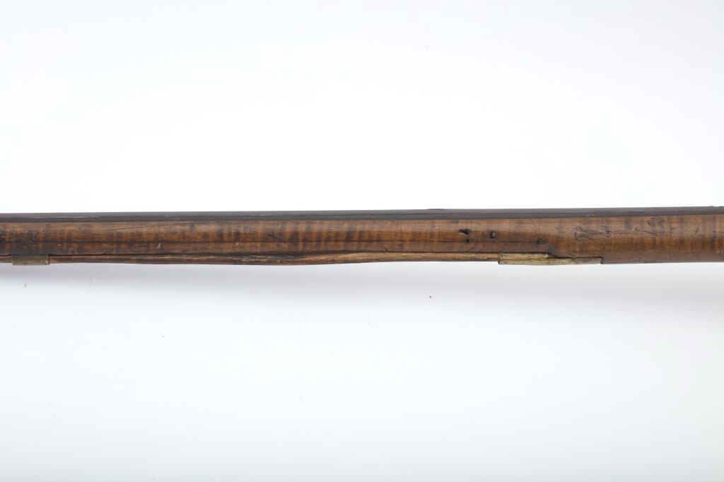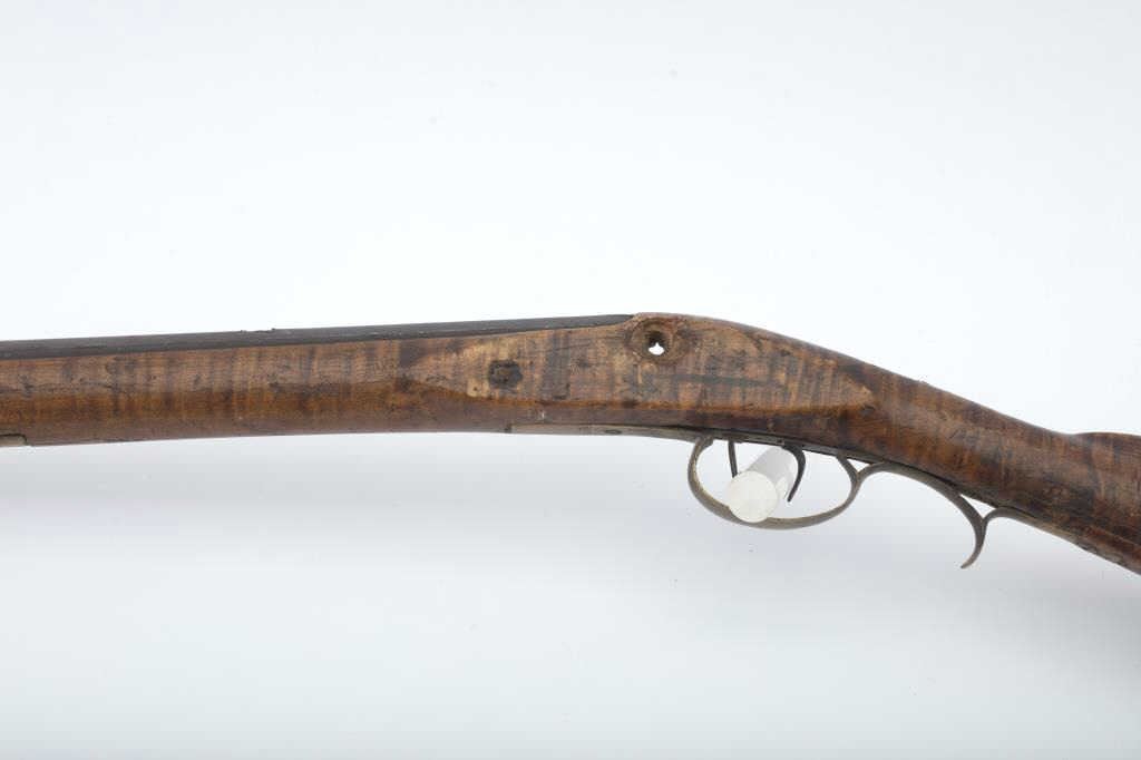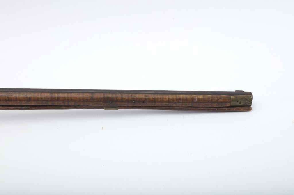 Relic full stock transition Kentucky to plains rifle missing lock and signed in script on the barrel “M.B.” with fancy engraved patch box with shield engraved at the center. Measures 51” overall with 35”medium weight barrel of .40 caliber rifled. The screw holes have been significantly enlarged that held the lock. The stock shows wear around the lock plate area. The triggers work. The patch box release is missing. Thewood shows nice striping and fairly thick butt. The sight was repositioned on the barrel and now missing. Found in Northern California by early collector. A restoration project. (Antique) Est.: $250-$500